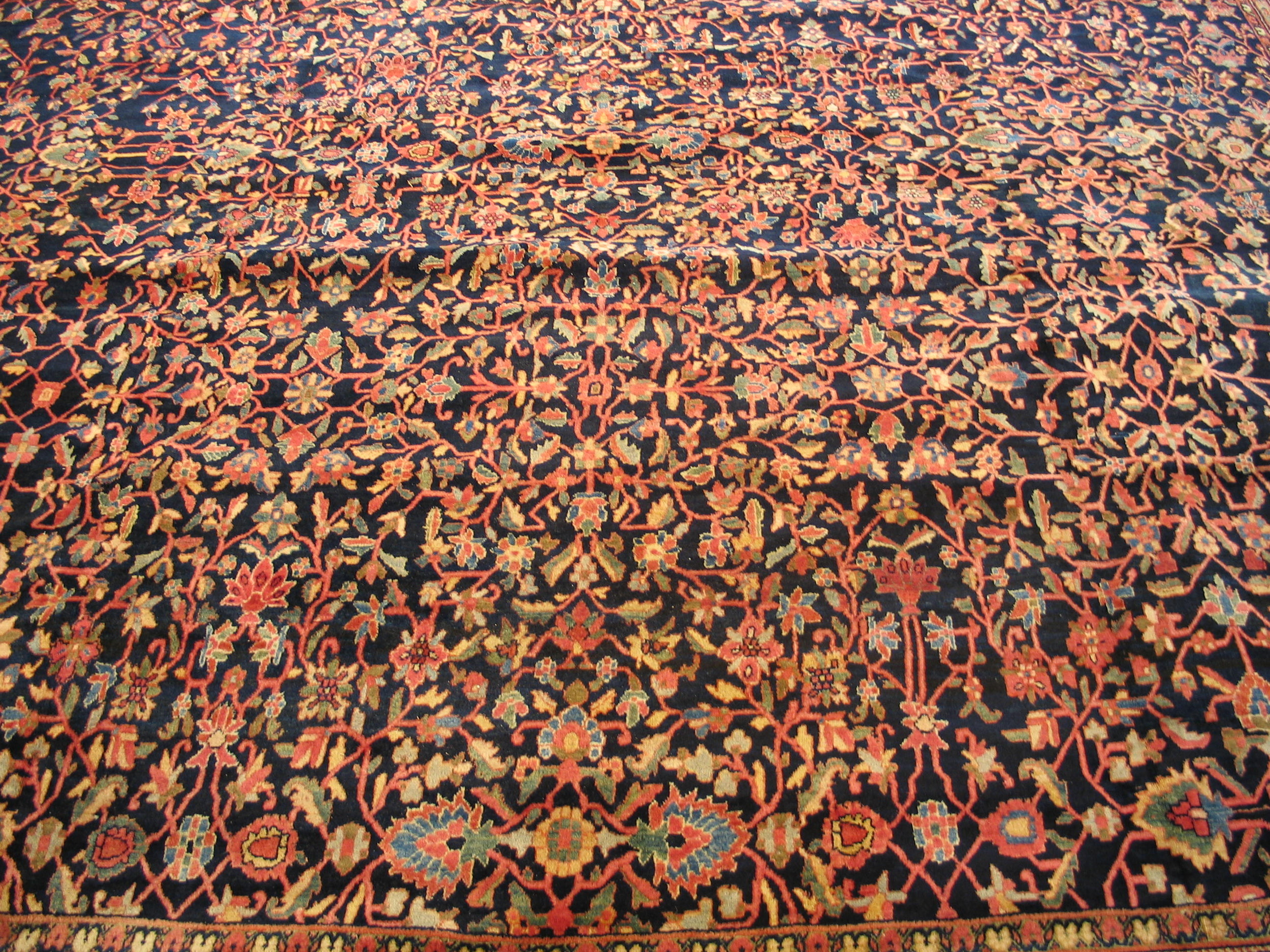 The design employs a highly detailed, dense floral arrangement, characteristic of the allover rugs style. Rather than relying on a central medallion, the entire field is covered in a meandering vine system, featuring stylized palmettes, rosettes, and delicate flowering shrubs. This continuous flow of pattern ensures visual interest across the entire surface, reflecting the weaver’s masterful control over complex composition.