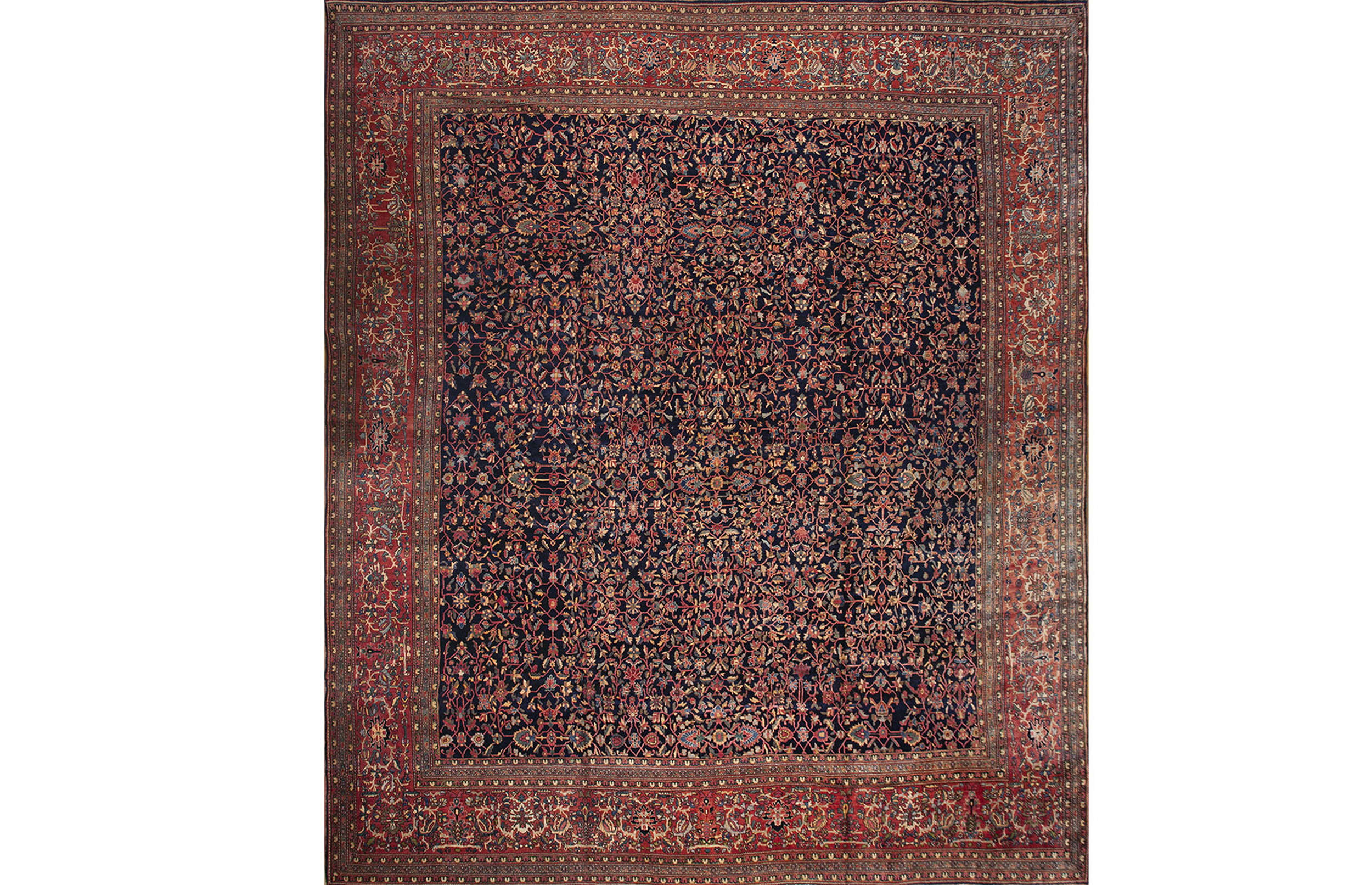 Antique Large Sarouk – Farahan Persian Knotted Rug, Circa Date: 1880s. This exceptional example of 19th-century Persian weaving originates from the Arak region, renowned for producing some of the most sought-after antique rugs of the Qajar dynasty. The Farahan subgroup is particularly prized for its meticulous knotting and sophisticated use of natural dyes, distinguishing it from later commercial productions.