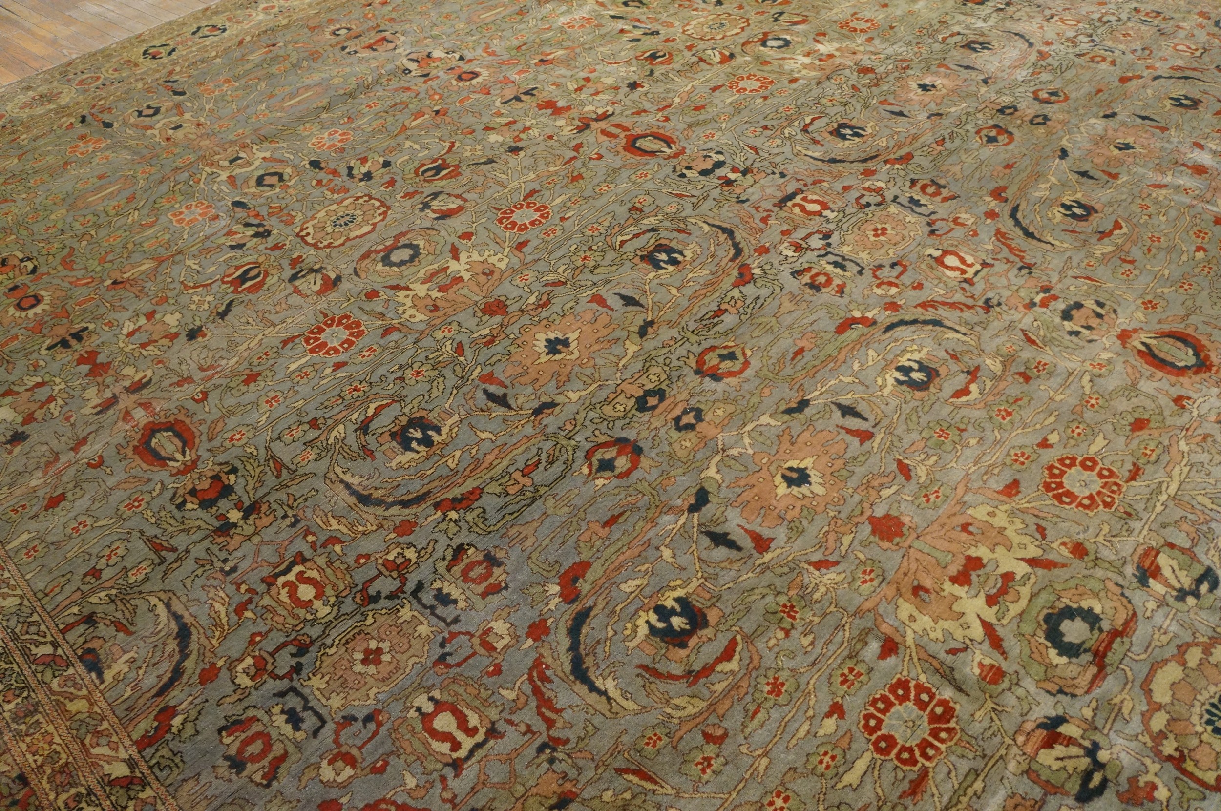 The field presents a captivating allover design, where highly stylized palmettes and intricate vinery are rendered in a sophisticated, muted palette. The dominant tone is a soft, faded sage that places it firmly within the category of gray color rugs, providing a tranquil backdrop for the accents of terracotta, faded rose, and deep navy blue. This subtle coloration allows the complex pattern to emerge with grace without overwhelming the space.