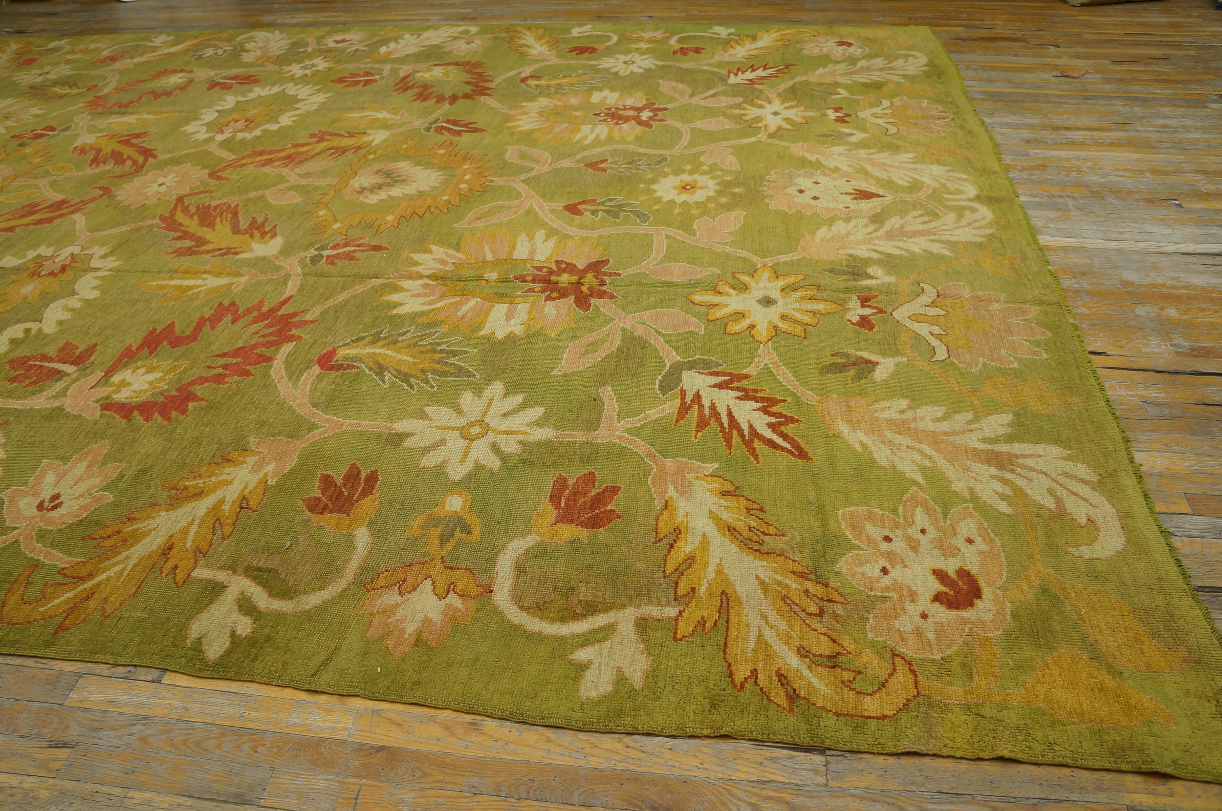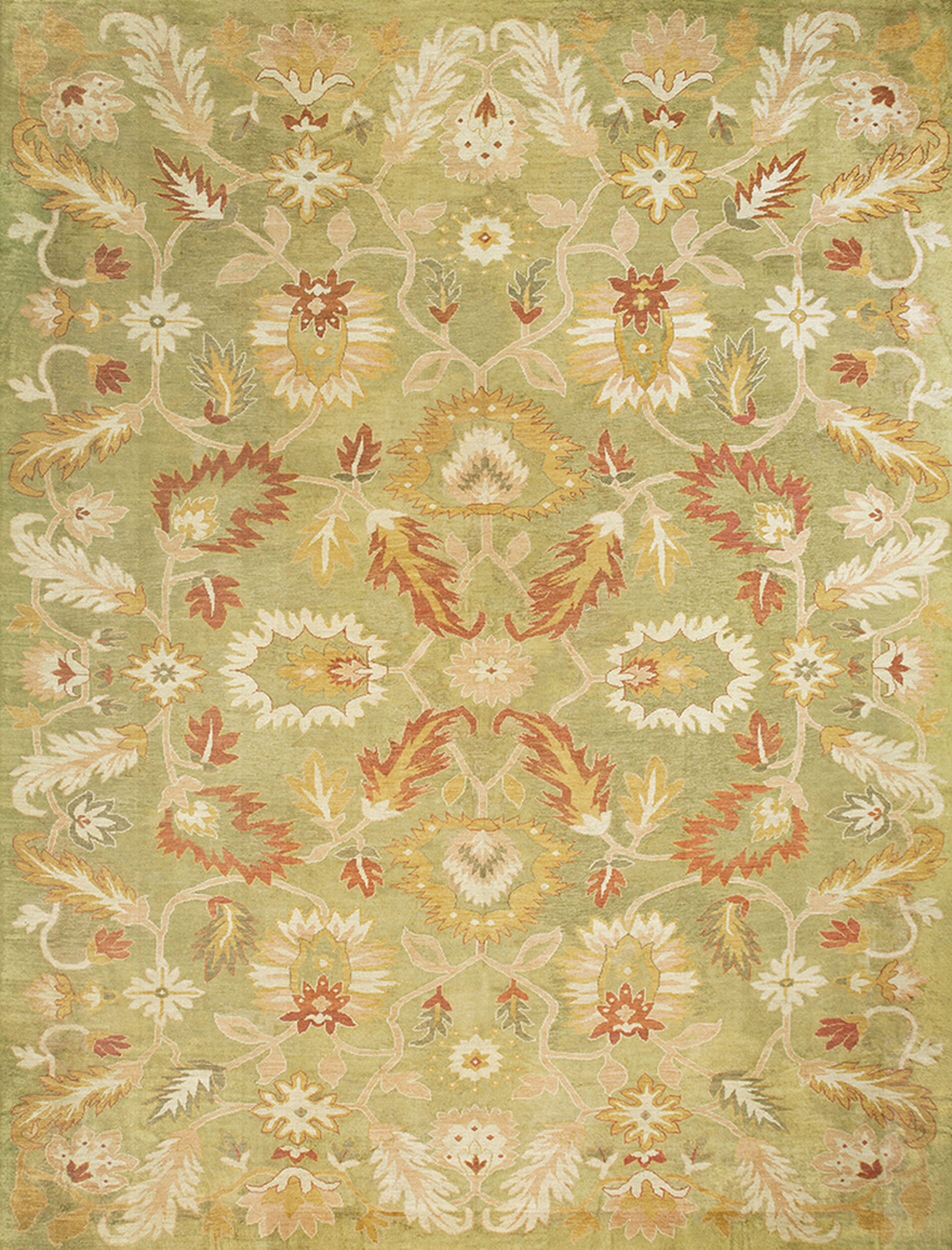 The primary field color is a muted, mossy shade, placing this piece among the most desirable green color rugs of the period. This highly sophisticated palette is accented by terracotta, pale gold, and ivory blossoms, which are dispersed evenly across the entire surface in a classic allover rugs design, ensuring visual continuity and balance in any setting.
