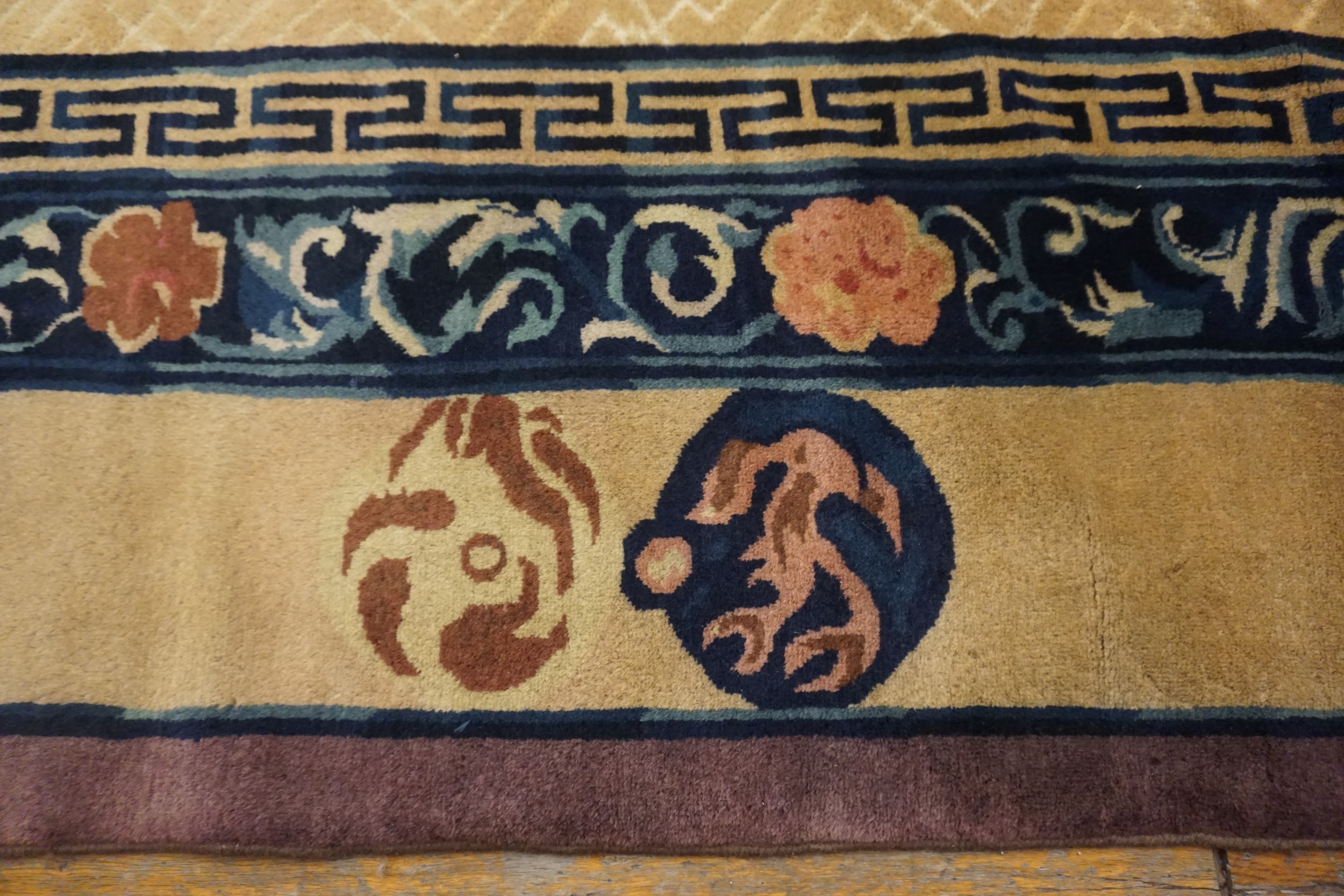 Dominating the composition are five large, circular medallions, centrally anchored by the largest example. Each roundel features a pair of stylized dragons rendered in deep navy and black, symbols of power, fortune, and imperial authority. These powerful creatures are dynamically posed, contrasting sharply against the lighter, geometric background, creating focal points that draw the eye across the rug’s surface.