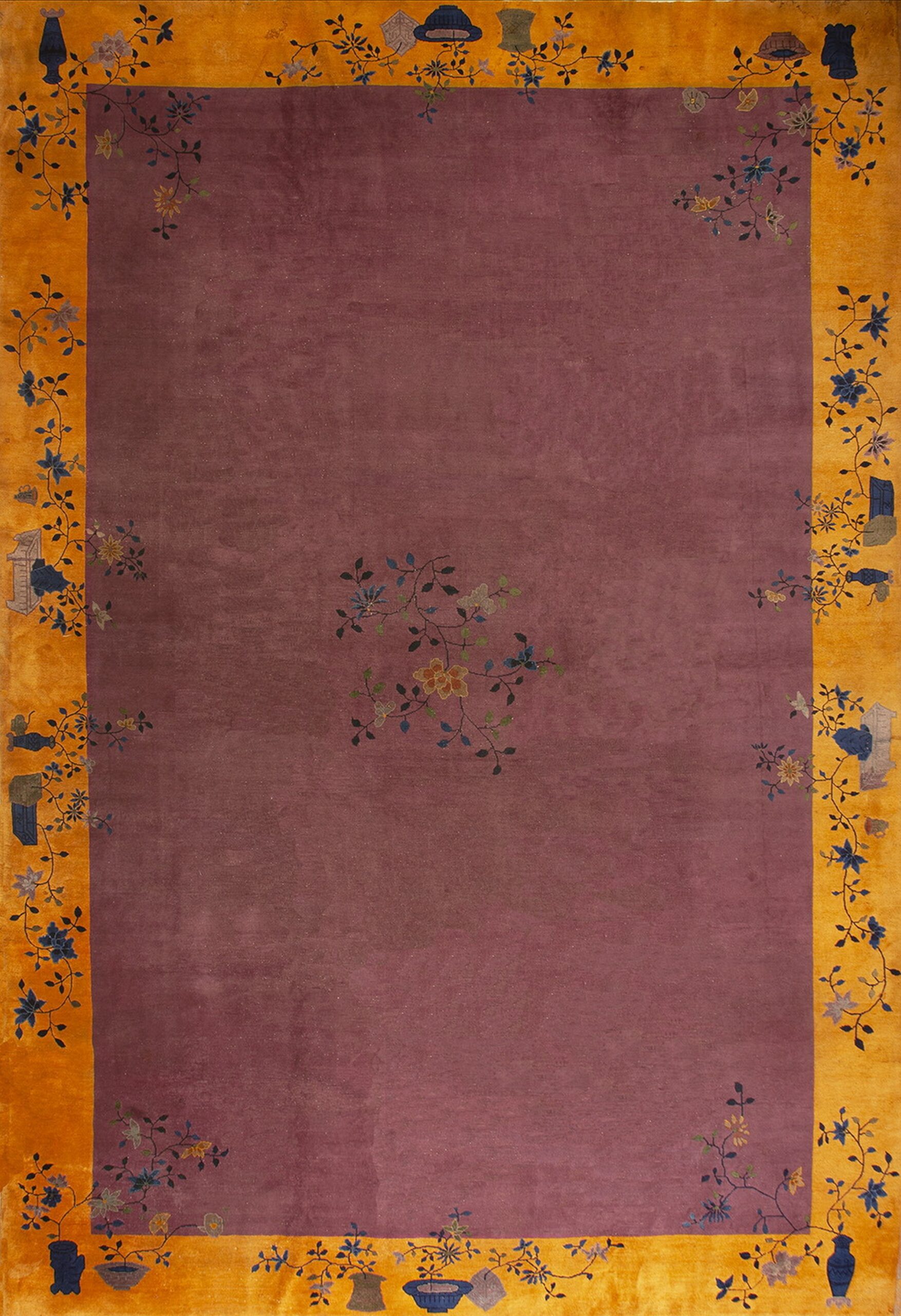 The central field is dominated by a rich, saturated tone—a captivating purple / lavender mauve color that shifts subtly depending on the light. This deep hue provides a striking contrast to the luminous, saffron-gold border, a hallmark of the era’s preference for high-impact, yet balanced, palettes.