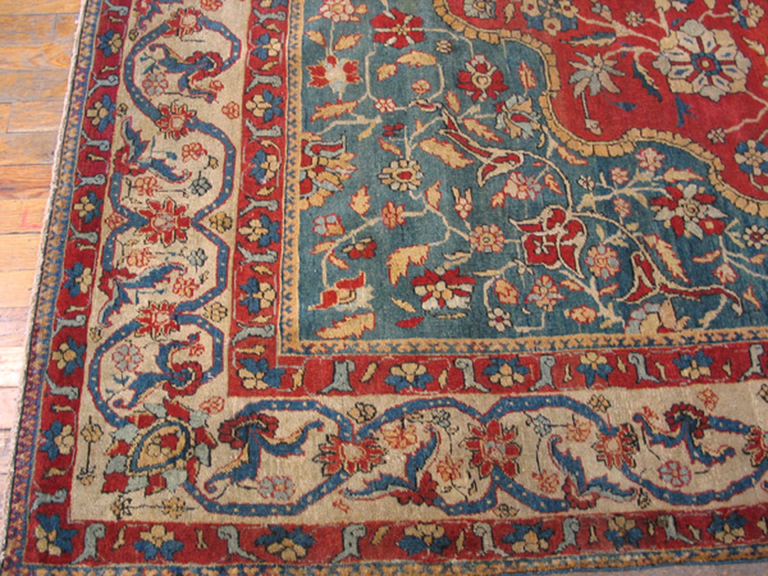 Technically, antique Persian Sarouk rugs of this period are renowned for their “velvety” handle and substantial weight. The fine, tight weave allows for the “razor-sharp” definition of the floral patterns, creating a painterly effect that mimics the detail of a Persian miniature. The field is framed by a stately primary border—likely featuring the classic “Herati” or “Samovar” pattern—which provides a sense of architectural permanence and anchors the exuberant energy of the central medallion. To possess a late 19th-century Sarouk of this caliber is to hold a monument to the peak of Persian textile engineering; it is a work that bridges the gap between the rugged durability of a village rug and the courtly elegance of the great city looms.