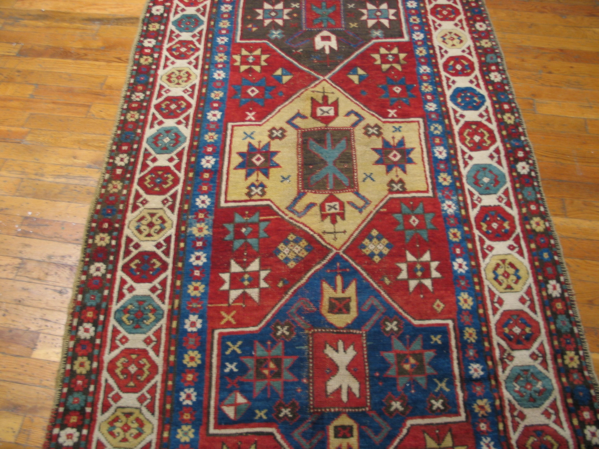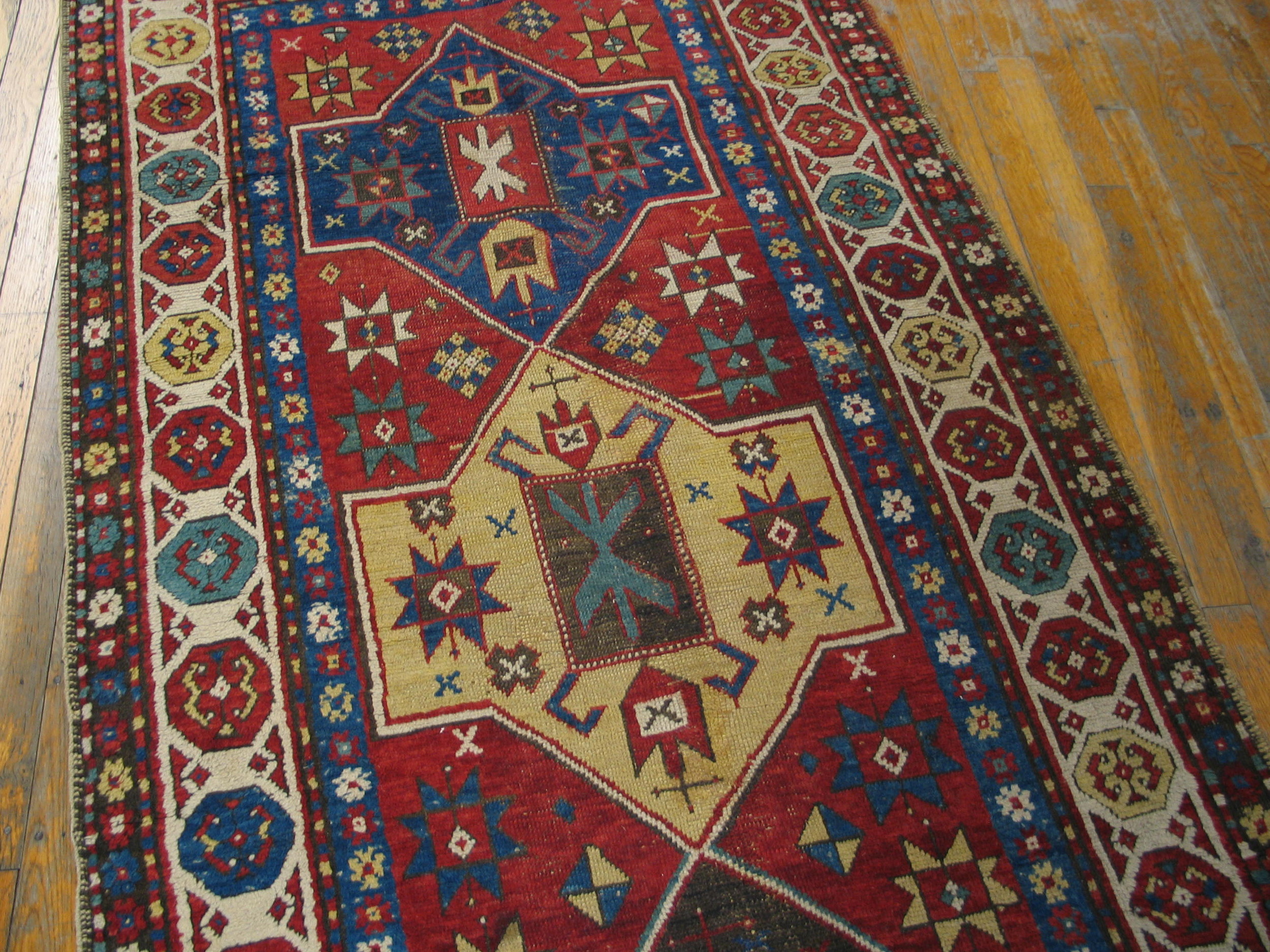 Antique Caucasian Coral 1890s Rug, Circa Date: 1890s. This exceptional example of Caucasian weaving captures the robust geometric artistry characteristic of the late 19th century. The field is dominated by a rich, saturated madder red, providing a powerful backdrop for the complex tribal motifs.