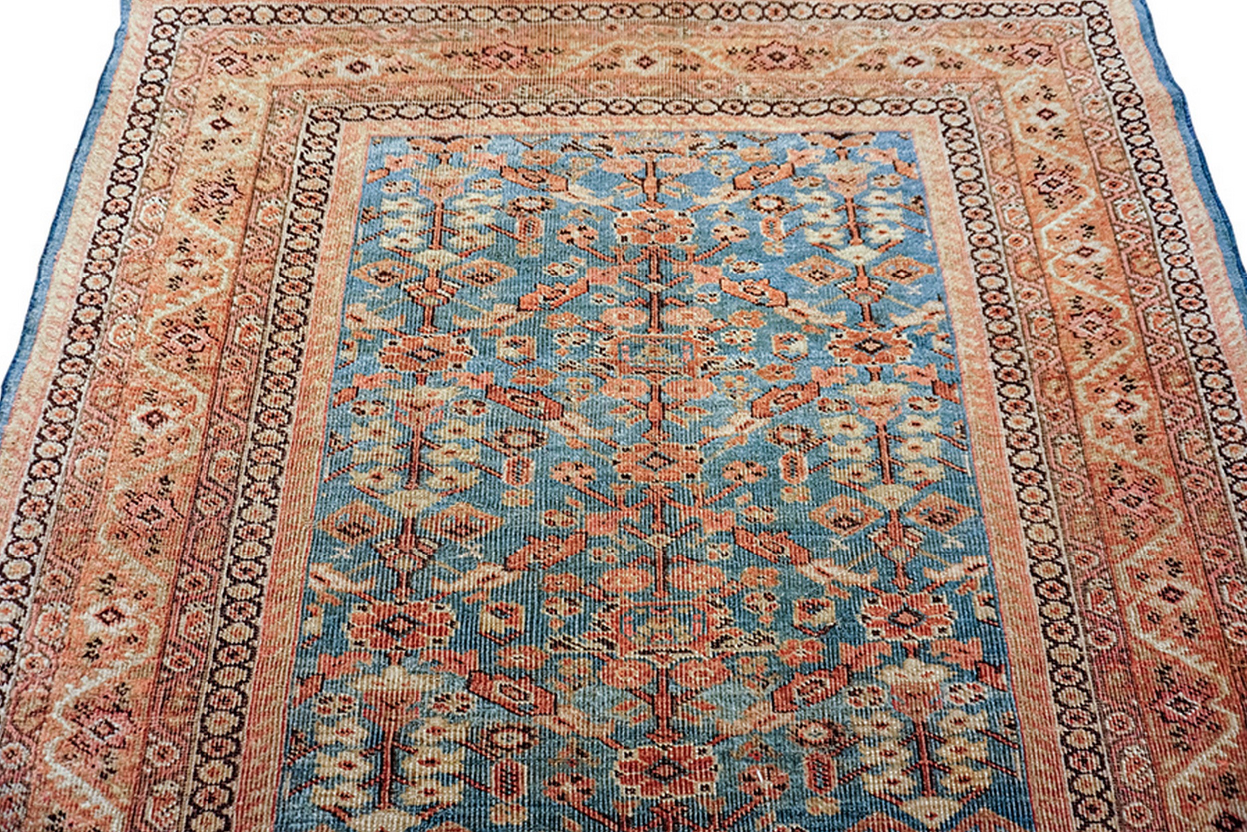 The mesmerizing field utilizes a saturated, oceanic blue, providing a stunning backdrop for the repeating geometric lattice. This specific shade of indigo and teal is highly sought after among collectors of blue color rugs, contrasting beautifully with the warm coral, apricot, and ivory motifs that populate the central design.
