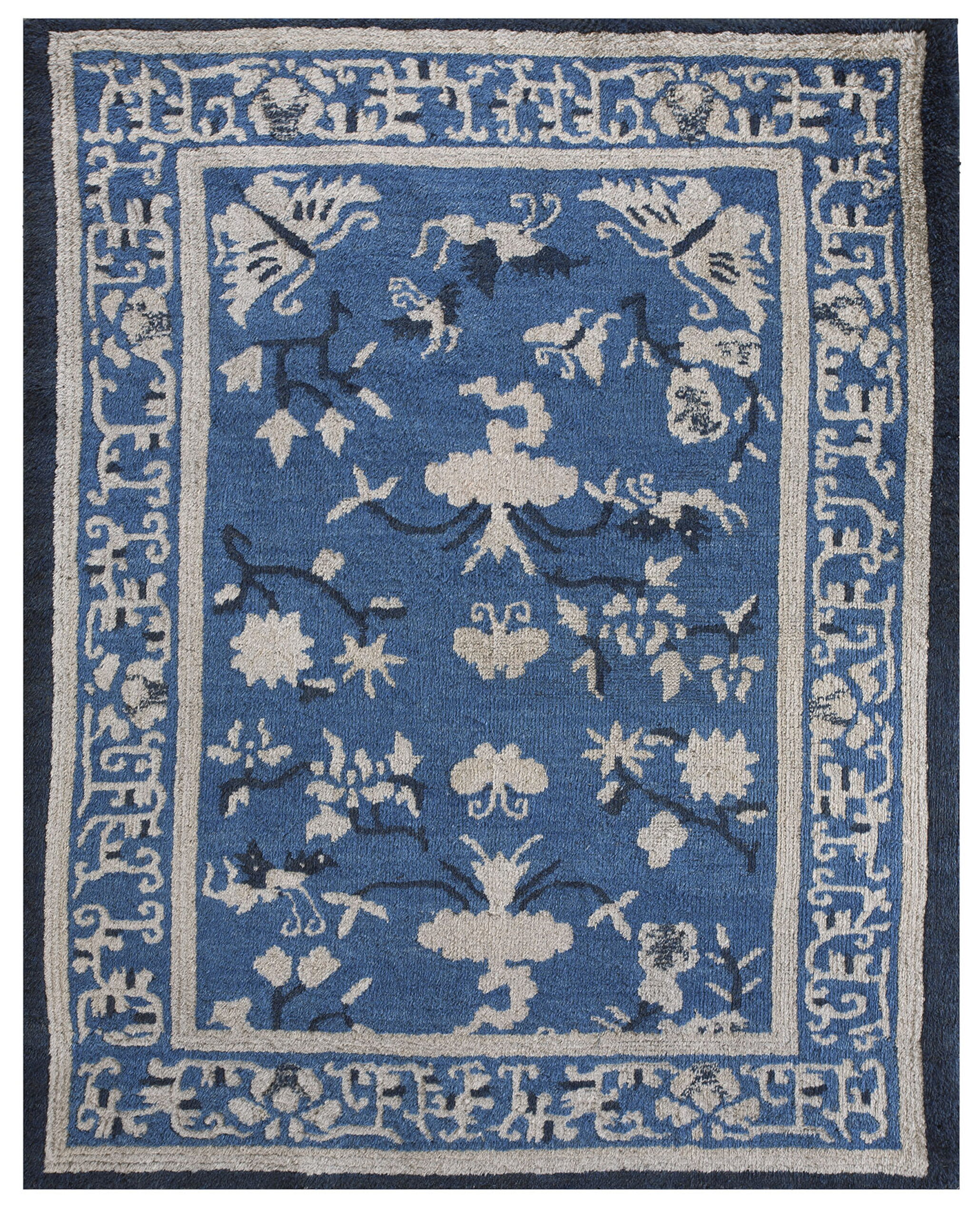 The deep indigo-blue field provides a powerful backdrop for the highly stylized, almost pictorial imagery. The use of this saturated blue color rugs is characteristic of fine 19th-century Chinese weaving, suggesting high-quality natural dyes that have matured beautifully over time, lending the piece an authentic patina.