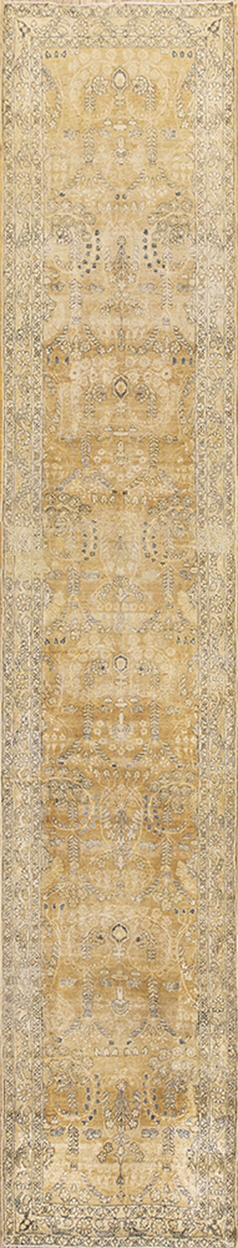 Unlike centralized medallion formats, this Kerman utilizes an intricate allover design where repeating elements flow seamlessly across the entire length of the field. This structure creates visual continuity and movement, making the rug highly adaptable and effective in guiding the eye through a long space.