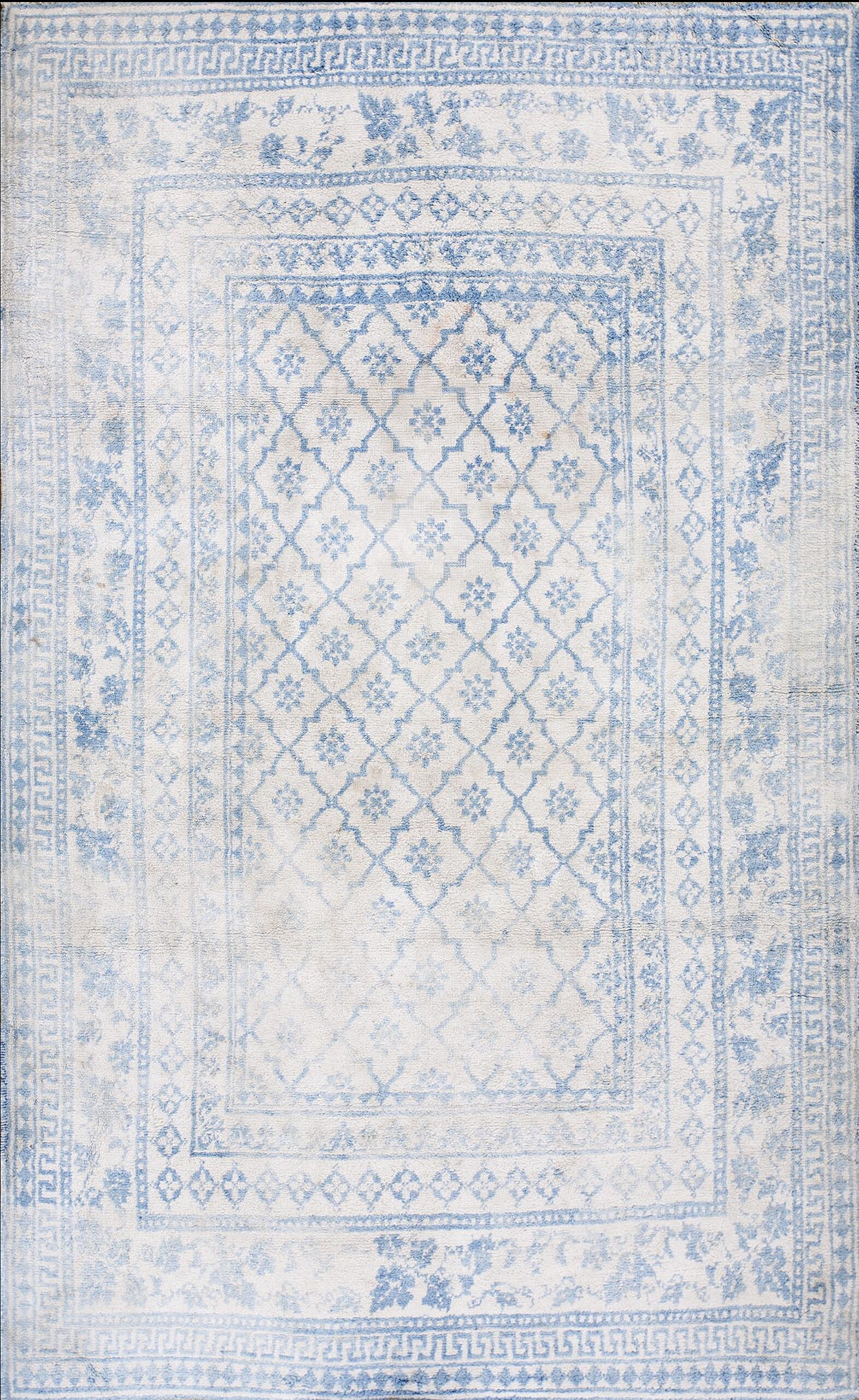 The palette is intentionally muted, featuring a washed powder blue pattern set against a luminous, aged ivory beige cream white color rugs field. This subtle contrast allows the intricate geometric and stylized floral motifs to emerge gently, creating a sense of quiet elegance suitable for both traditional and contemporary interiors.