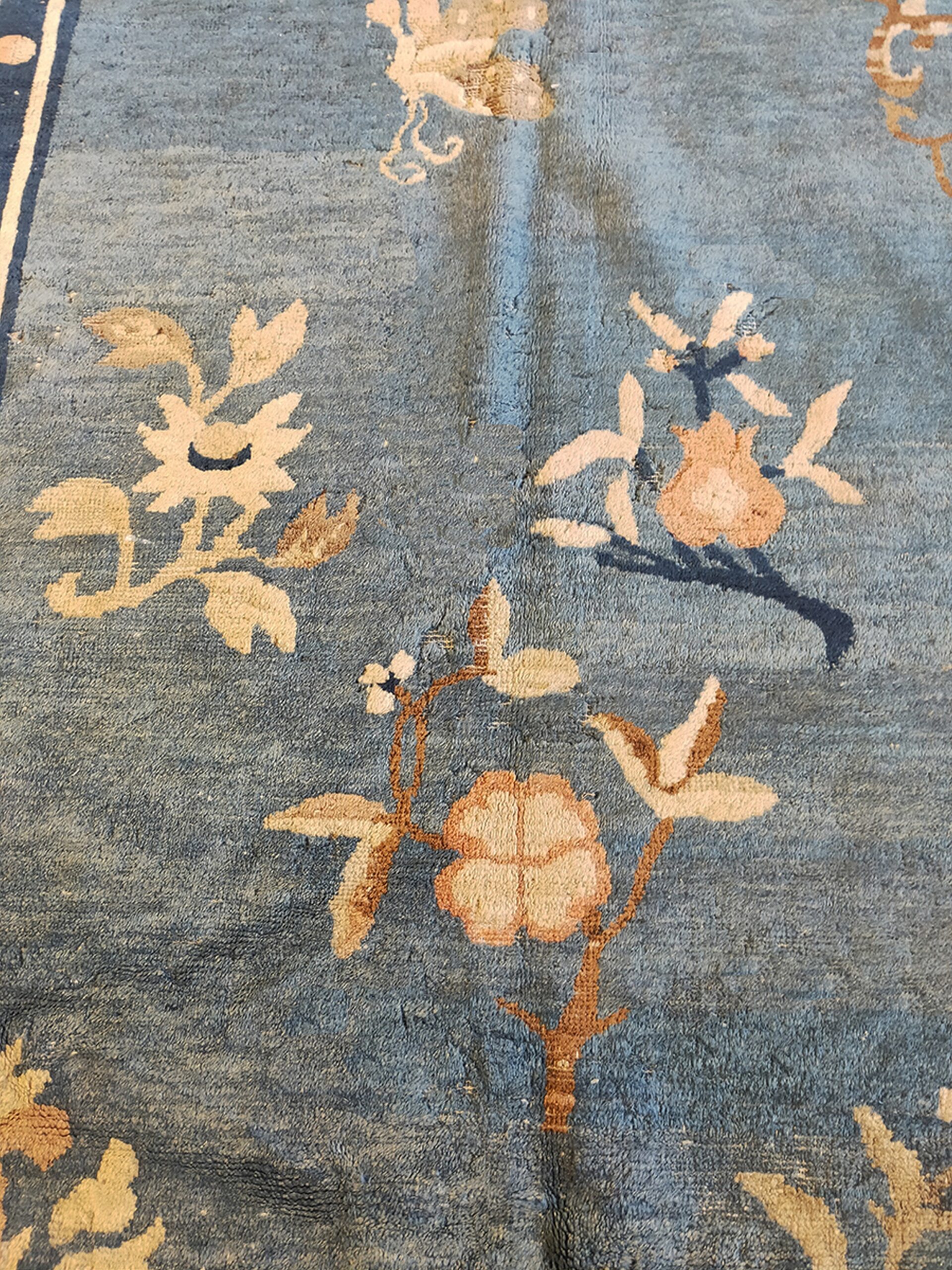 Antique Peking Medallion Chinese Blue 1920s Rug, Circa Date: 1920s. This exquisite Chinese Peking piece captures the sophisticated aesthetic of the early 20th century. The expansive field is rendered in a mesmerizing, soft cerulean, characteristic of the finest blue color rugs from this period. The palette is intentionally restrained, allowing the texture and subtle design structure to dominate.