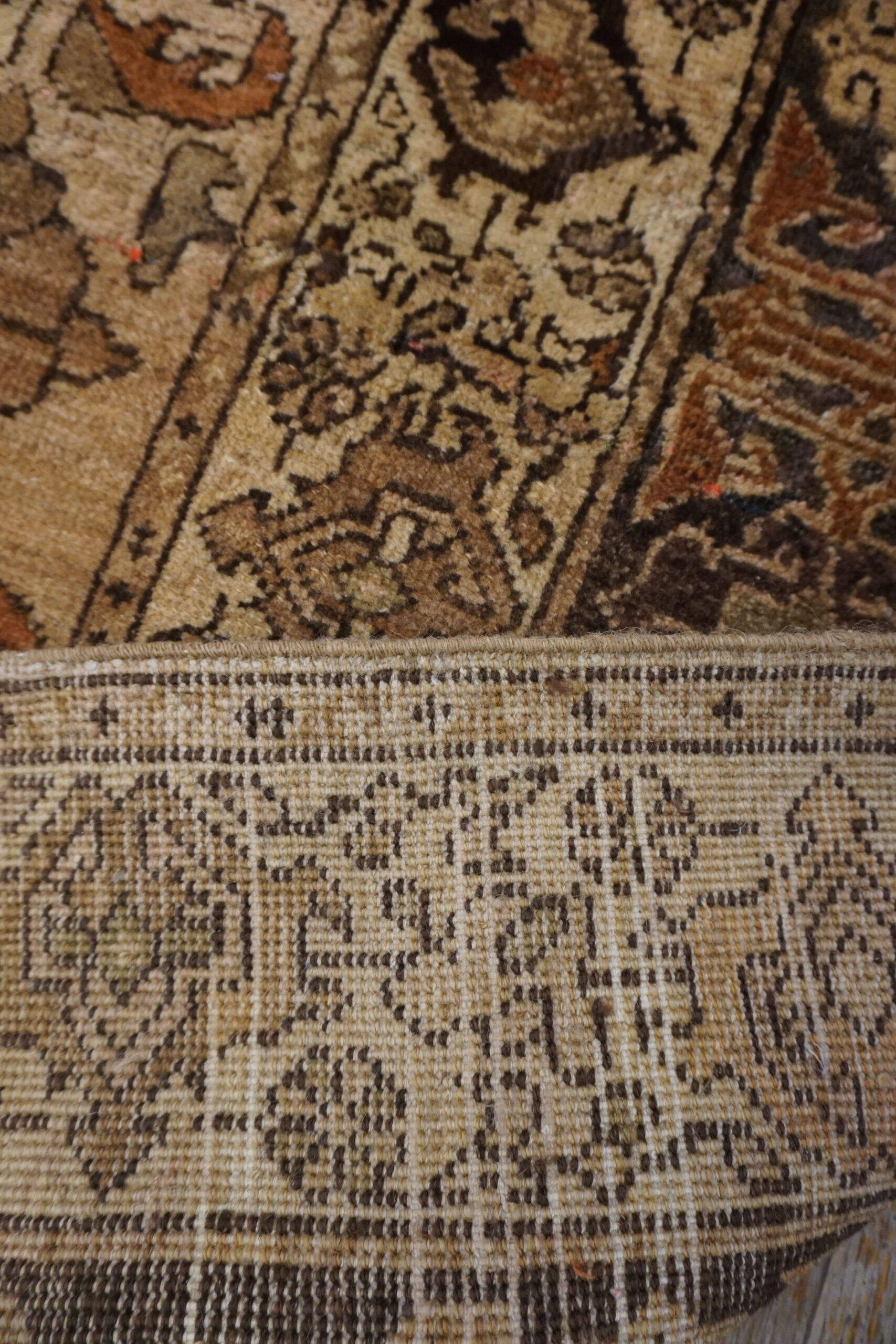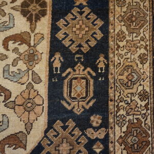 The rug’s field features a stylized paisley rug design pattern, arranged in a rhythmic progression that guides the eye along the length of the carpet. Interpreted through a tribal lens, the paisley forms appear more angular and dynamic than their classical counterparts, giving the design a sense of movement and vitality. The long, narrow proportions further enhance this effect, making the rug especially well-suited to transitional spaces.