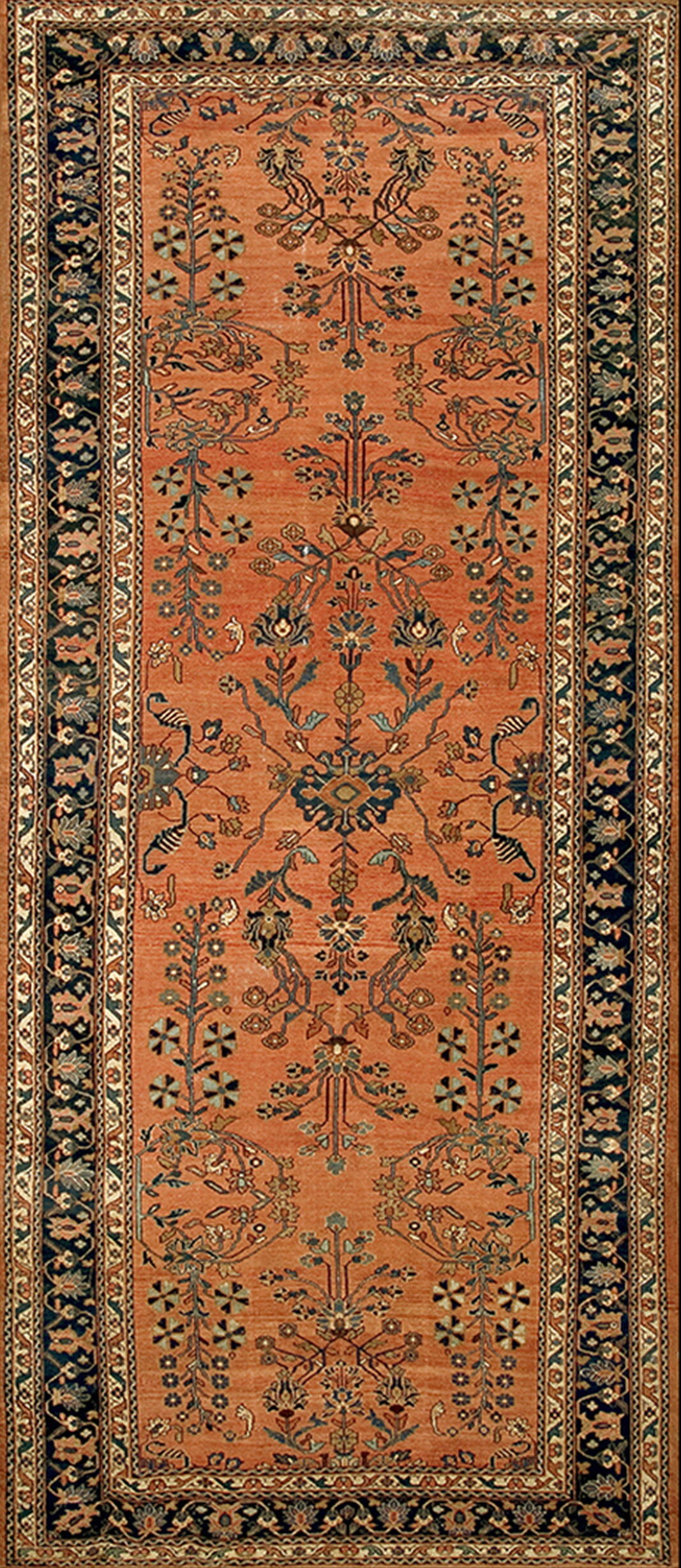 The field features a traditional Malayer allover design composed of finely drawn, stylized flowering vines and botanical elements. These repeating motifs, rendered primarily in deep indigo, teal, and soft gold, create a vibrant contrast against the warm ground, showcasing the weaver’s masterful use of natural dyes.