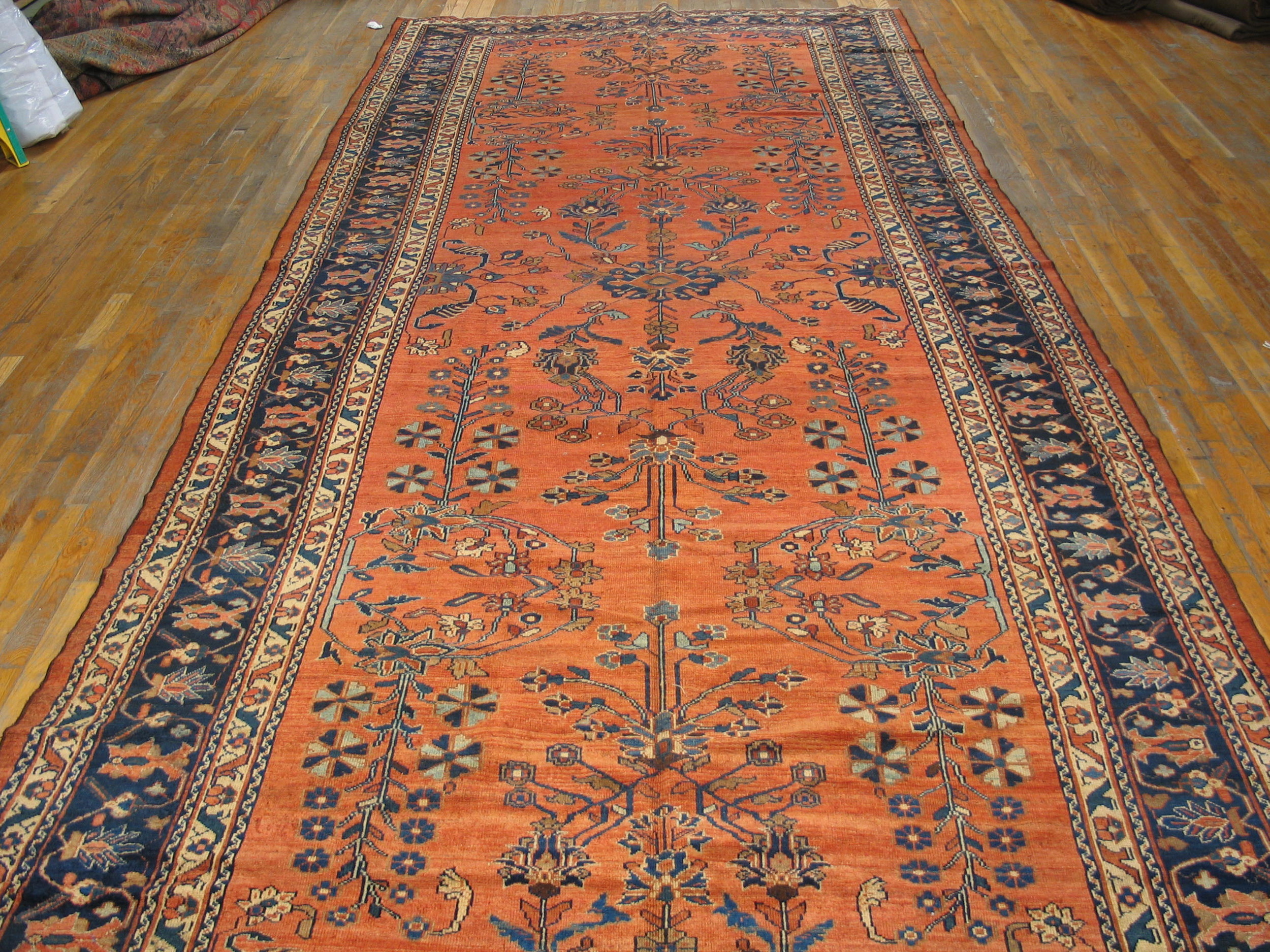 Antique Malayer Large Room Size Wool Coral Rug, Circa Date: 1920s. This exceptional Persian village piece, woven in the Hamadan region, presents a stunning, saturated field of rich coral, a highly sought-after hue among coral color rugs. Its age places it firmly within the desirable category of true antique rugs.