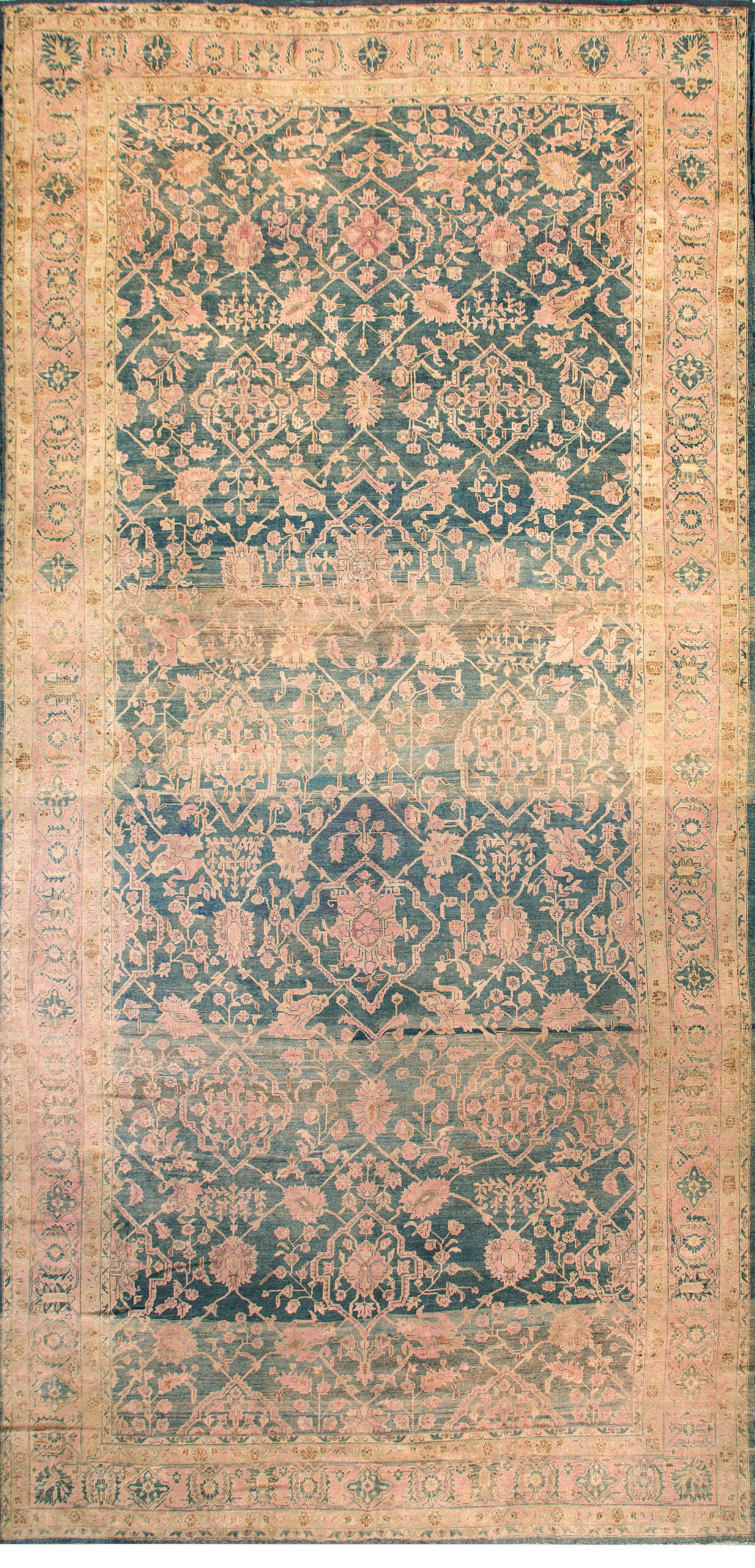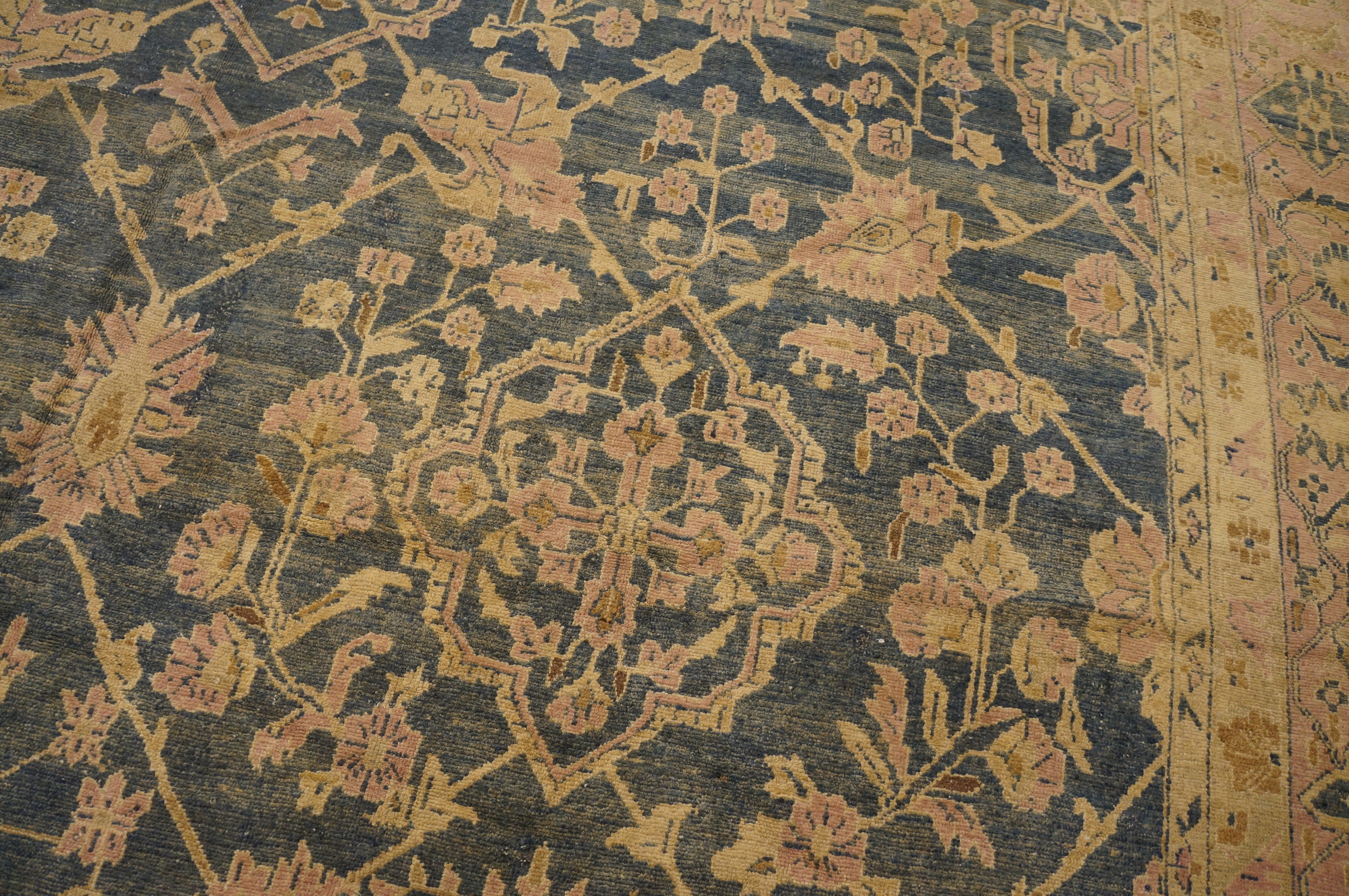 The field features a complex, densely rendered floral and vine motif executed in the tradition of allover rugs. The deep indigo ground provides a dramatic contrast to the faded rose and camel elements, which have achieved a sublime, soft patina characteristic of the finest antique textiles.
