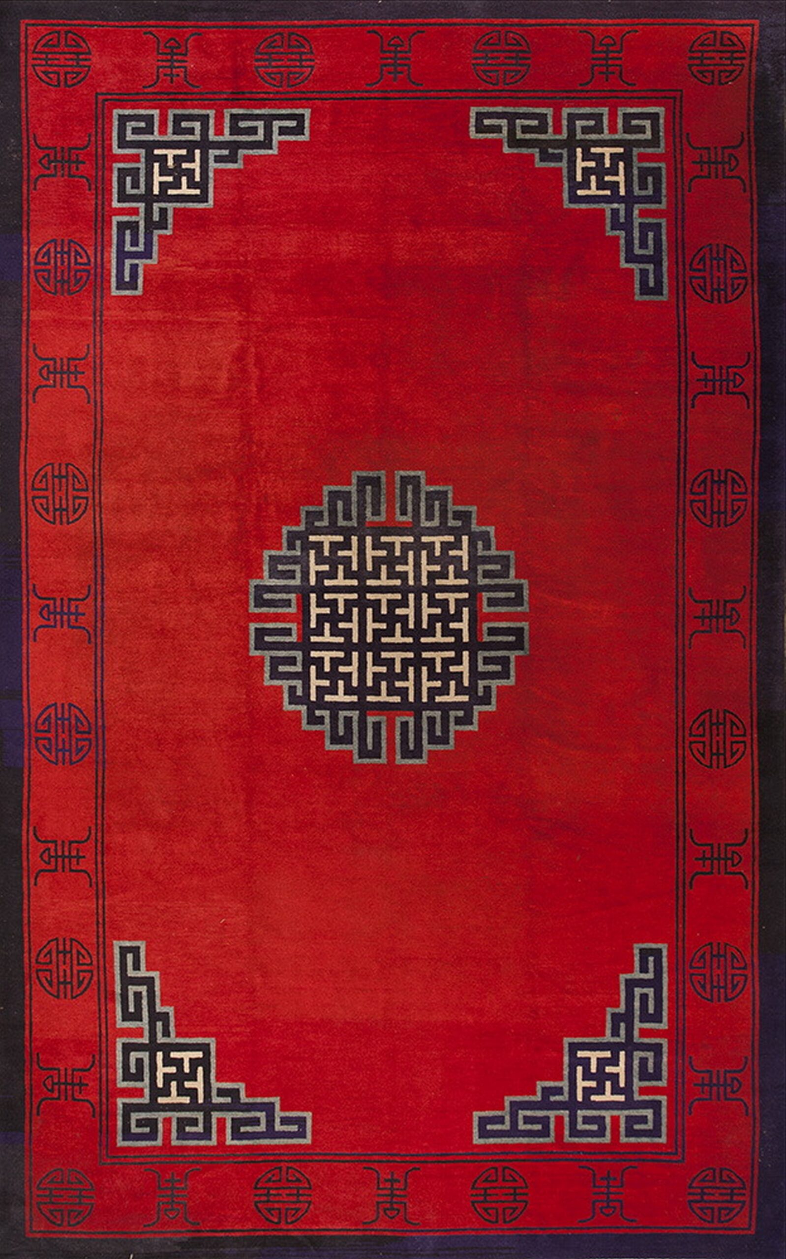 Antique Mongolian Chinese Medallion Knotted Rug, Circa Date: 1890s. This exceptional late 19th-century weaving embodies the graphic precision characteristic of Northern Chinese and Mongolian production. Its striking composition relies on a powerful contrast between the expansive field and the tightly rendered geometric motifs, setting it apart from more densely patterned antique rugs.