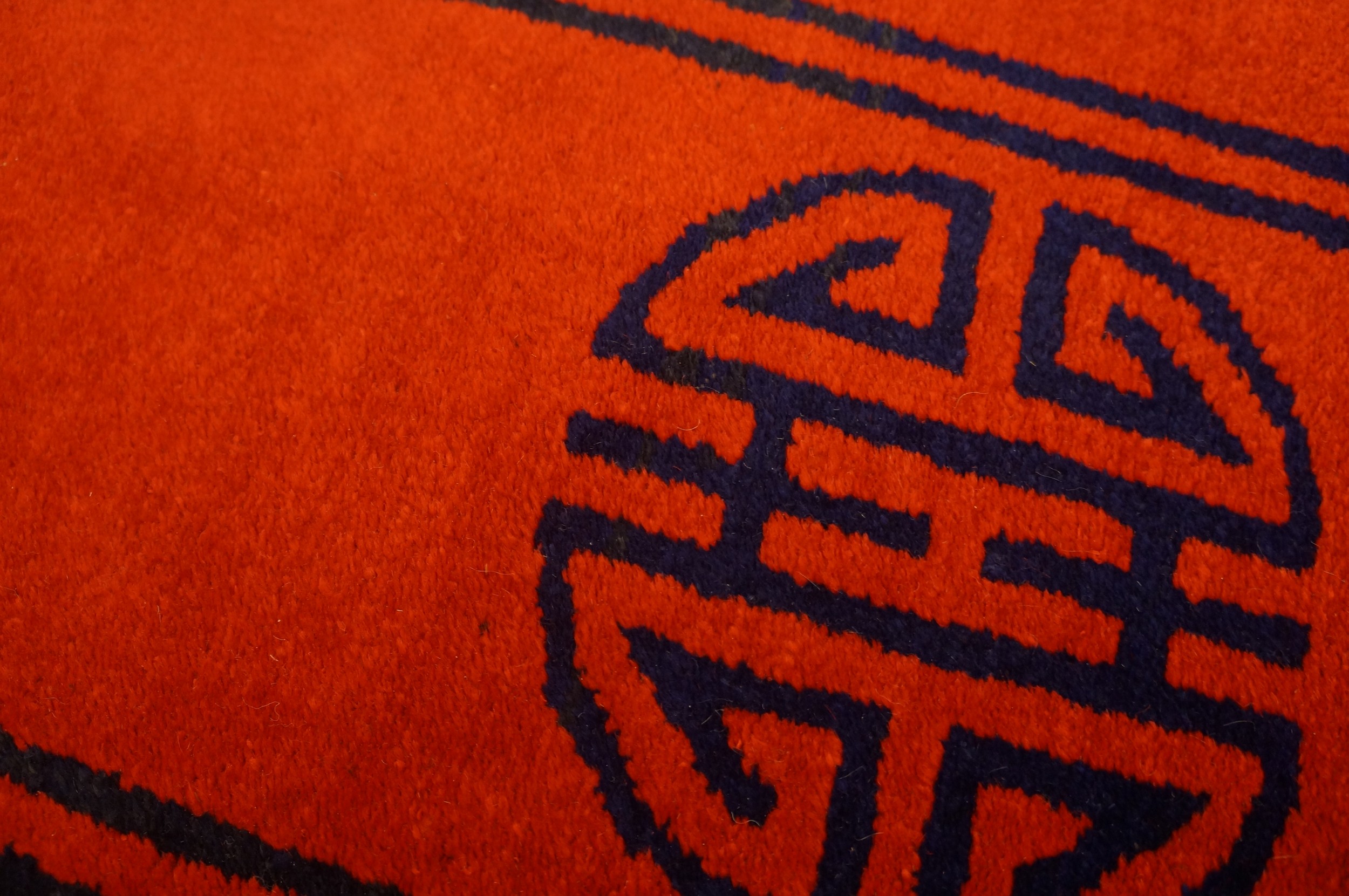 The primary field is dominated by a deep, highly saturated tone, a rich rust red color that provides a dramatic backdrop for the stylized iconography. This vast, monochromatic expanse emphasizes the purity of the design, drawing the eye immediately to the central medallion and the four corner spandrels.