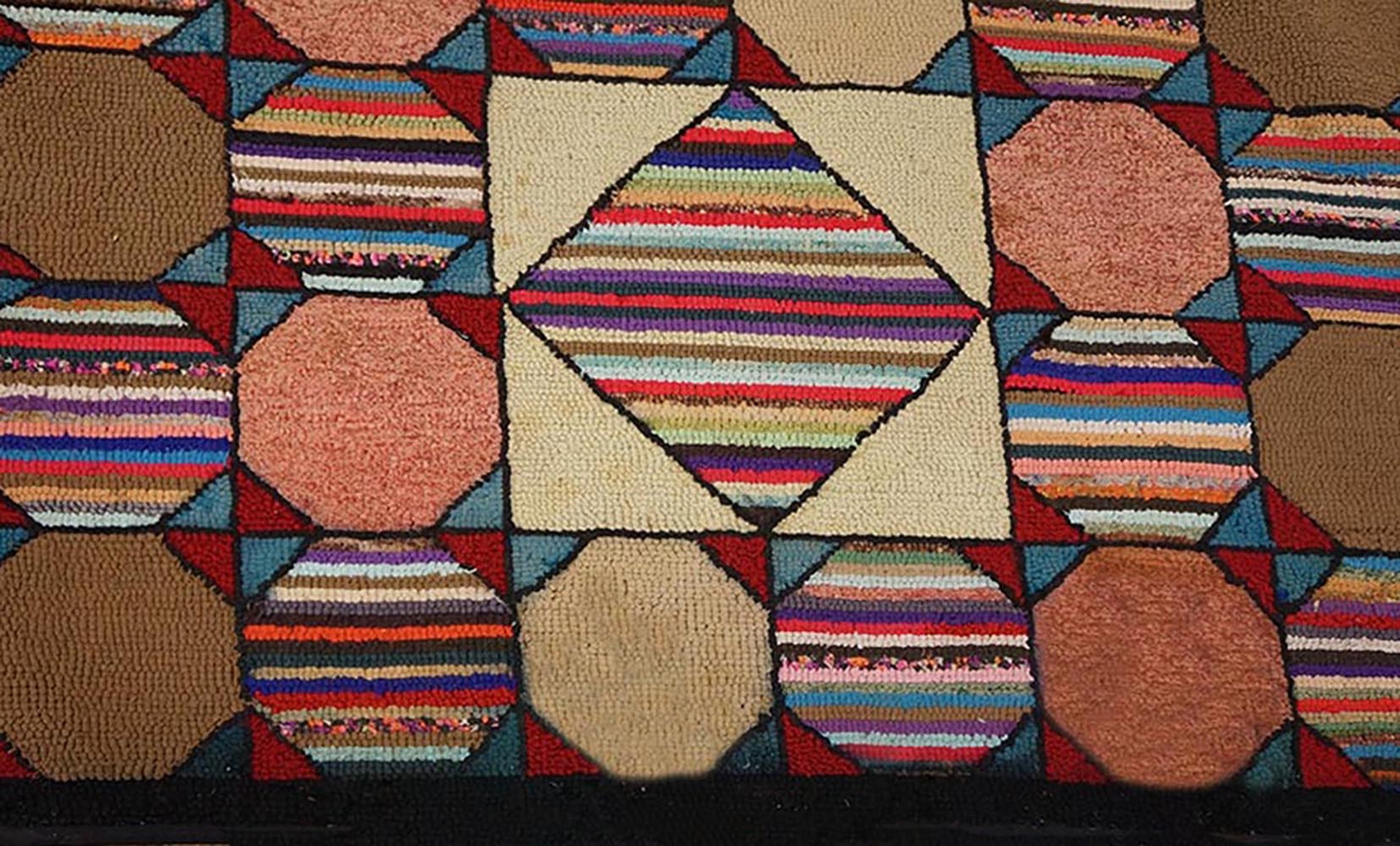 Antique Multicolor Wool 1920s American Hooked Small Scatter Size Rug, Circa Date: 1920s. This charming piece exemplifies the folk art tradition inherent in the American Hooked Rug style, offering a distinctive, textural departure from more formal woven textiles and representing a unique category within our collection of antique rugs.