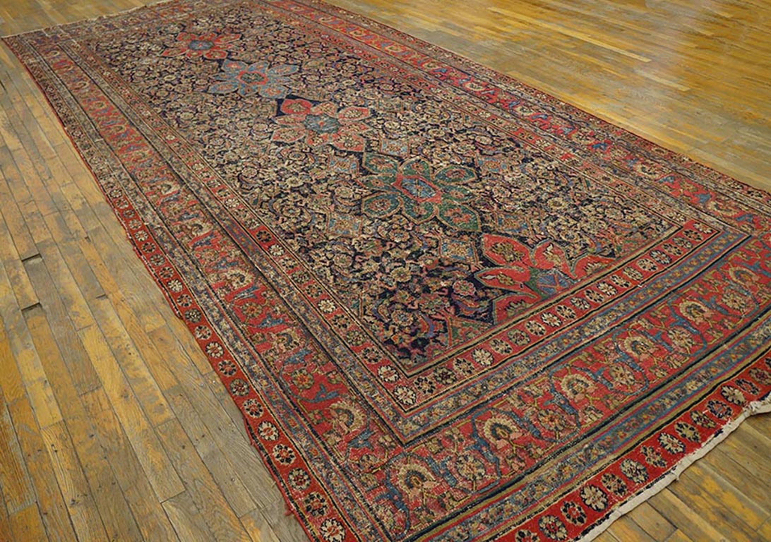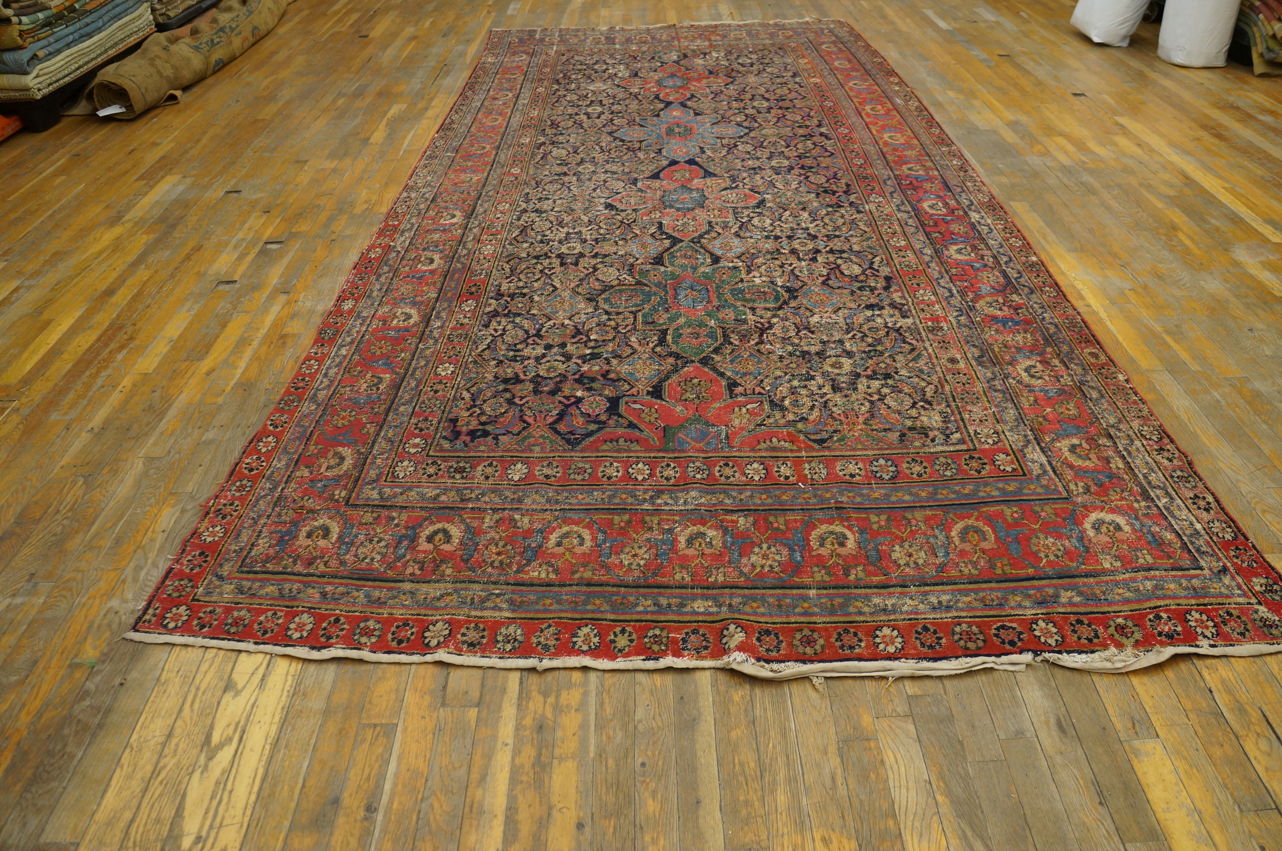 Despite its age, the rug retains a powerful presence, exhibiting the soft, lustrous patina only achievable through centuries of gentle use. Its generous dimensions classify it as a true room size piece, capable of anchoring a significant interior space with historical depth and unmatched texture.