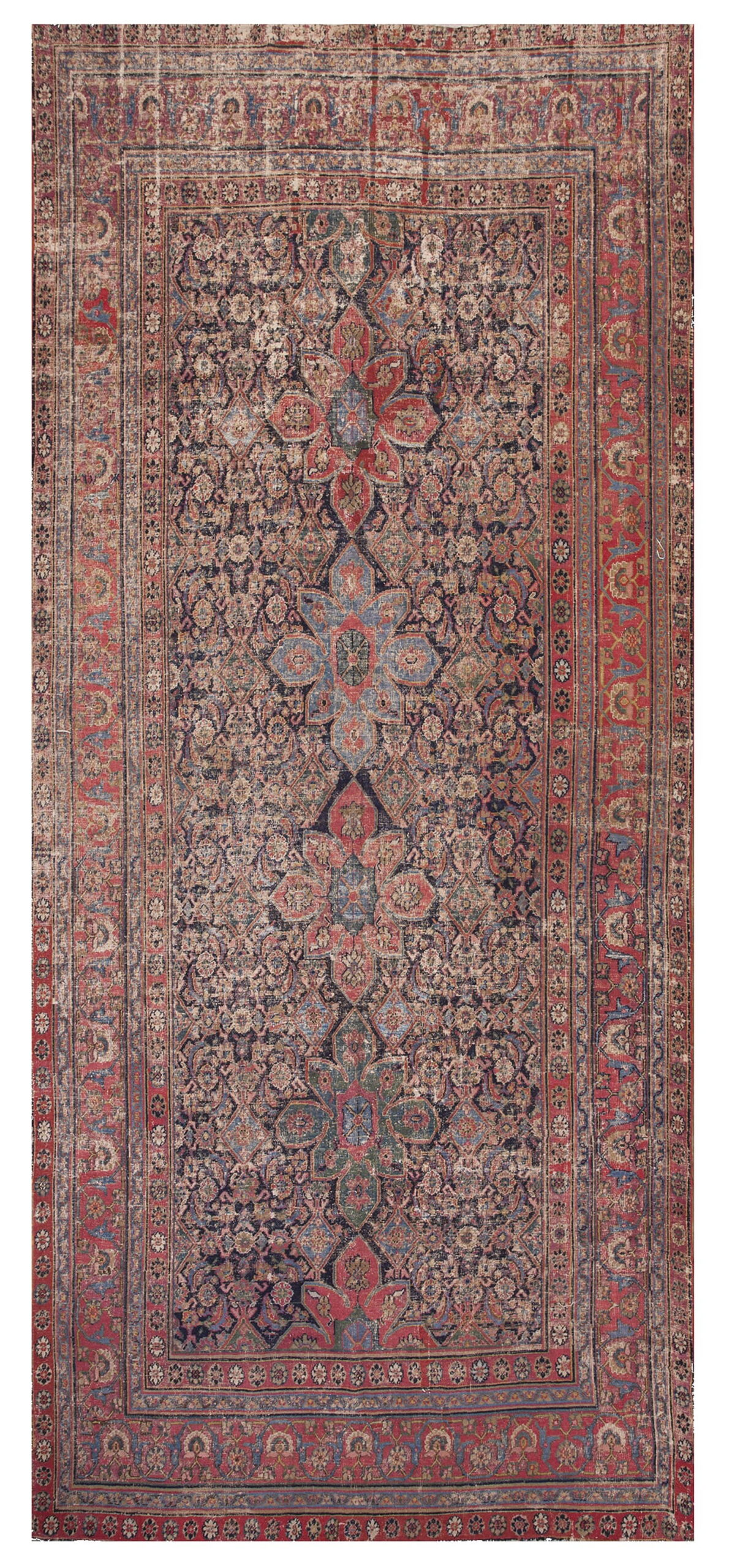 The field is dominated by a deep indigo ground, providing a dramatic contrast for the complex, repeating boteh and palmette motifs that cover the surface. A strong central axis is defined by stacked, stylized medallions rendered in faded madder red and soft sky blue. This intricate composition is a masterful example of the enduring appeal of floral rugs in classical Persian weaving.