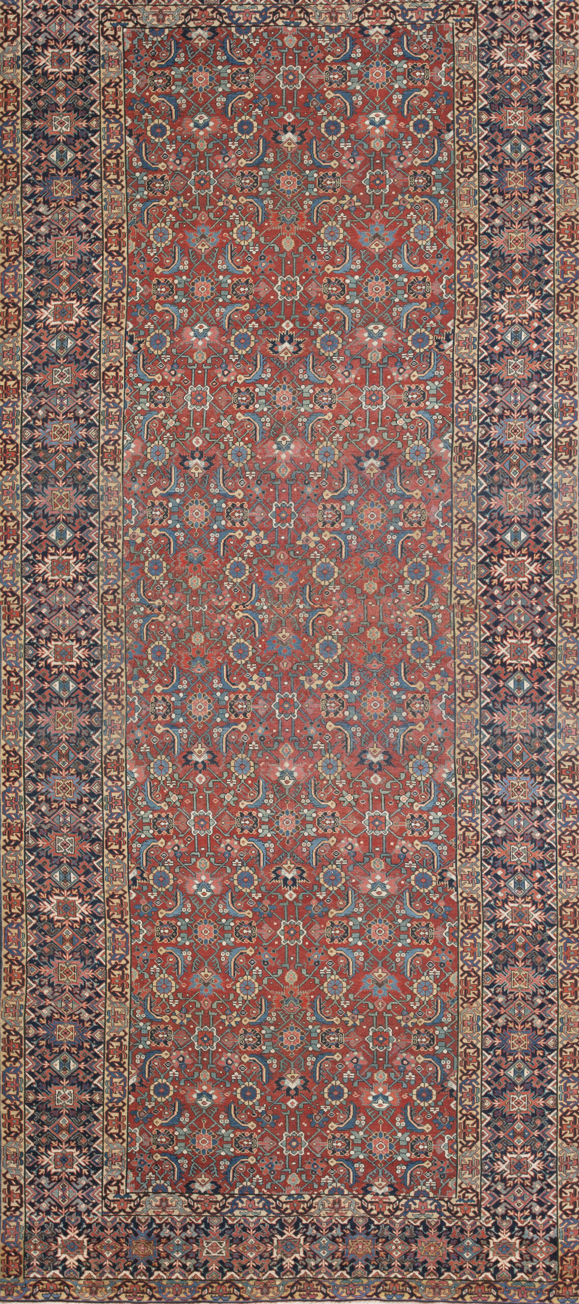 Antique N.W. Persian Oversized Room Size Wool Coral Rug, Country of Origin: Iran / Persia, Circa Date: 1840s. This exceptional weaving dates to the early Qajar period, representing the finest traditions of Iranian / Persian rugs. Its construction and palette speak to the sophisticated village workshops of the Northwest region, where durable structure met complex, stylized design.