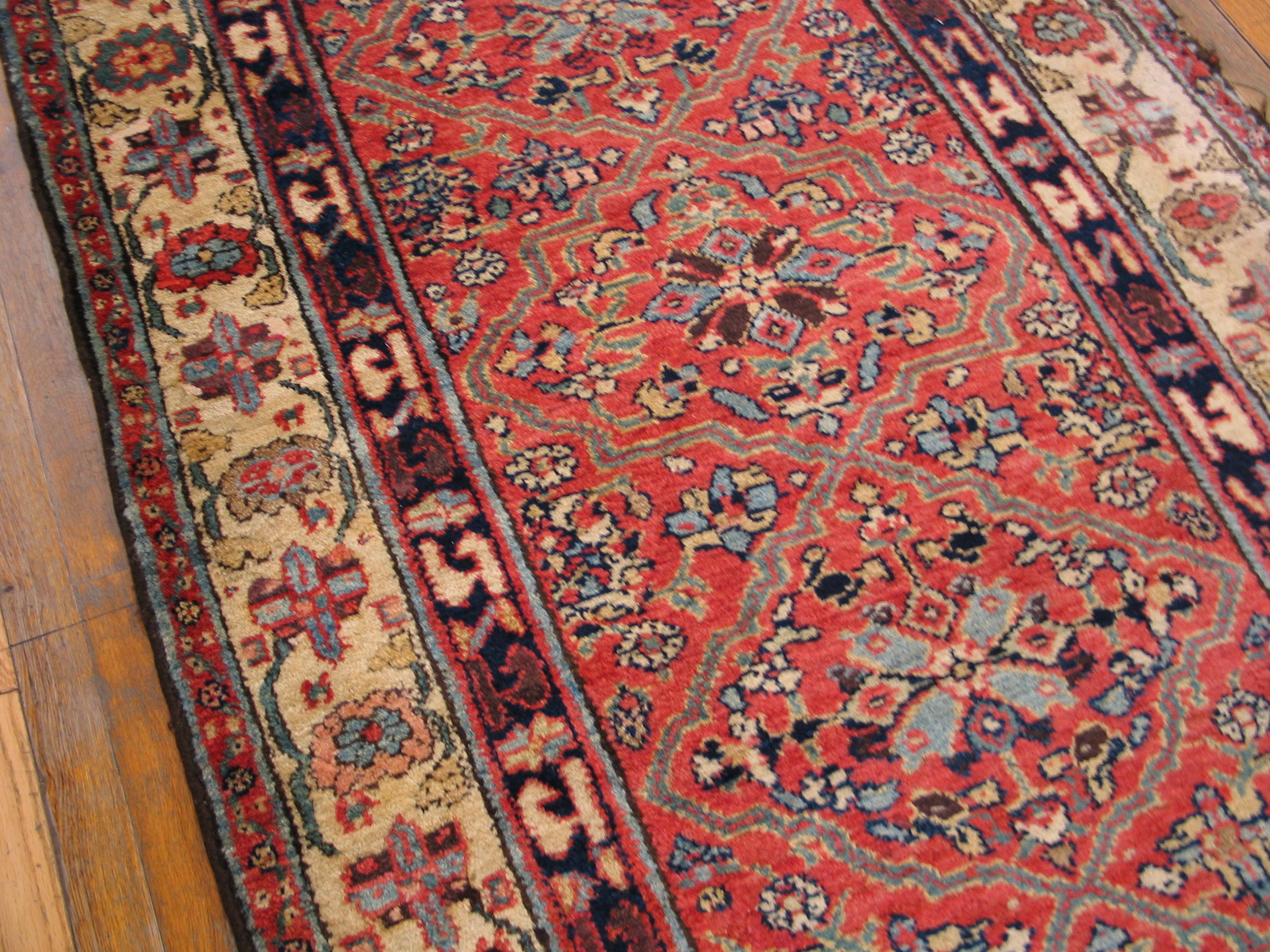 Woven in a narrow, elongated format, this textile functions perfectly as a hallway runner rug. Its dimensions speak to the architectural needs of 19th-century Persian homes, where long corridors required durable and richly patterned floor coverings. The ivory primary border, featuring repeating floral cartouches, frames the central panel with elegant precision, providing necessary visual relief.