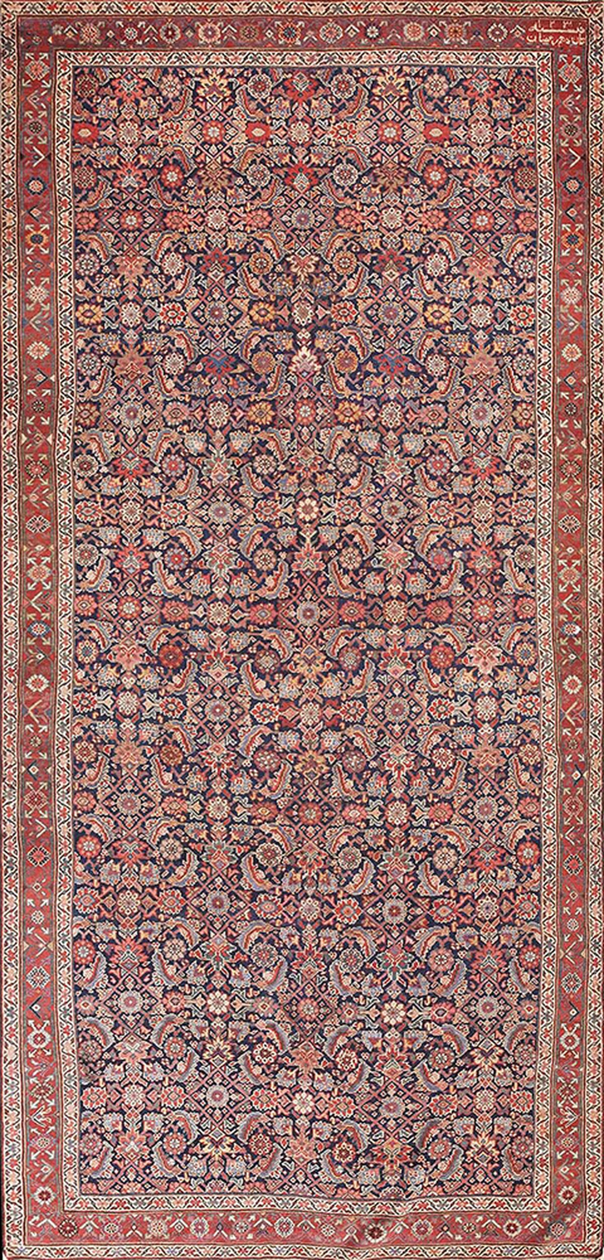 The complex, repeating boteh and stylized floral elements create a mesmerizing allover design that fills the space without interruption. This dense composition ensures visual depth and texture, a characteristic often sought in the most important antique rugs that define early 19th-century weaving traditions.
