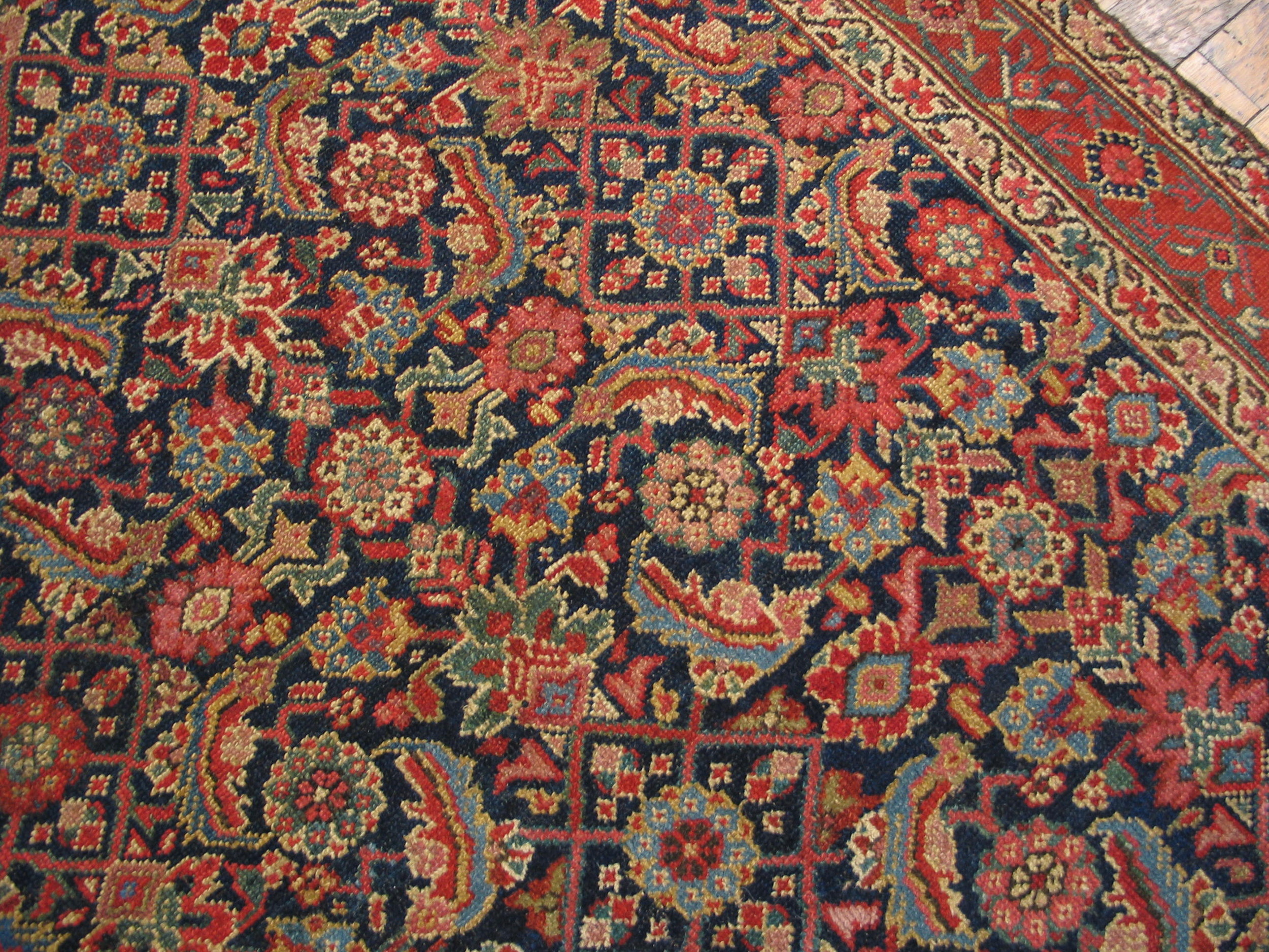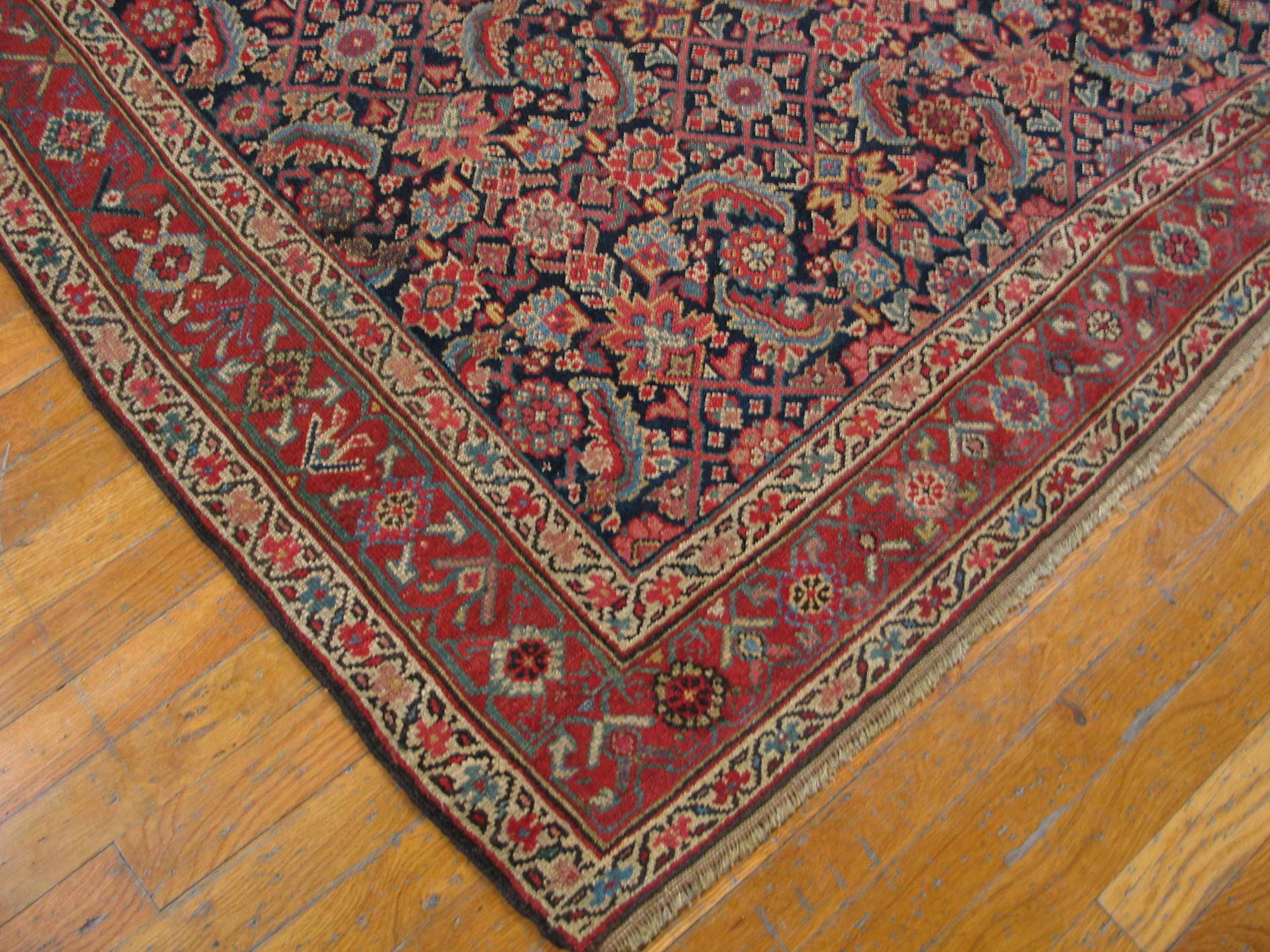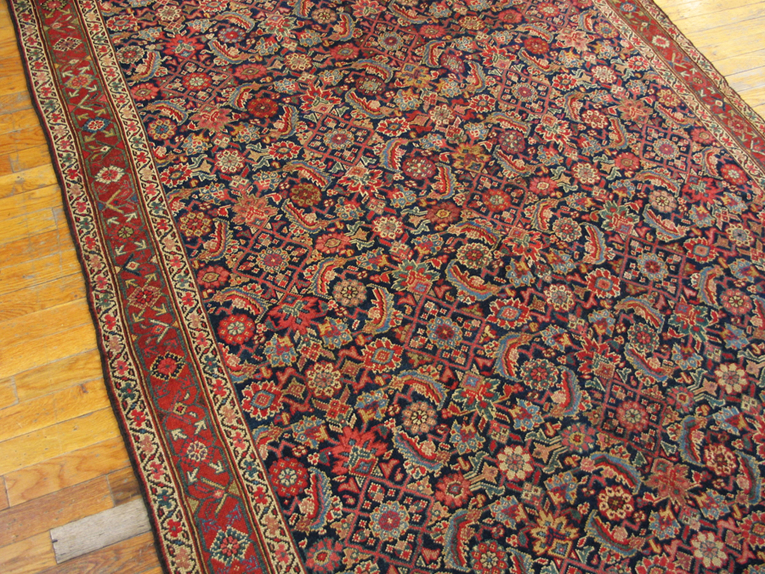 The saturated field is dominated by a rich, inky indigo, a hallmark of the finest natural dyes, which provides a dramatic contrast to the terracotta and madder red used in the borders and secondary detailing. The masterful use of this deep shade places it among the most desirable blue color rugs of the period, offering profound visual weight.