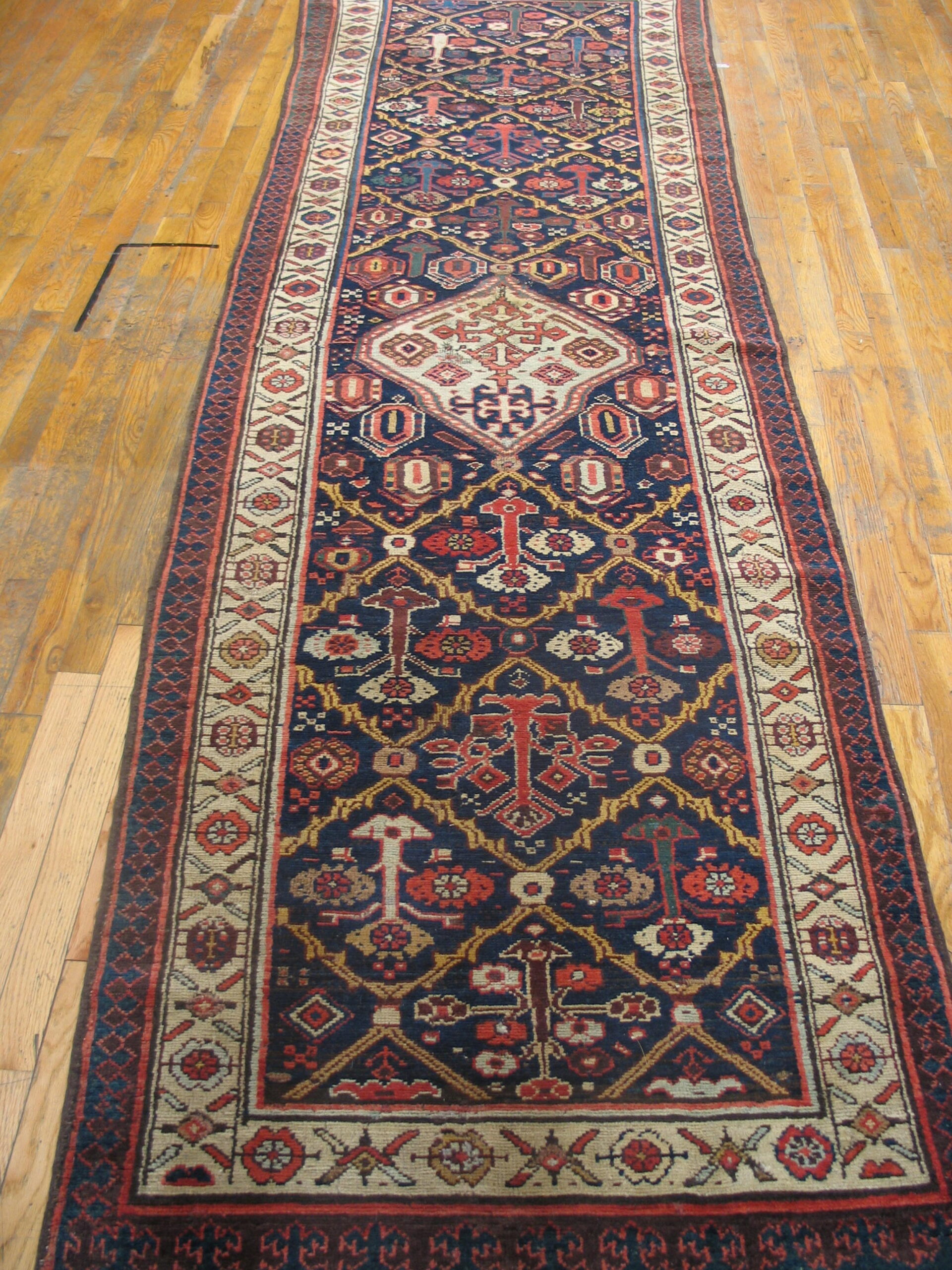 Its long, narrow format designates it specifically as one of the desirable hallway runner rugs. The complex border system, featuring repeating rosettes and stylized vines against a cream ground, beautifully frames the powerful central field, offering a sophisticated and grounding element to any extended space.