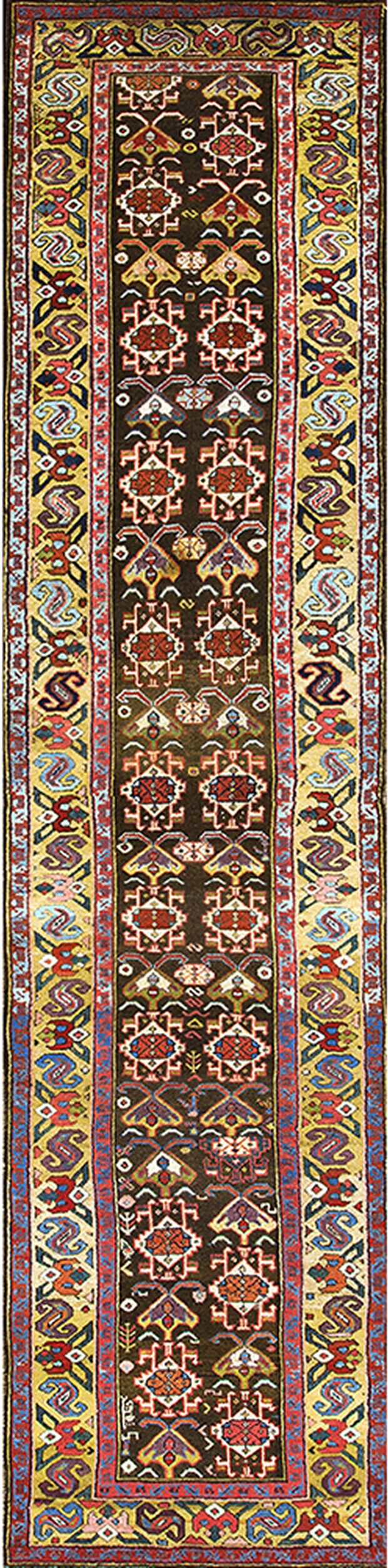 Antique N.W. Persian Persian Brown 1820s Rug, Circa Date: 1820s. This exceptional example of the N.W. Persian weaving tradition showcases the robust, deeply saturated palette characteristic of the early 19th century. The central field is dominated by a rich, dark brown earth tone color rugs, providing a powerful contrast to the vibrant secondary colors that define the tribal motifs.