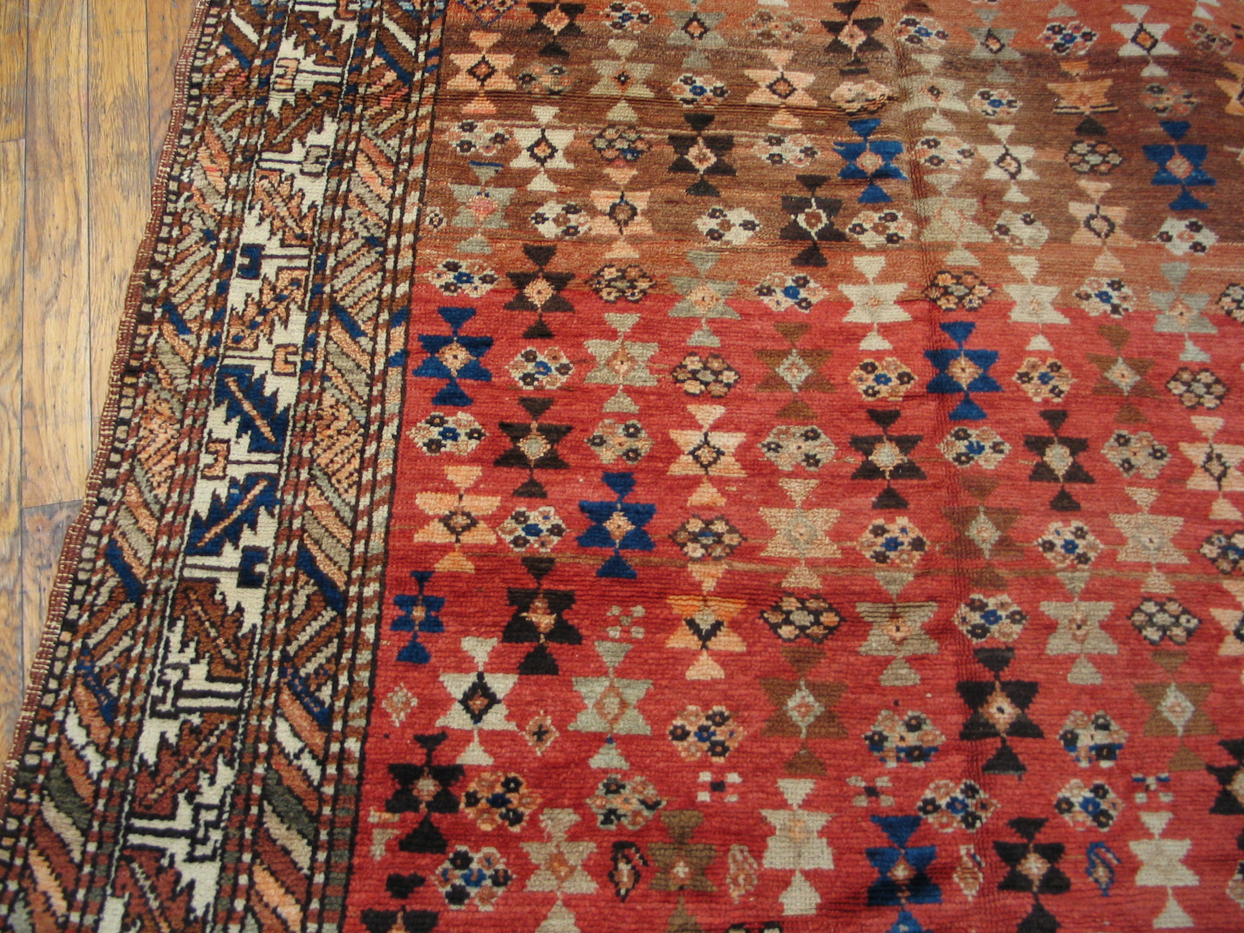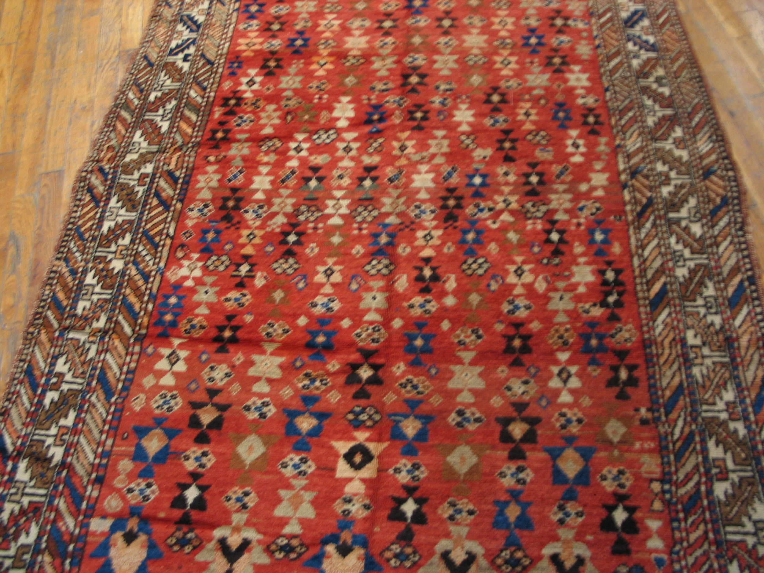 Antique N.W. Persian Persian Coral 1930s Rug, Country of Origin: Iran / Persia, Circa Date: 1930s. This striking piece exemplifies the robust, geometric weaving traditions characteristic of the N.W. Persian style, featuring a dense, all-over pattern of repeating tribal motifs across the field.