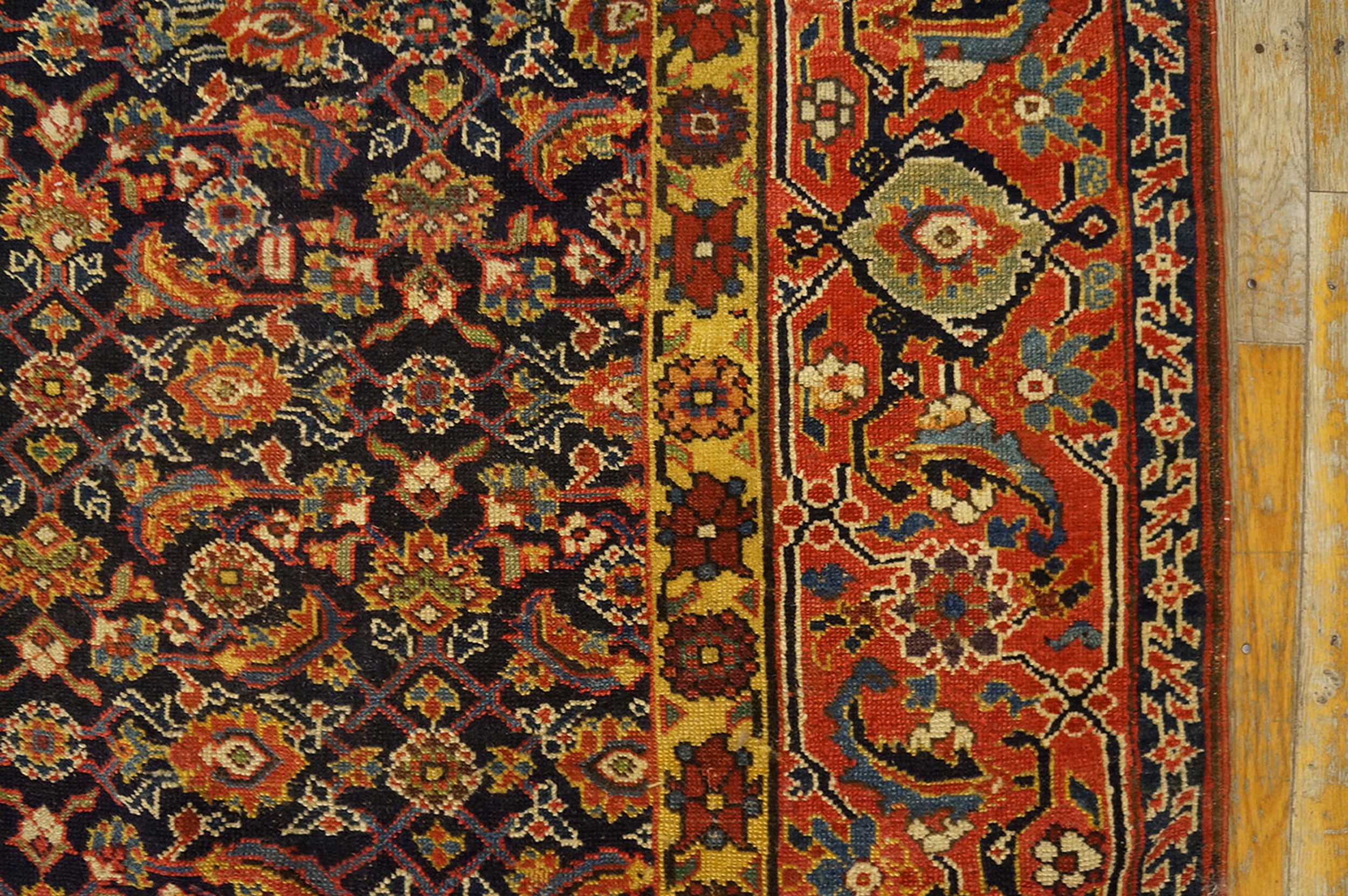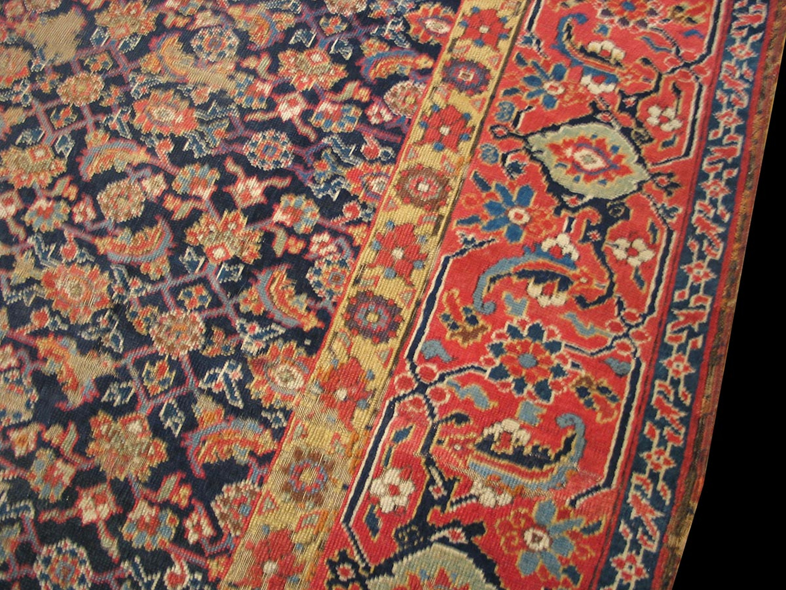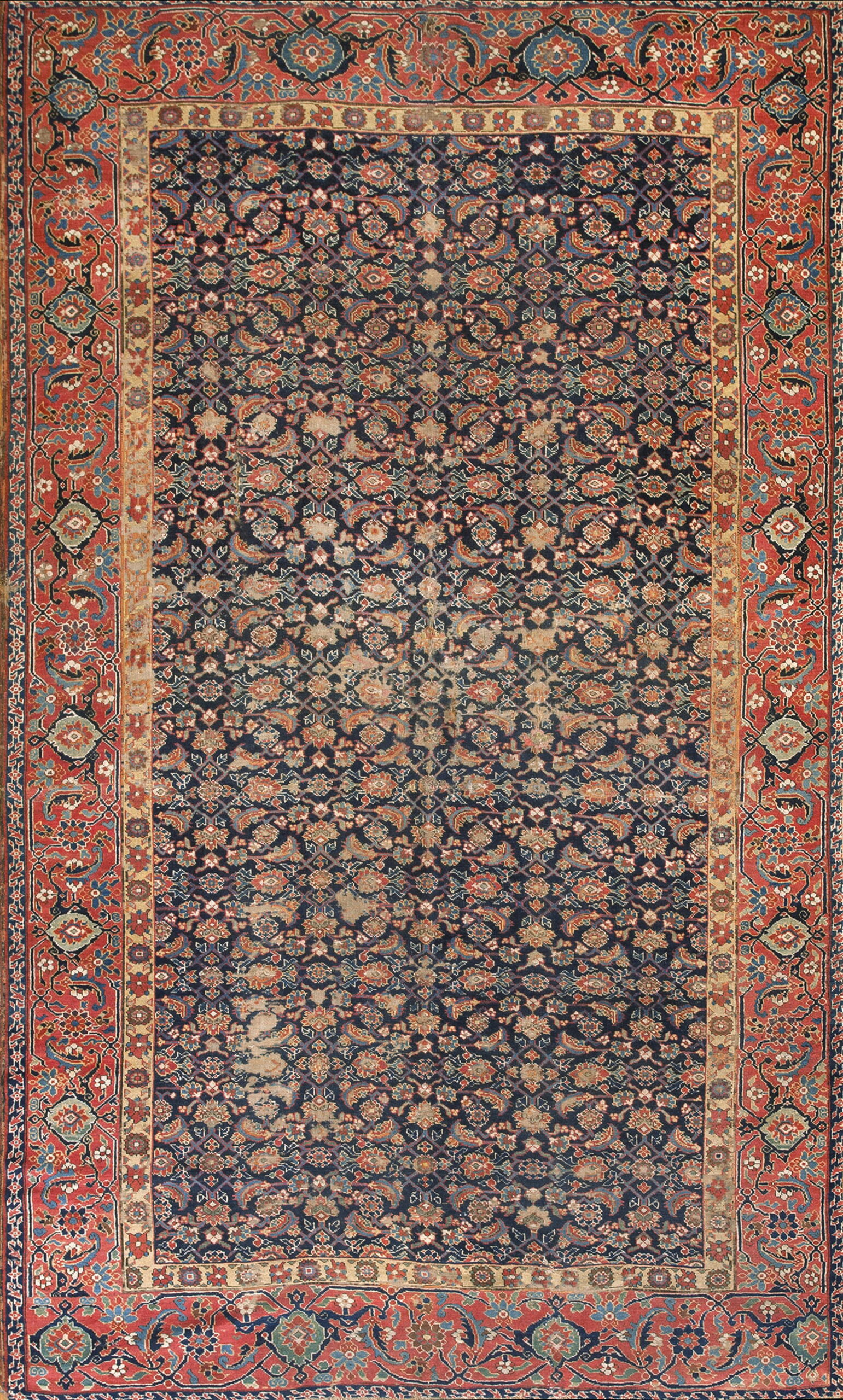 The primary field is dominated by a rich, saturated indigo, providing a dramatic backdrop for the intricate floral lattice. The deep blue color rugs were achieved using high-quality natural dyes, which have mellowed beautifully over the last 170 years. This dense, all-over design avoids a central medallion, creating a harmonious and expansive visual flow suitable for grand interiors.