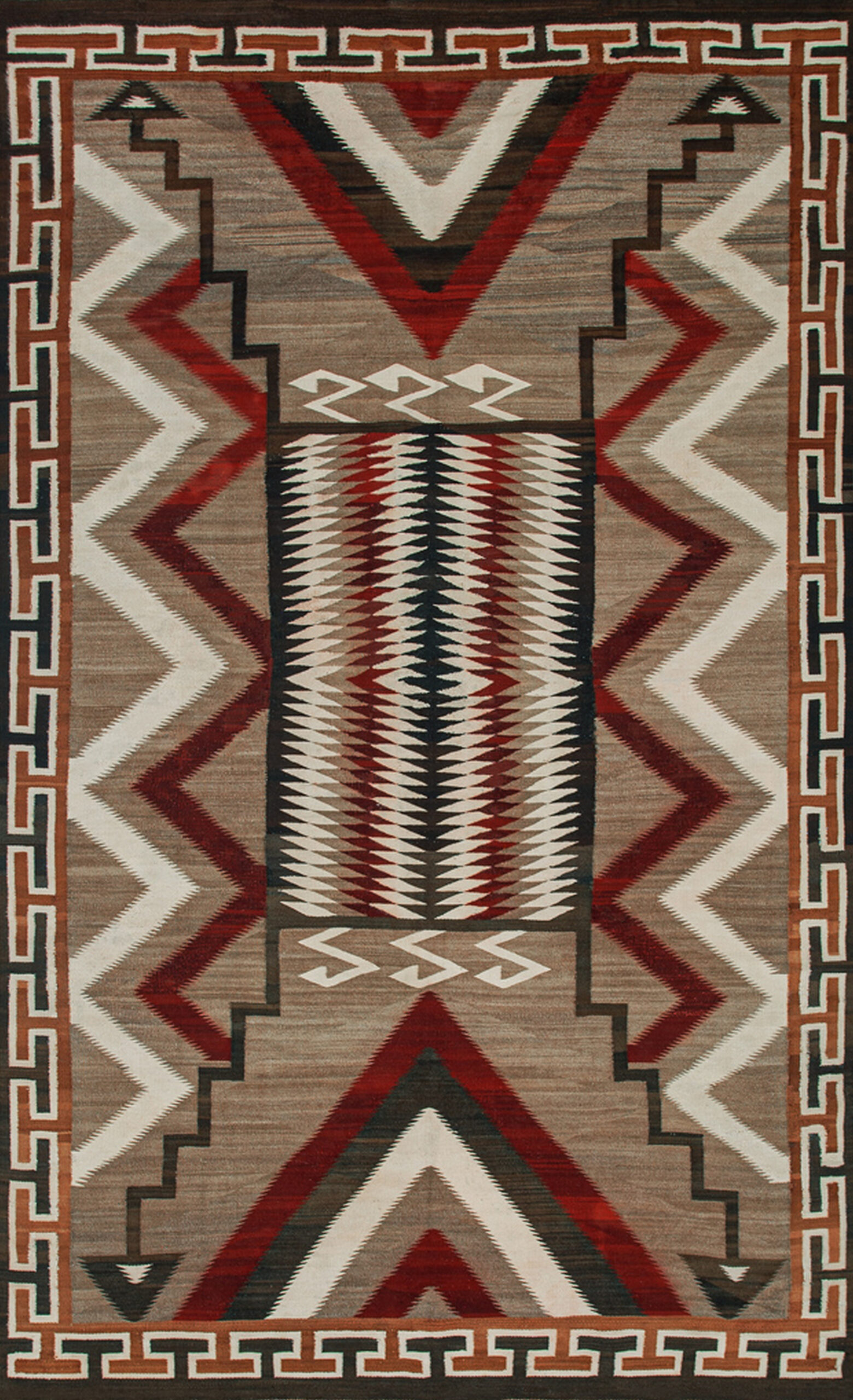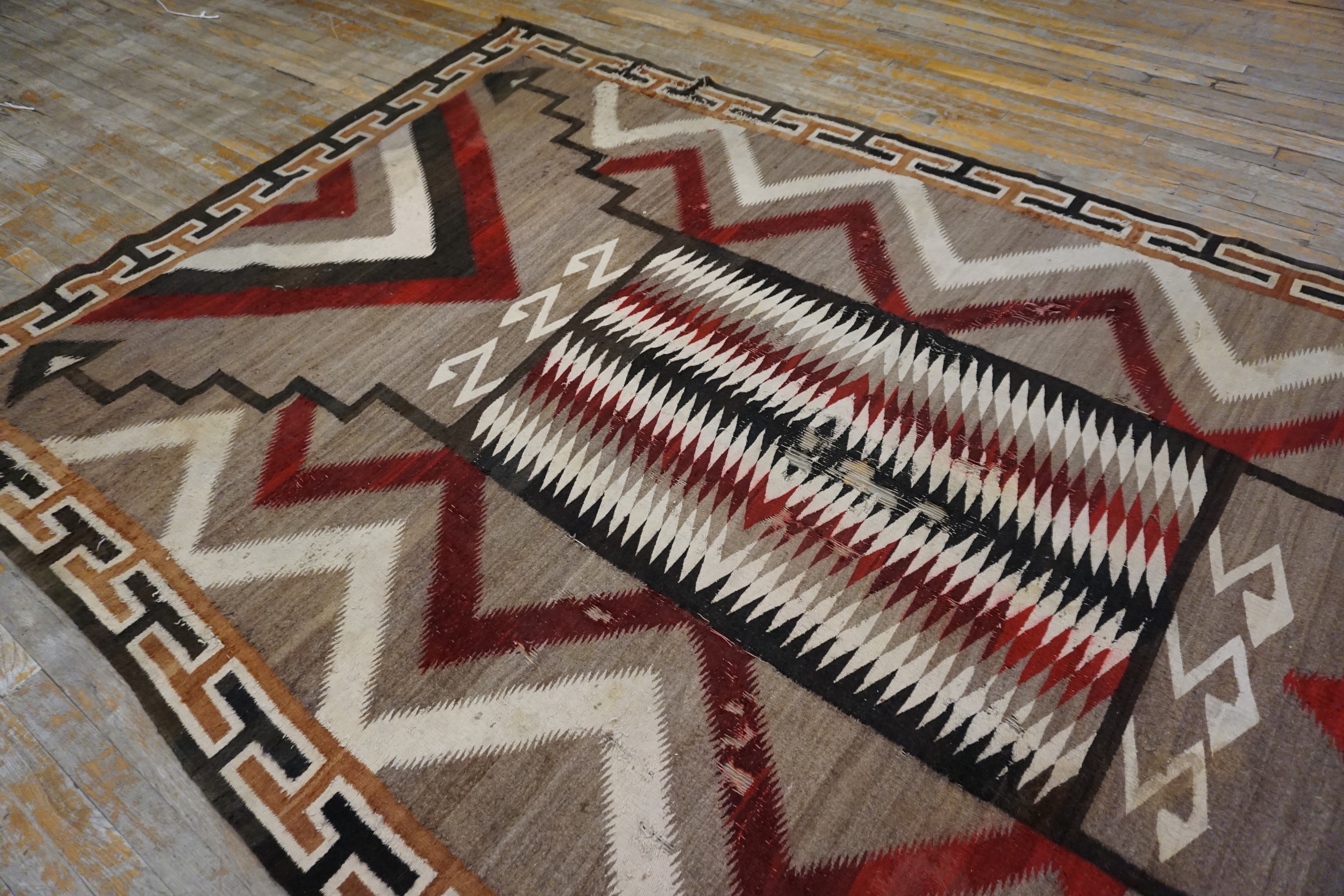 The meticulous execution of the interlocking patterns speaks to a high level of weaving skill. A continuous Greek key border, rendered in contrasting dark and light tones, neatly contains the explosive energy of the field. Such pieces are highly sought after by collectors of antique rugs due to their cultural significance and enduring modern aesthetic.