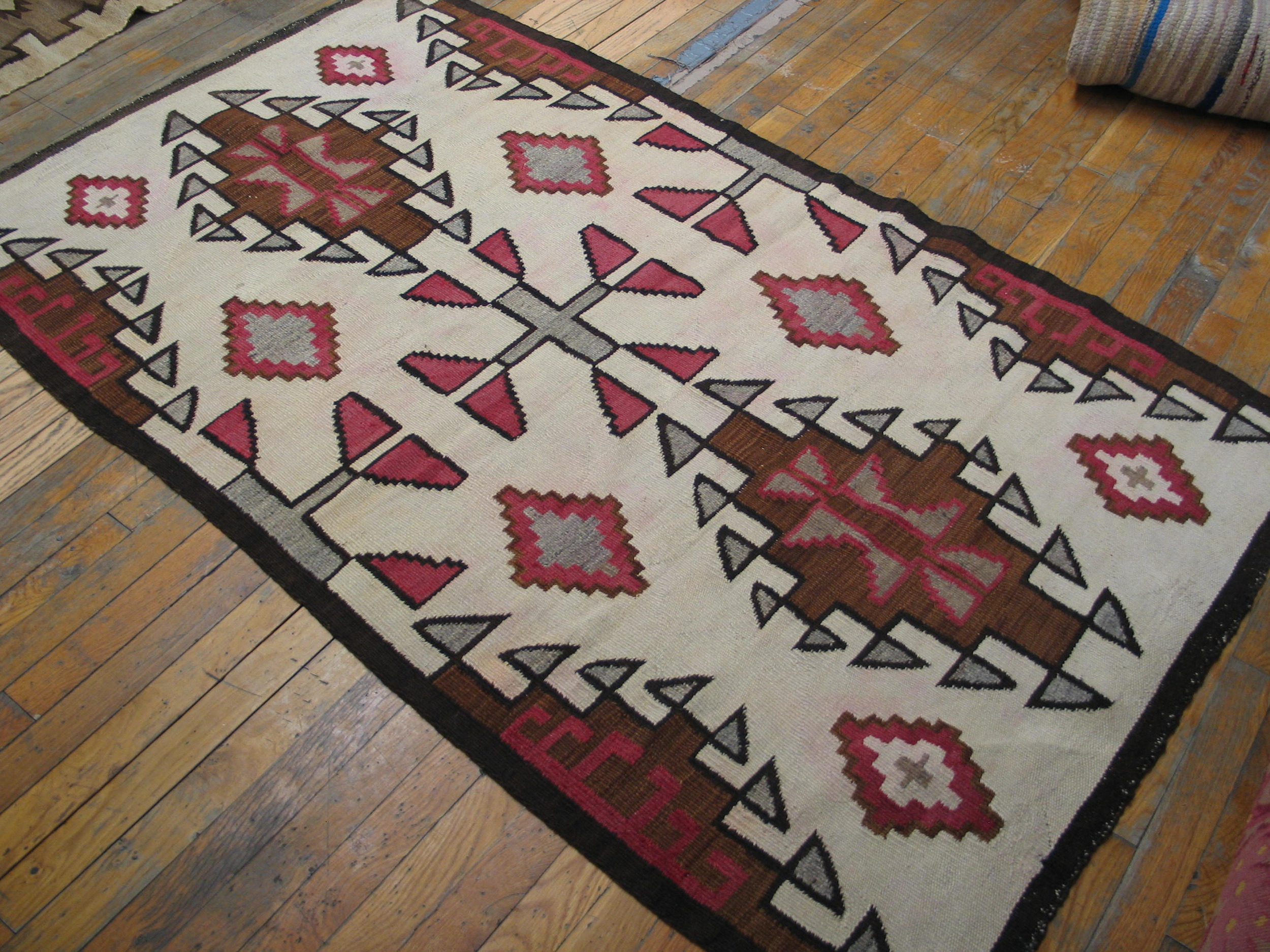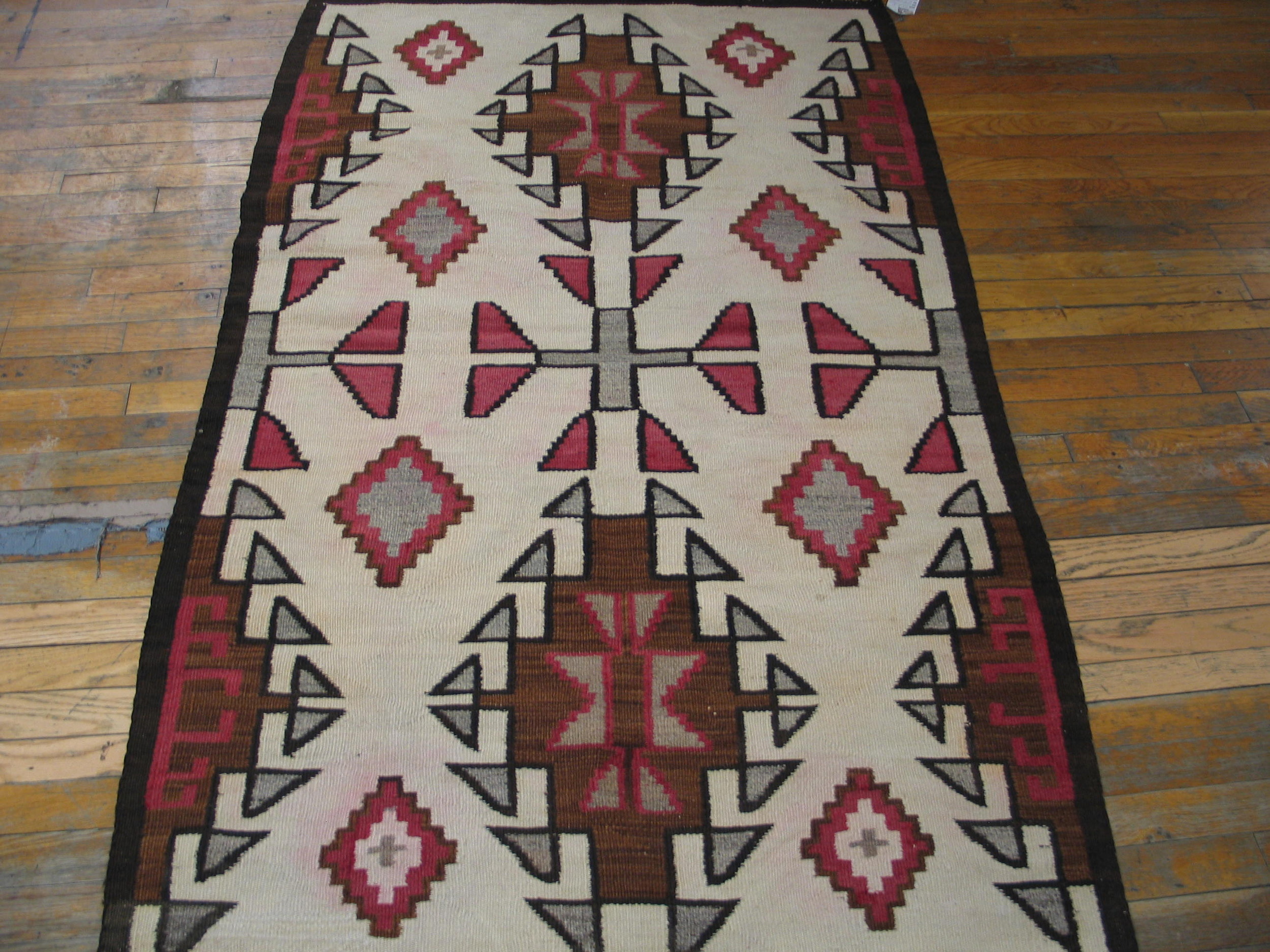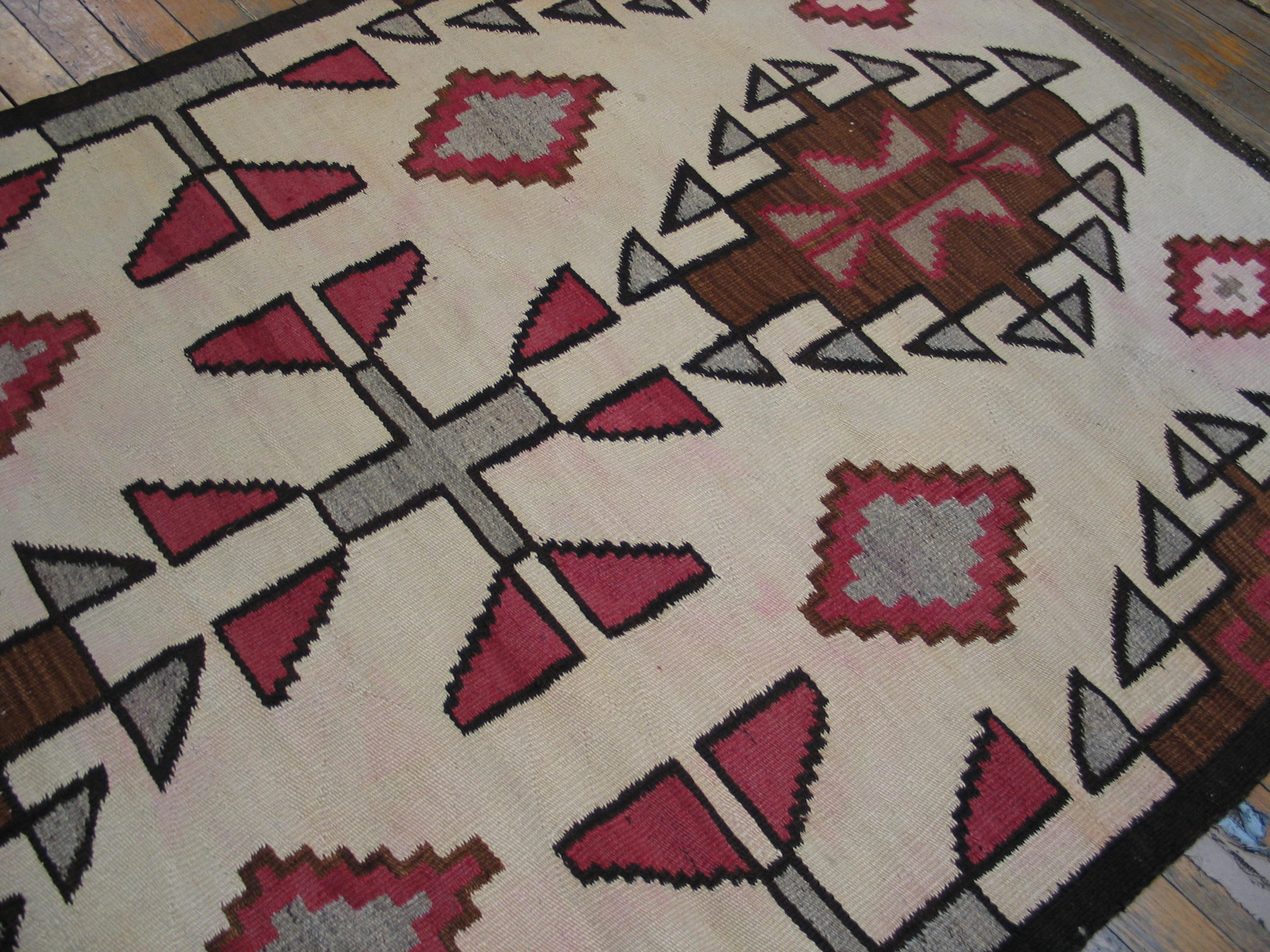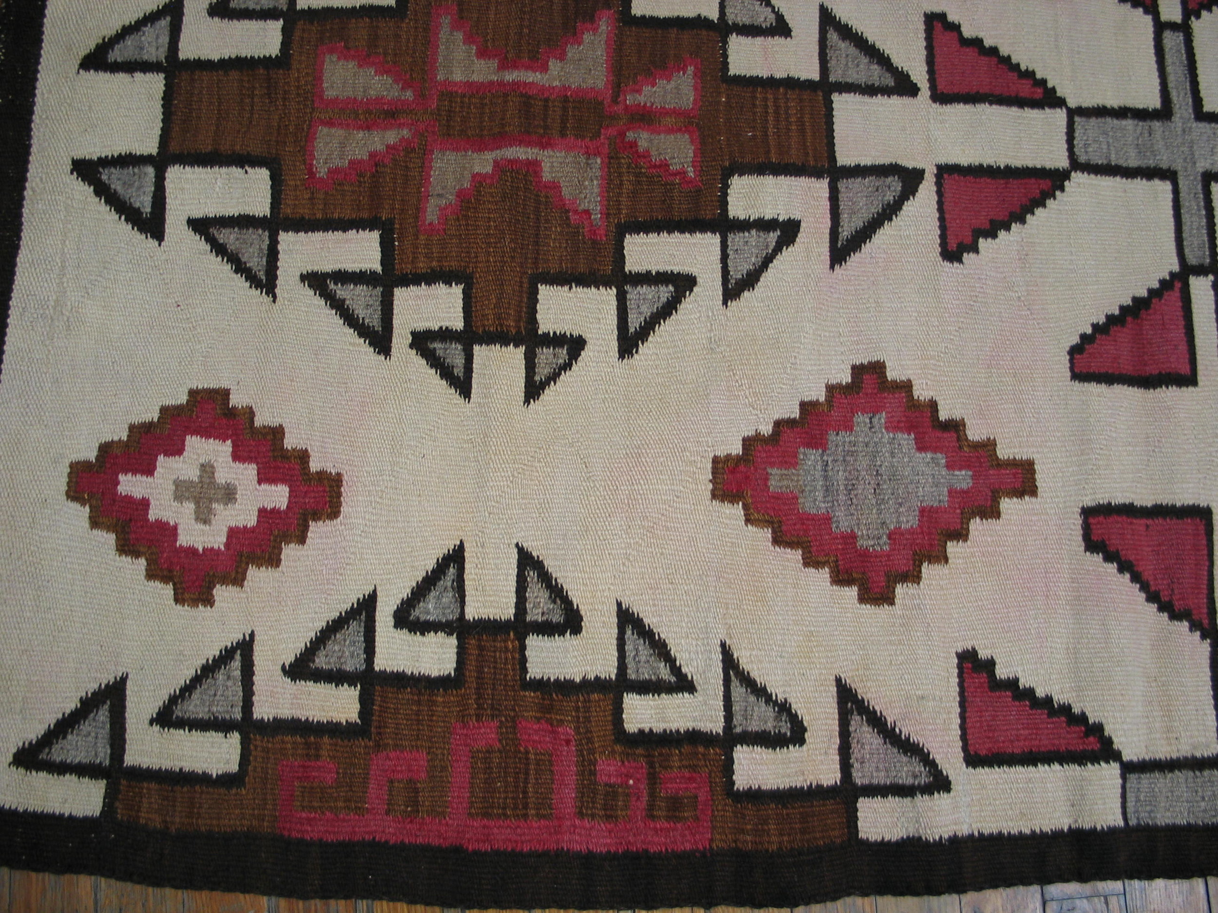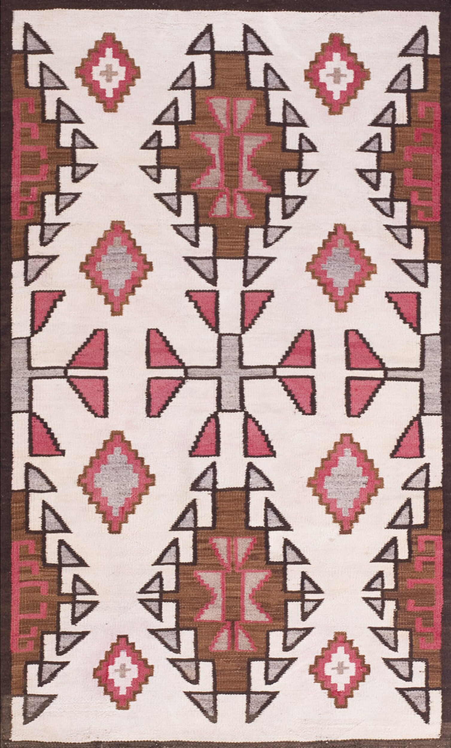 Accent colors—rich cocoa brown, subtle slate grey, and vibrant magenta—define the stepped diamonds and cruciform elements that populate the field. The precision of the flat weave ensures that each motif stands out with graphic clarity, a testament to the weaver’s skill in handling these complex antique rugs.