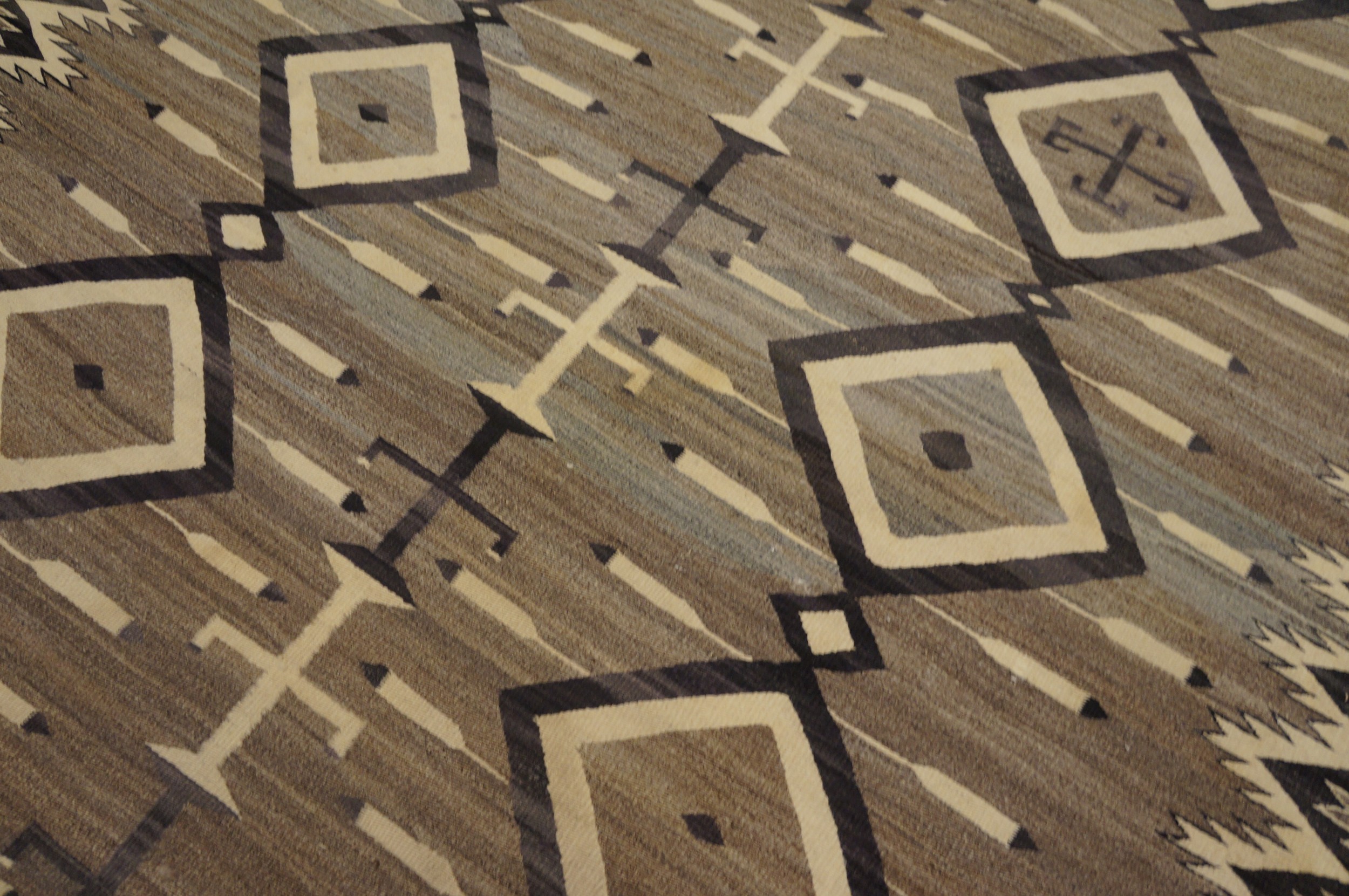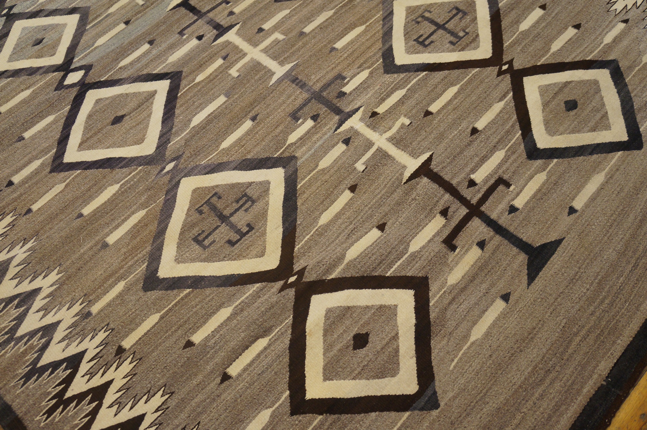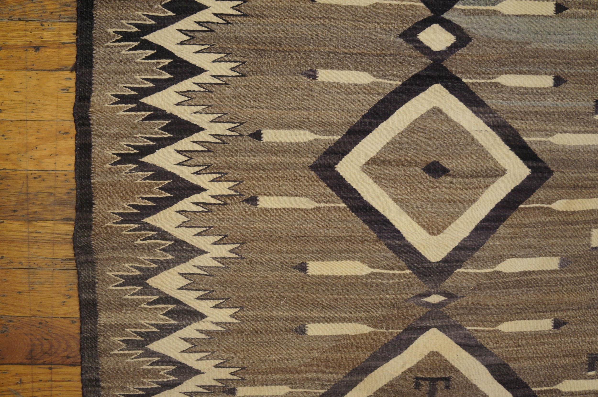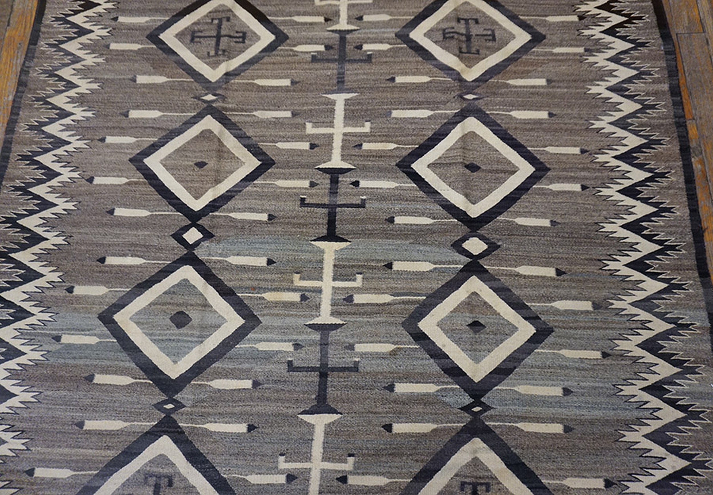 Antique Navajo American Allover Geometric Grey 1930s Rug, Circa Date: 1930s. This exceptional textile represents the zenith of mid-century Southwestern weaving, characterized by its powerful, balanced geometry. The Navajo weavers are renowned for their mastery of indigenous design, resulting in highly collectible antique rugs that transcend mere floor coverings.