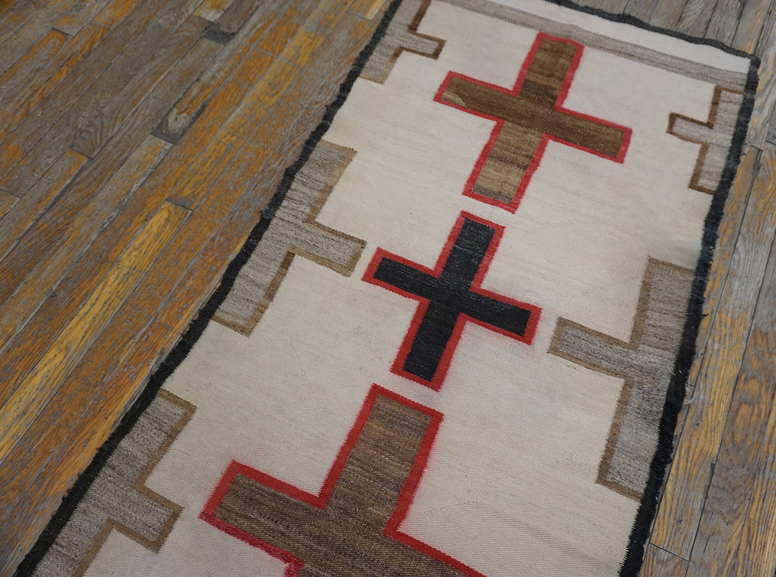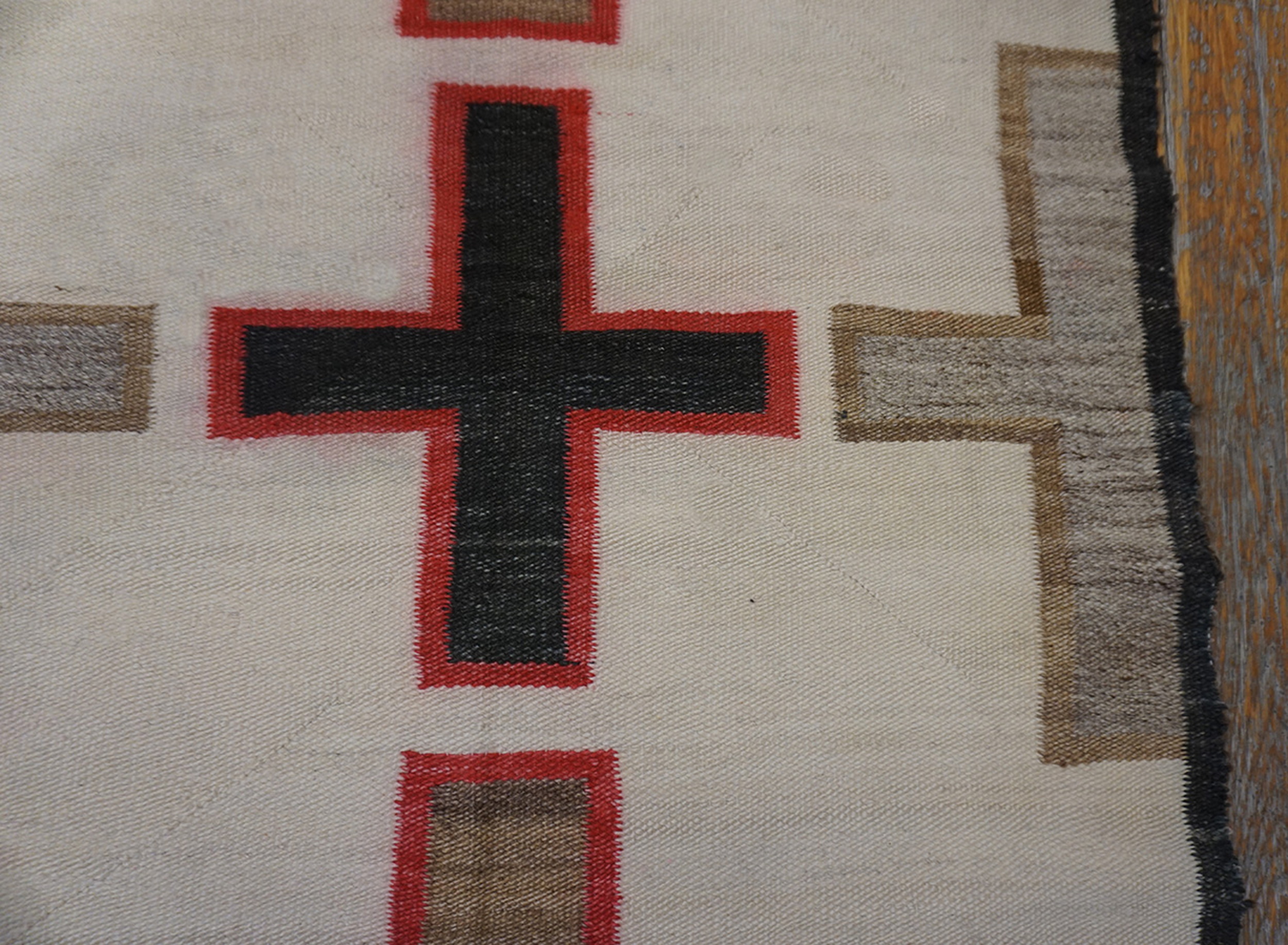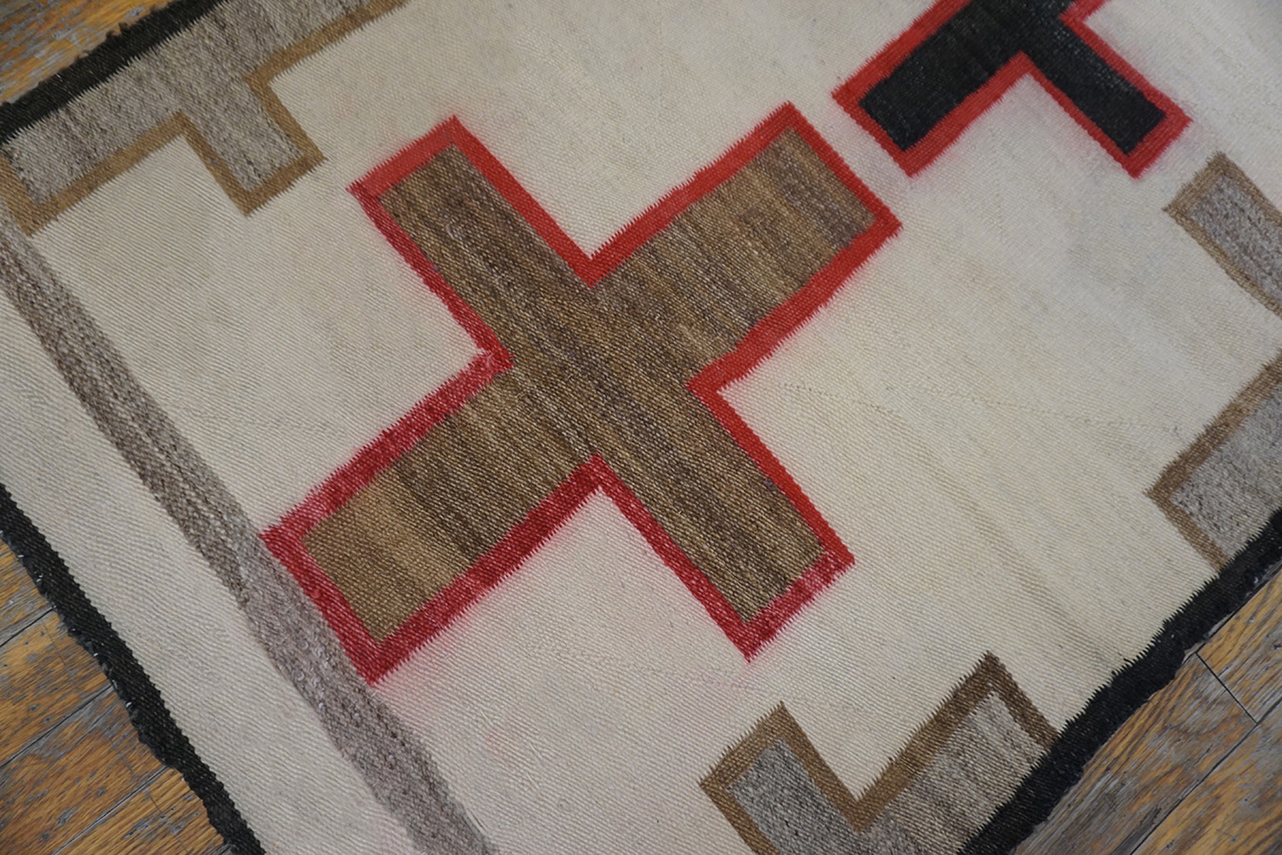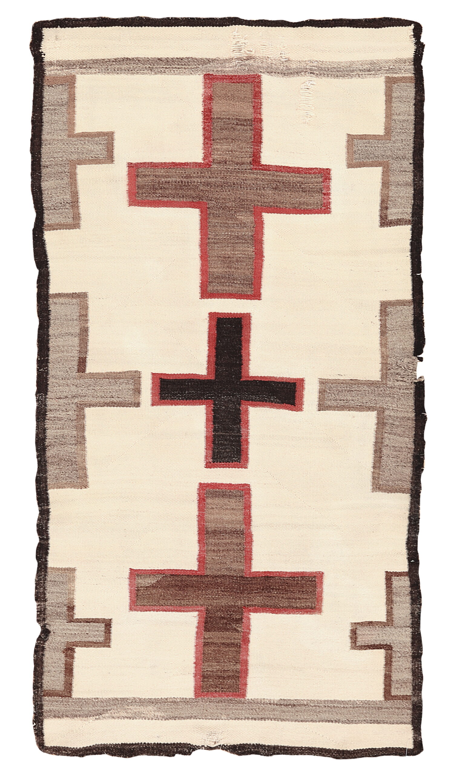 The powerful design features a series of repeating cruciform elements rendered in rich earth tones—moss green, deep black, and outlined in a vibrant cochineal-dyed magenta. While strongly axial, the repetition of these large, stylized symbols across the entire field creates a dynamic medallion design rug pattern, a hallmark of transitional period Navajo weaving.
