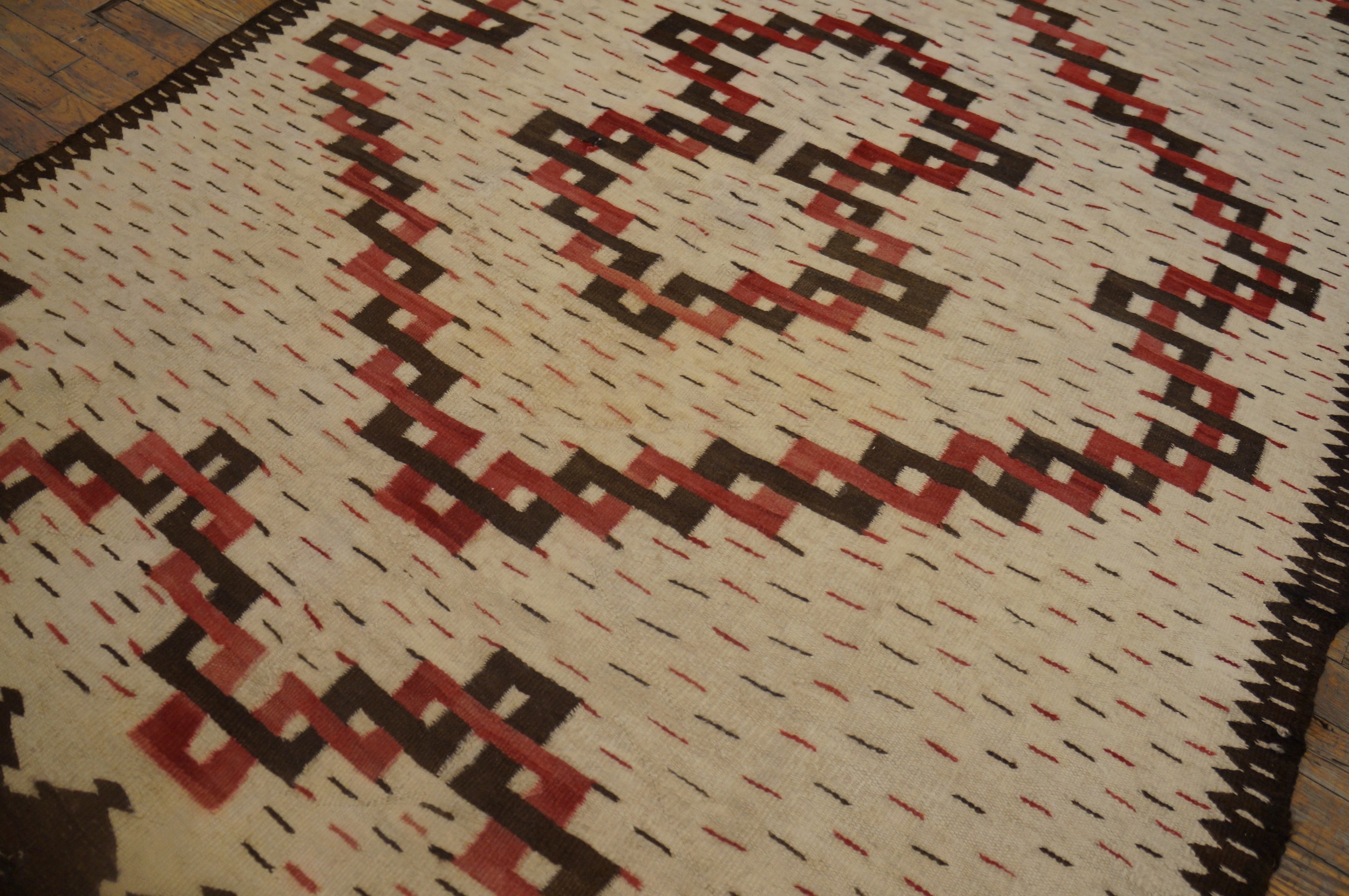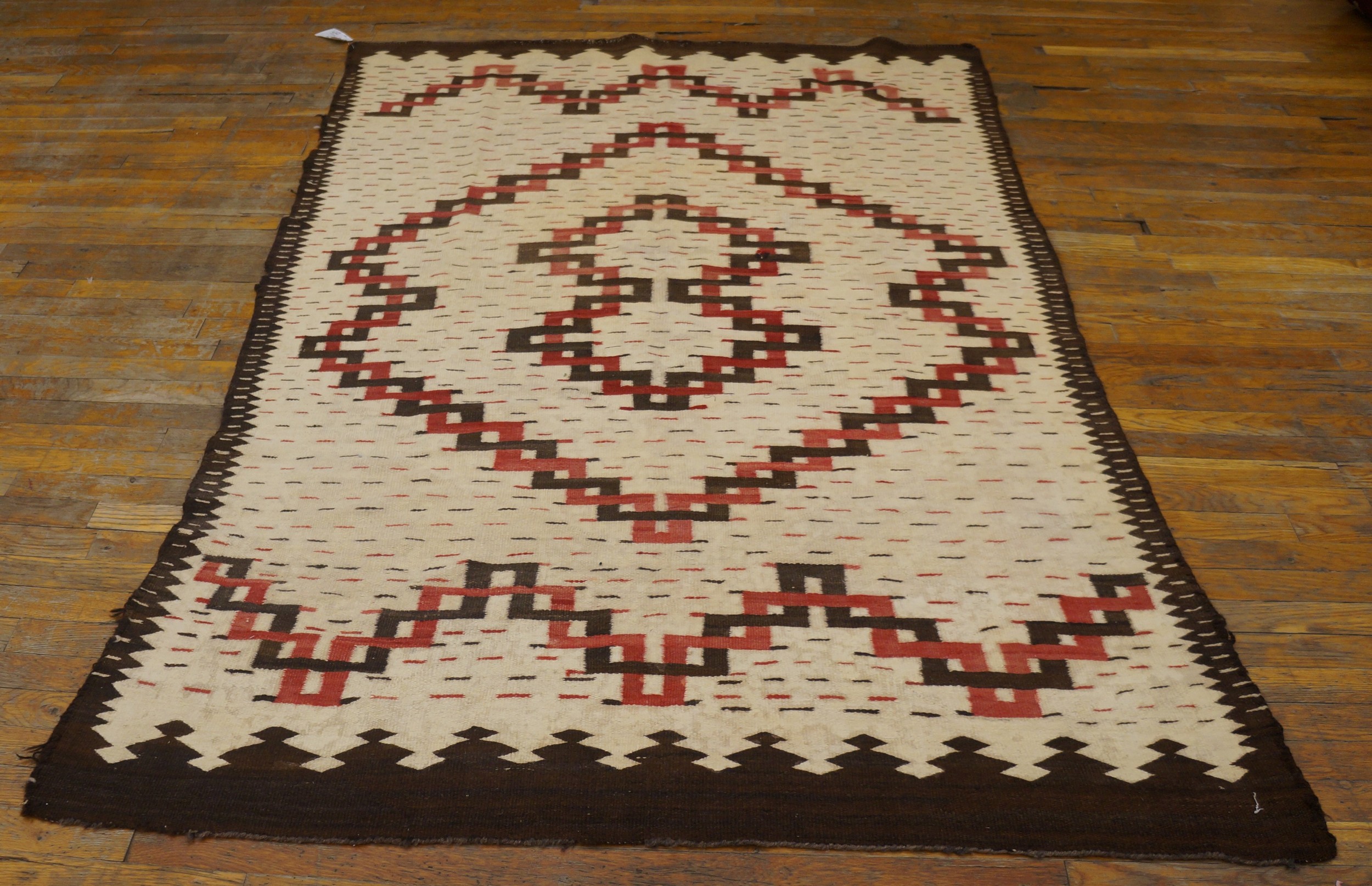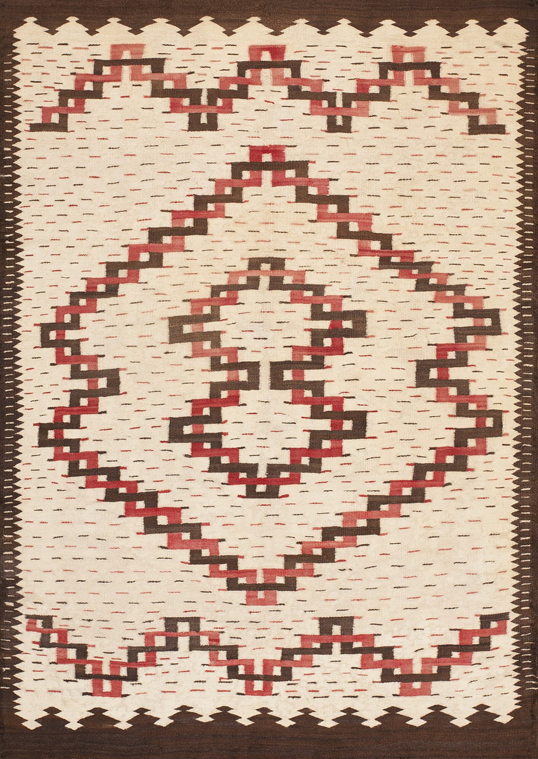 Dominating the center is a complex, stepped lozenge motif, executed in alternating bands of deep chocolate and faded brick red. This powerful geometric structure utilizes sharp serrated edges and interlocking lines, a hallmark of traditional Navajo design philosophy that speaks to balance and movement. The dark, serrated outer border frames the composition with precision.