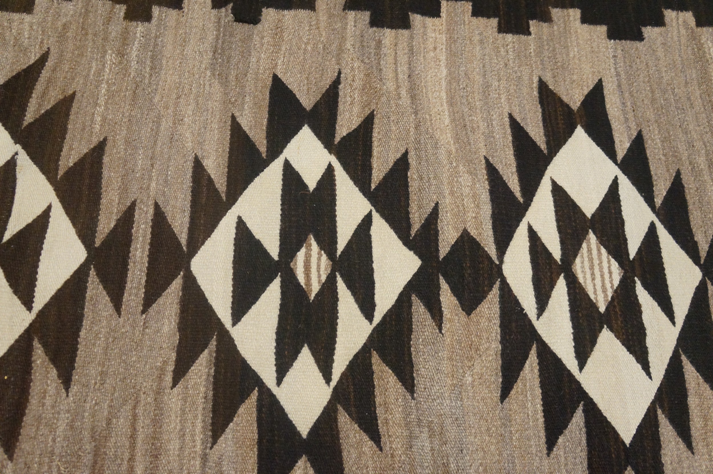 Centered within the field are three imposing, stacked diamond medallions, intricately constructed from interlocking triangles and stepped forms. The strong, serrated edges of these motifs are mirrored in the bold, stepped borders that frame the composition, demonstrating the weaver’s mastery of rectilinear design.