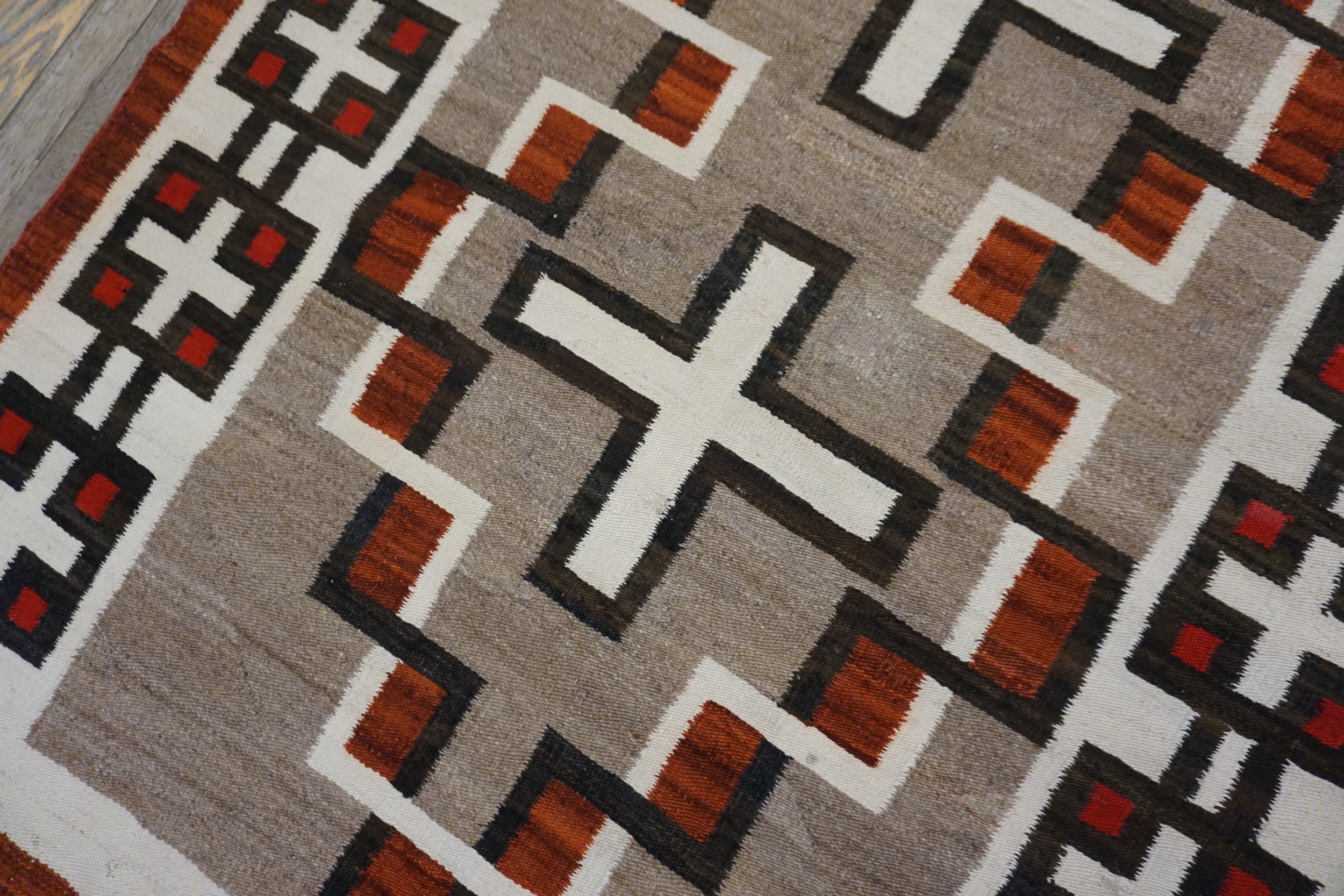 Antique Navajo Small Scatter Size Wool Gray, Red, White Rug, Circa Date: 1920s. This exceptional weaving represents the zenith of early 20th-century Native American textile art. Presented in a highly desirable small scatter size, its strong, graphic design is characteristic of the period when traditional Navajo motifs were being refined into powerful, marketable compositions.