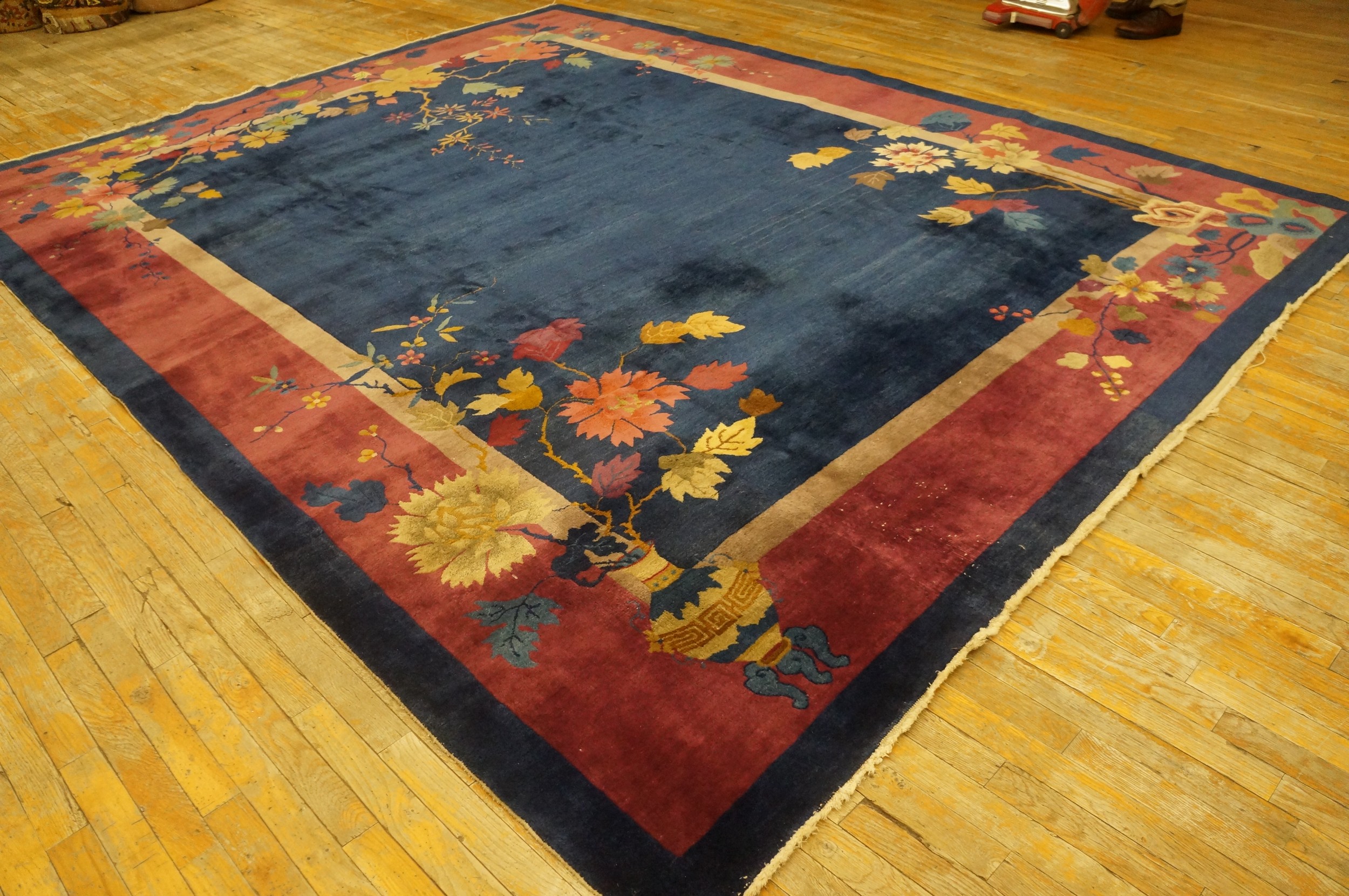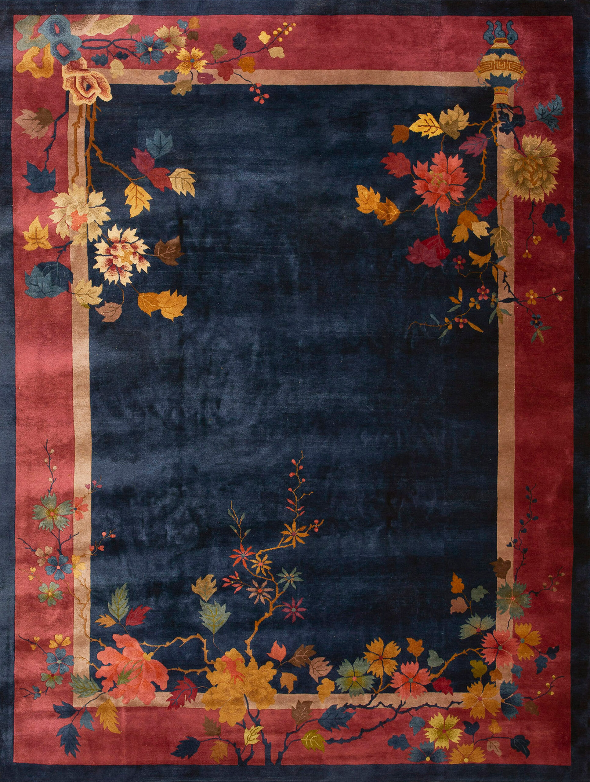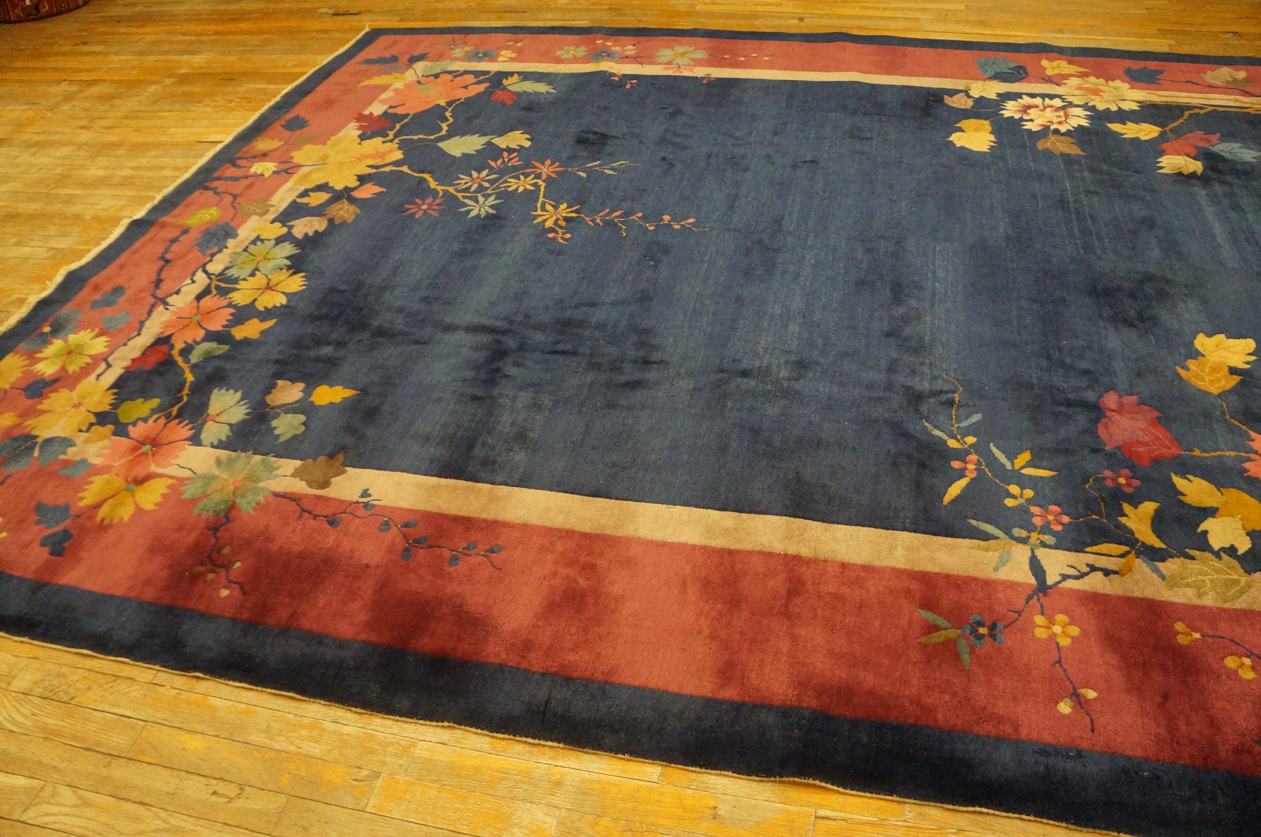 Woven with a luxurious, thick pile typical of the finest Chinese production of the period, this textile offers both visual depth and tactile richness. Its generous dimensions make it an ideal room size rug, capable of anchoring a sophisticated living space or formal dining area with historical elegance and enduring style.