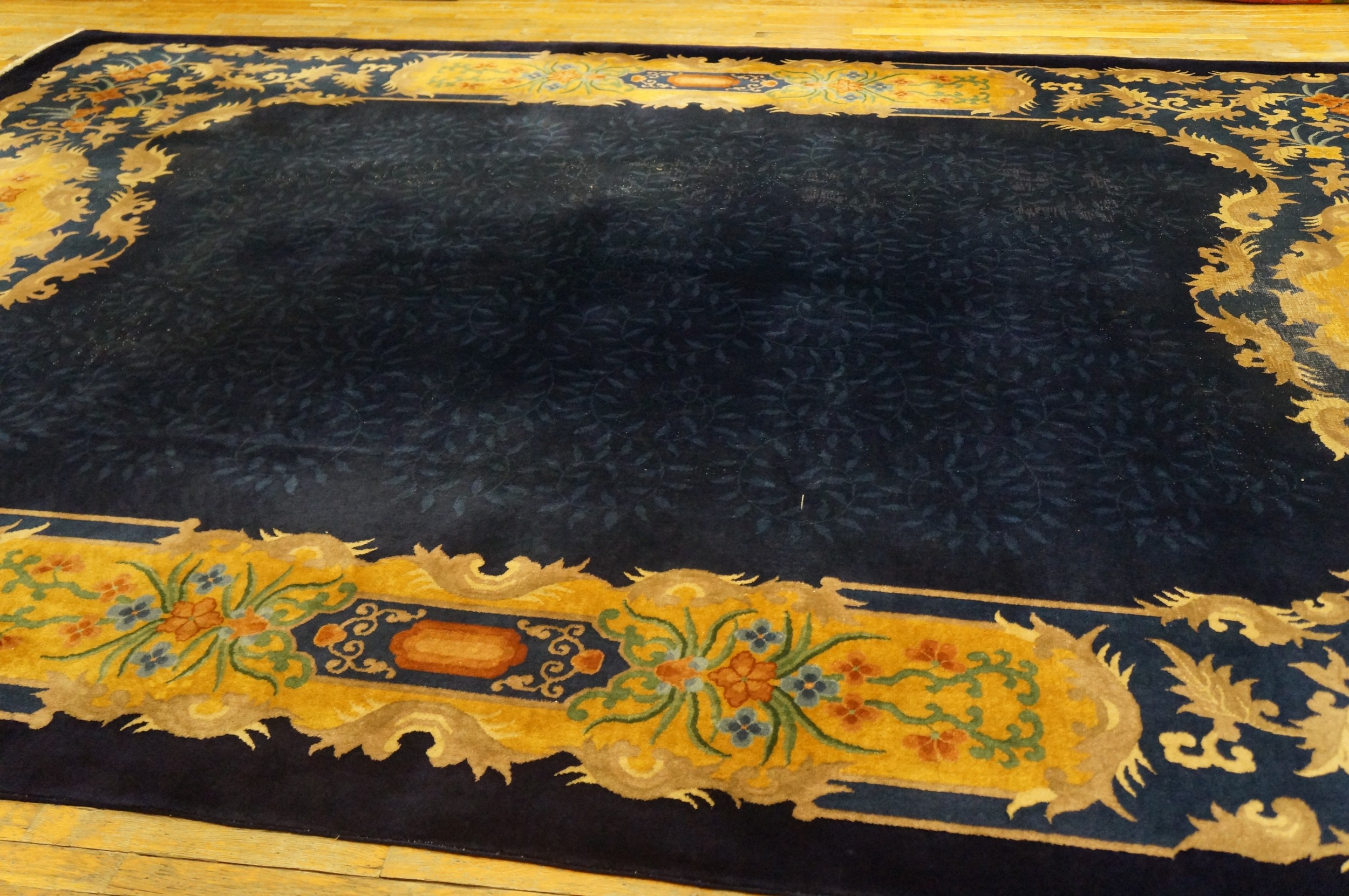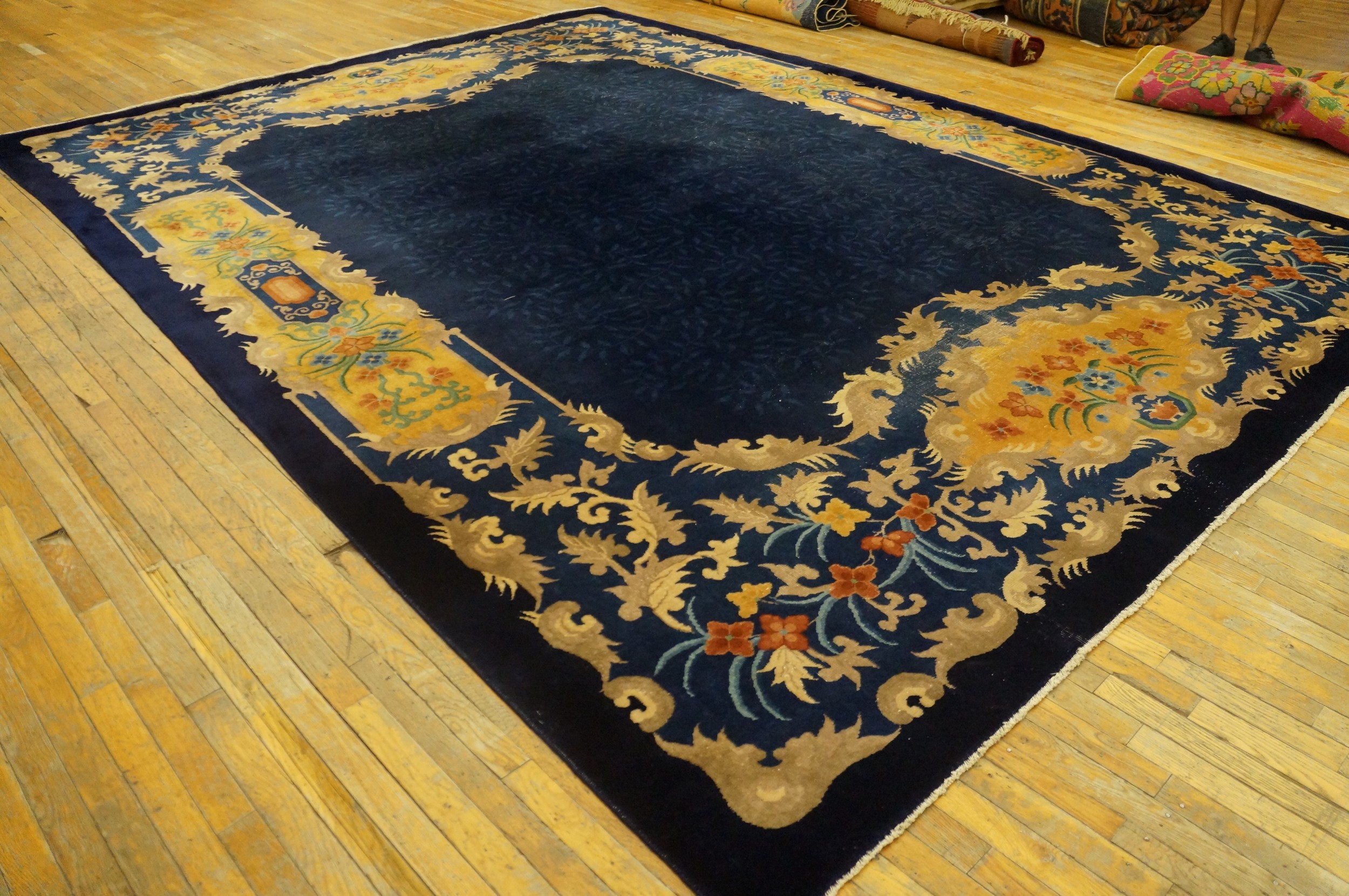 Antique Art Deco Chinese Allover Floral Blue 1920s Rug, Circa Date: 1920s. This exceptional antique rug exemplifies the stylistic fusion popular in early 20th-century Chinese weaving, combining traditional motifs with the bold, streamlined aesthetic of Art Deco. The deep indigo field provides a rich, saturated backdrop for the highly decorative border.