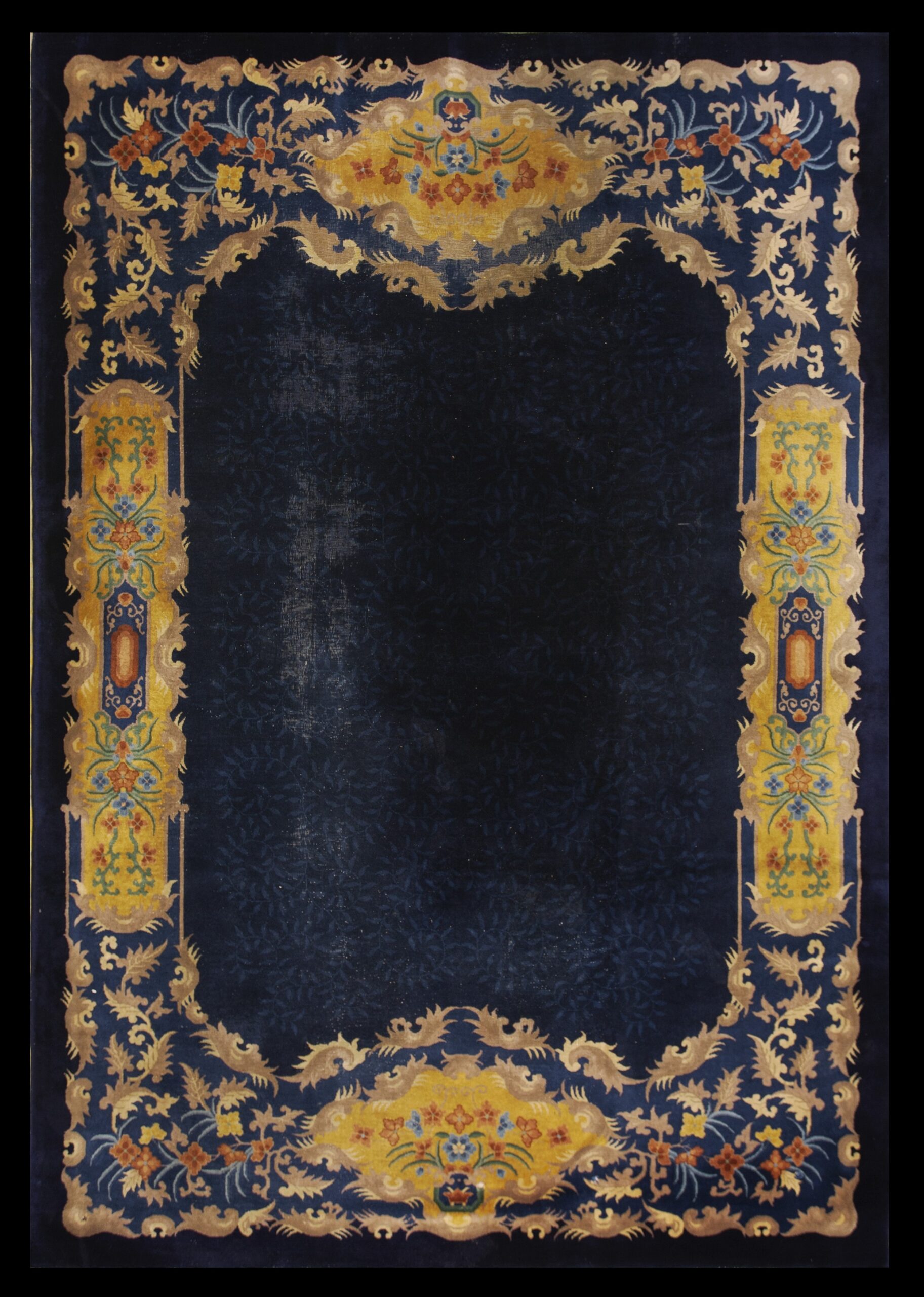 A striking border in contrasting golden yellow and ochre frames the composition, featuring highly stylized floral cartouches and scrolling foliage. The design is meticulously rendered, showcasing the technical proficiency of the Chinese weavers who adapted Western design sensibilities while maintaining their unique cultural signature.