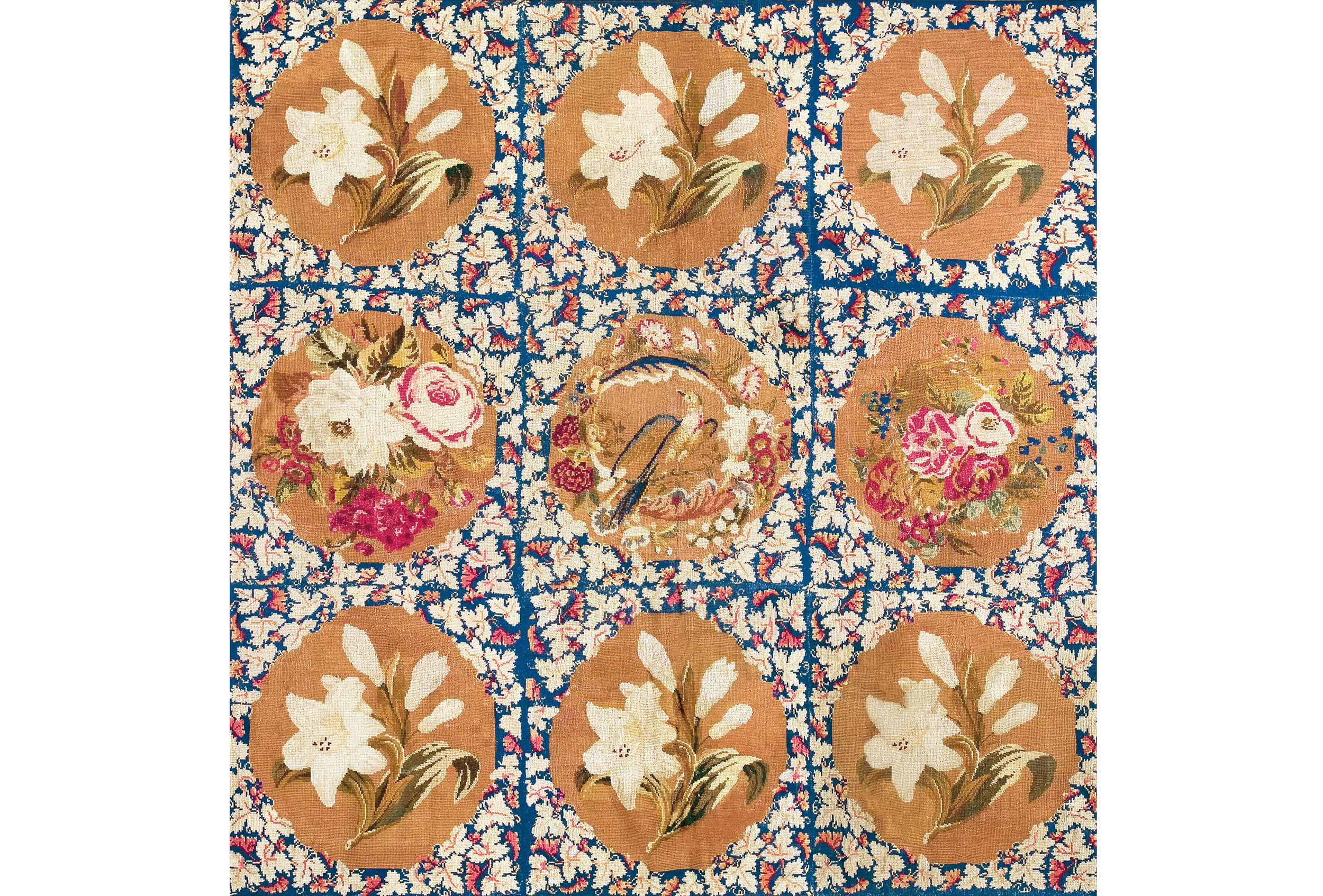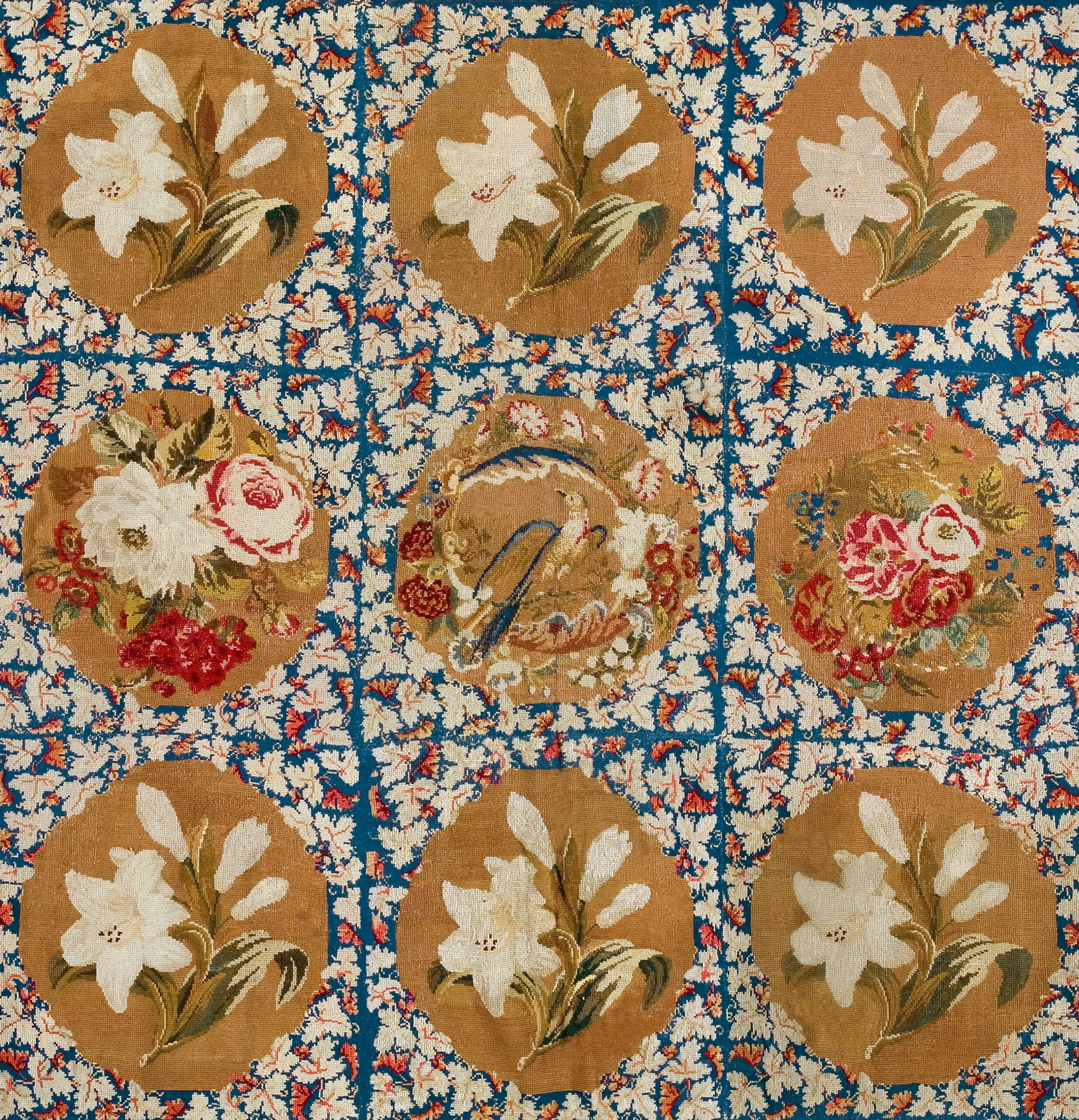 The structure utilizes a repeating grid format, creating an effective allover design that balances formality with naturalistic charm. Eight of the nine visible medallions feature large, lush sprays of white lilies and vibrant roses, while the central roundel uniquely depicts a small, finely detailed bird perched among foliage.
