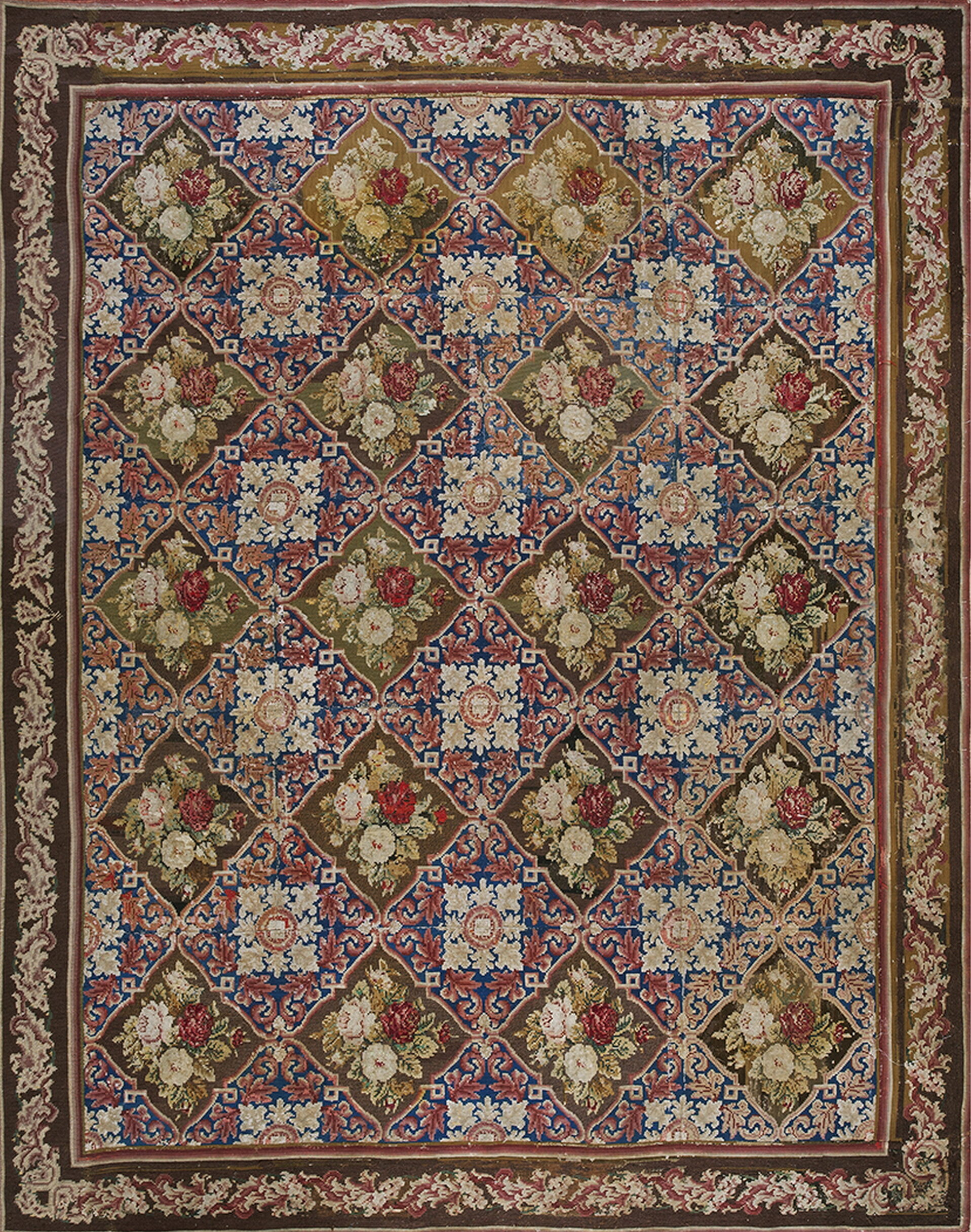 The design employs a classic lattice framework, creating diamond-shaped reserves that hold lush, naturalistic bouquets of roses and foliage. This repeating, non-directional composition is a superb example of an allover rug design, ensuring visual continuity across the entire surface area.
