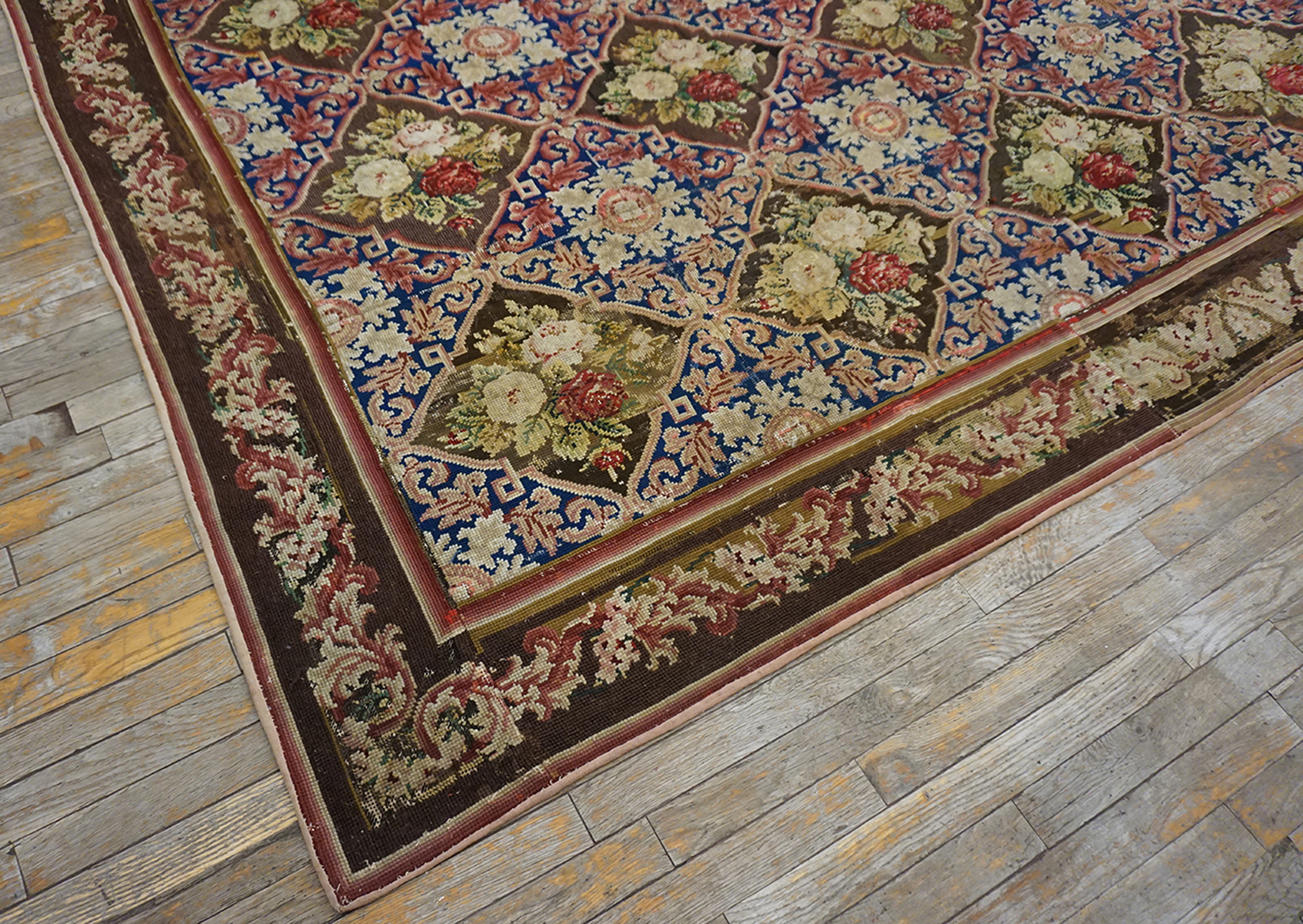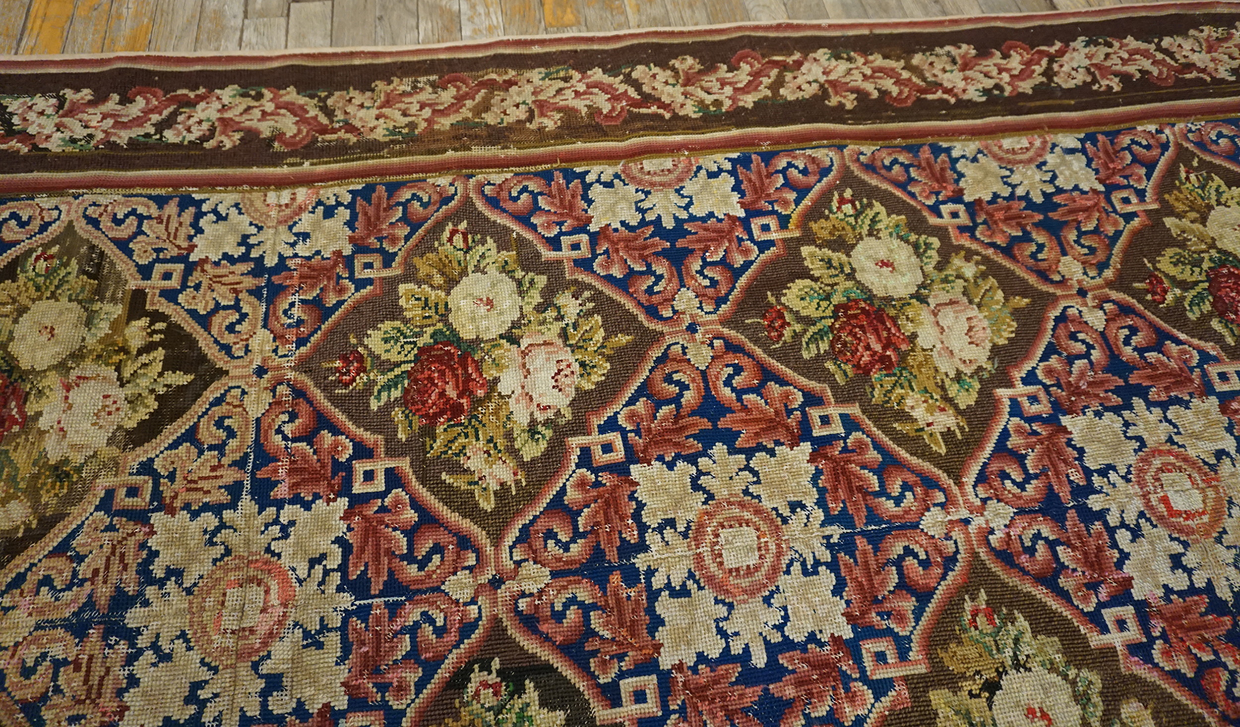 The remarkable condition and clarity of the colors, especially given its age, speak to its careful preservation over the last 150 years. This piece represents a desirable intersection of European textile artistry and historical provenance, making it a distinguished addition to any collection of fine antique rugs.