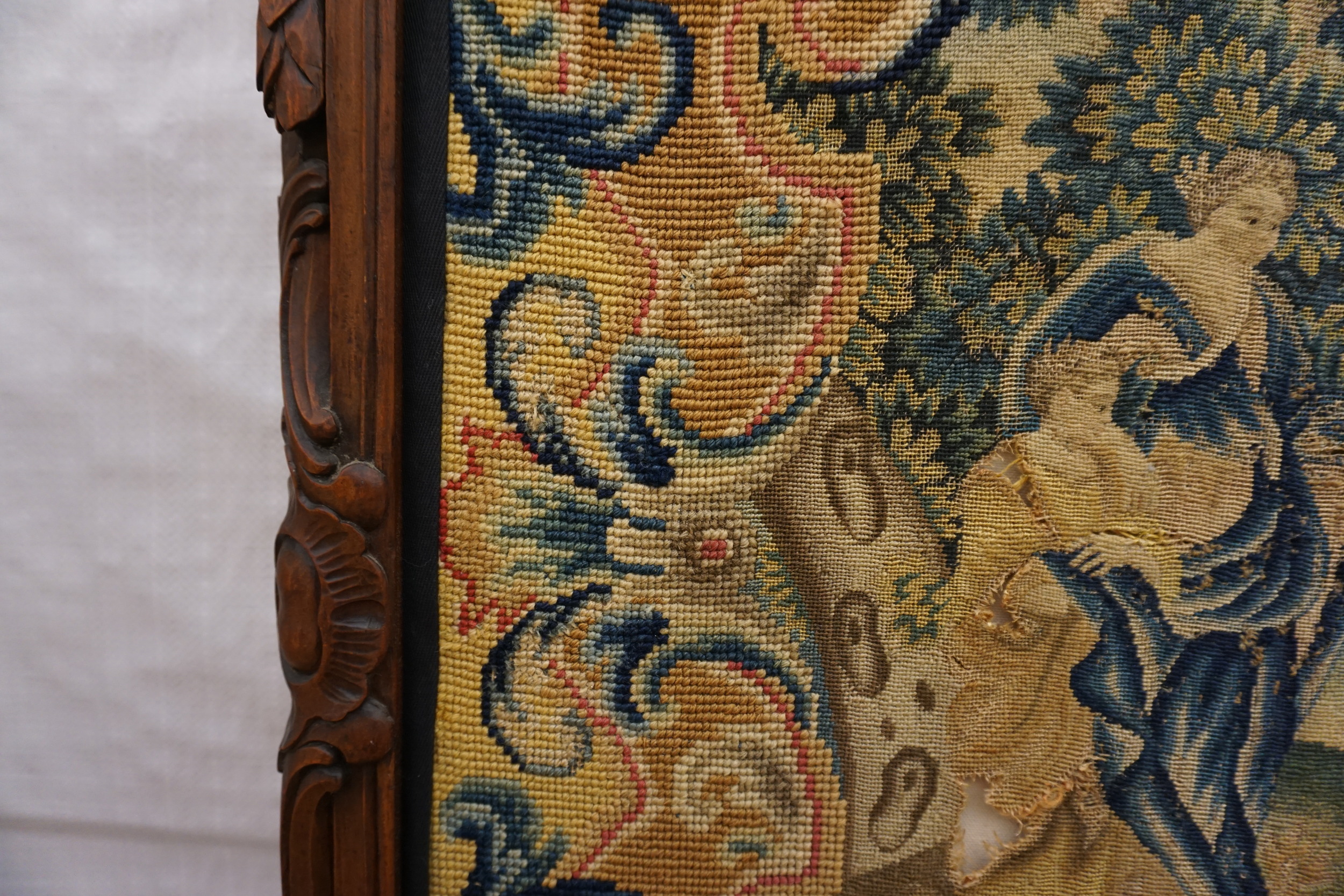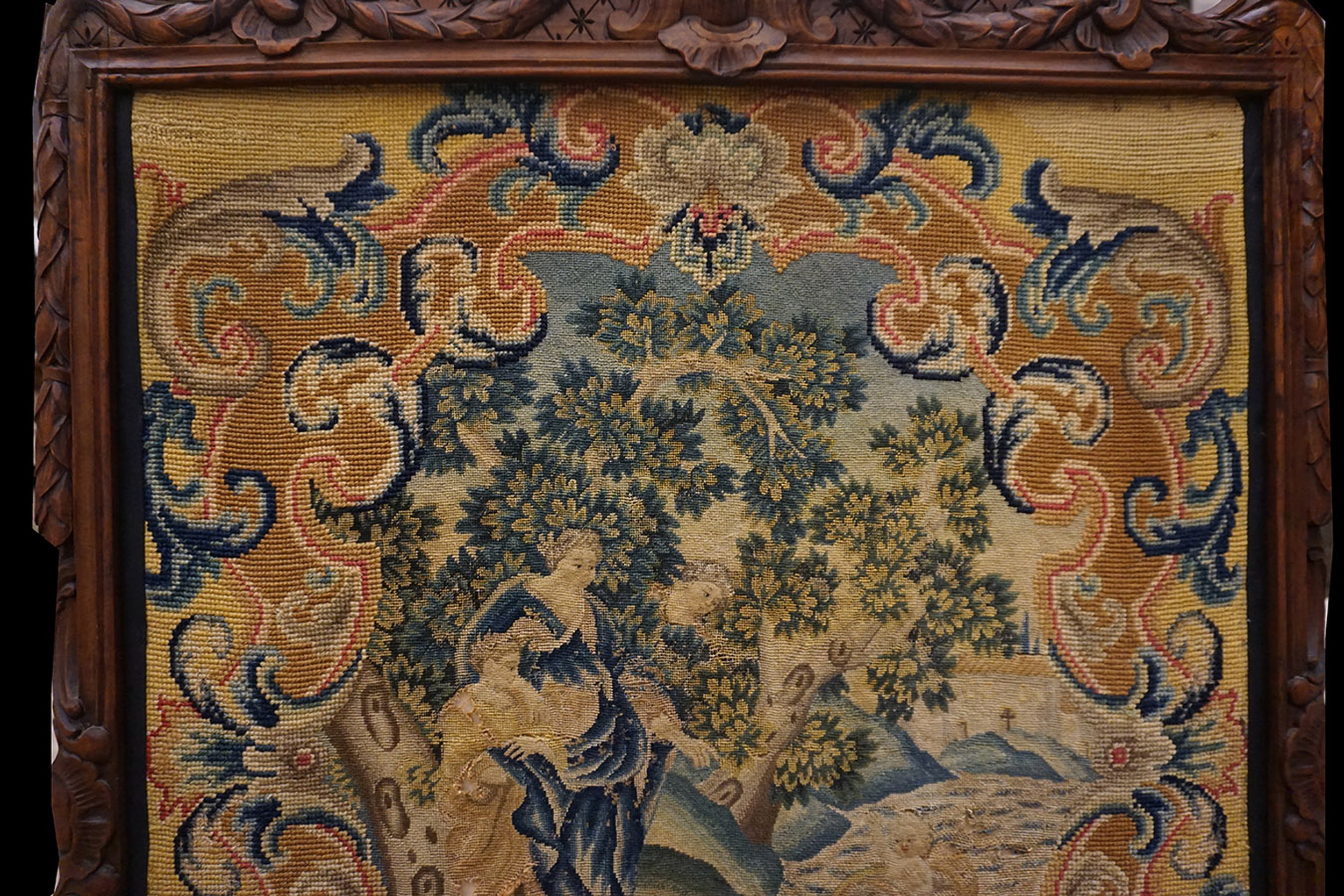 The central panel depicts a finely rendered pastoral scene, executed with meticulous petit point stitching, showcasing classical figures amidst lush foliage and flowing water. This detailed figurative work is framed by a highly decorative border utilizing scrolling acanthus and stylized floral cartouche elements, typical of high-style European design sensibilities.