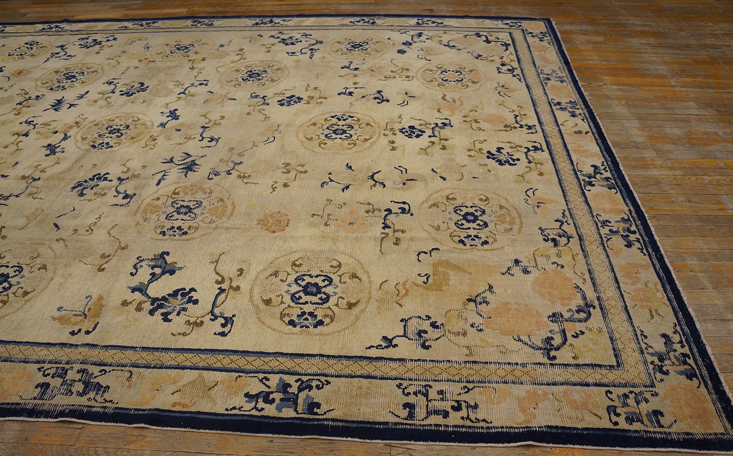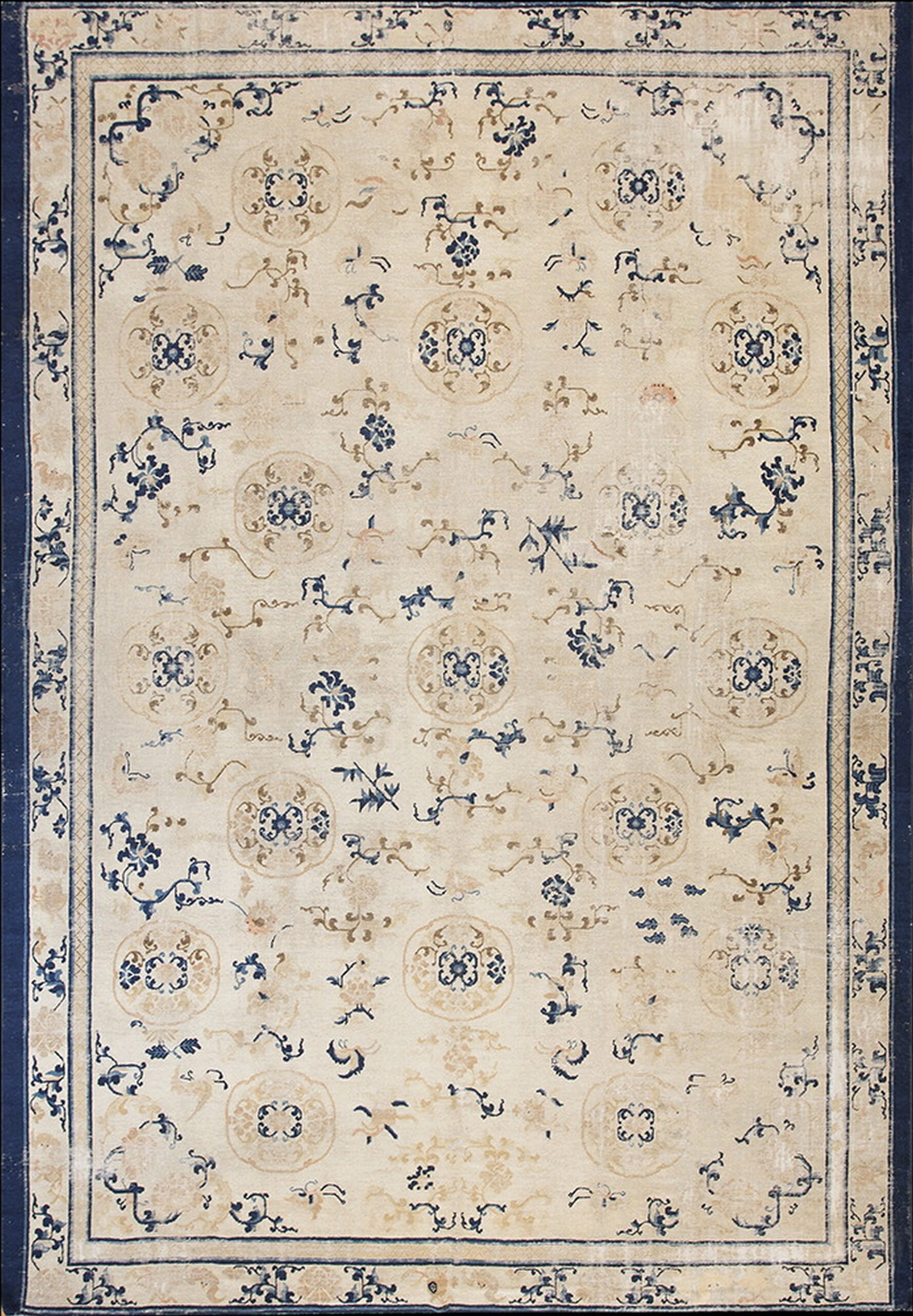 The field is dominated by a soft, aged ivory hue, placing it among the most desirable ivory color rugs in our collection. The use of a deep indigo blue in the main border and scattered throughout the central design creates a striking, yet balanced, contrast typical of high-quality Chinese production. This subtle palette ensures the rug integrates seamlessly into both classical and contemporary interiors.