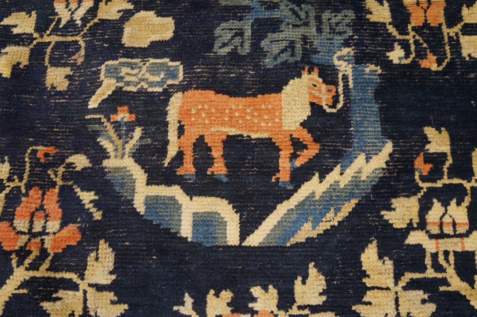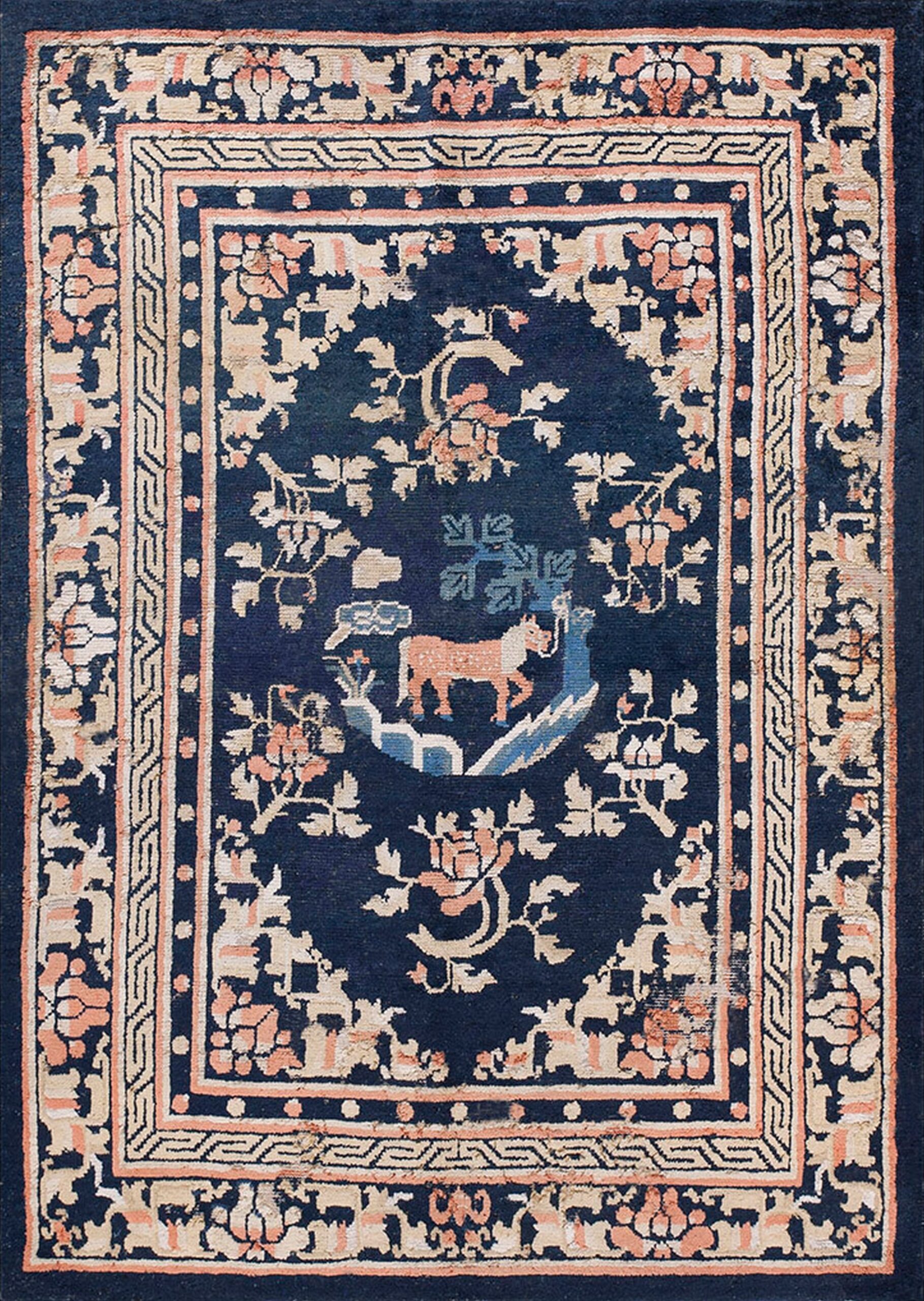 The field is dominated by a profound, saturated indigo, creating a dramatic backdrop for the stylized floral and animal motifs. This deep, resonant tone is highly prized among blue color rugs and provides a striking contrast to the secondary palette of soft salmon, peach, and ivory. The careful use of natural dyes ensures a subtle, shifting patina across the surface, enhancing the rug’s age and authenticity.