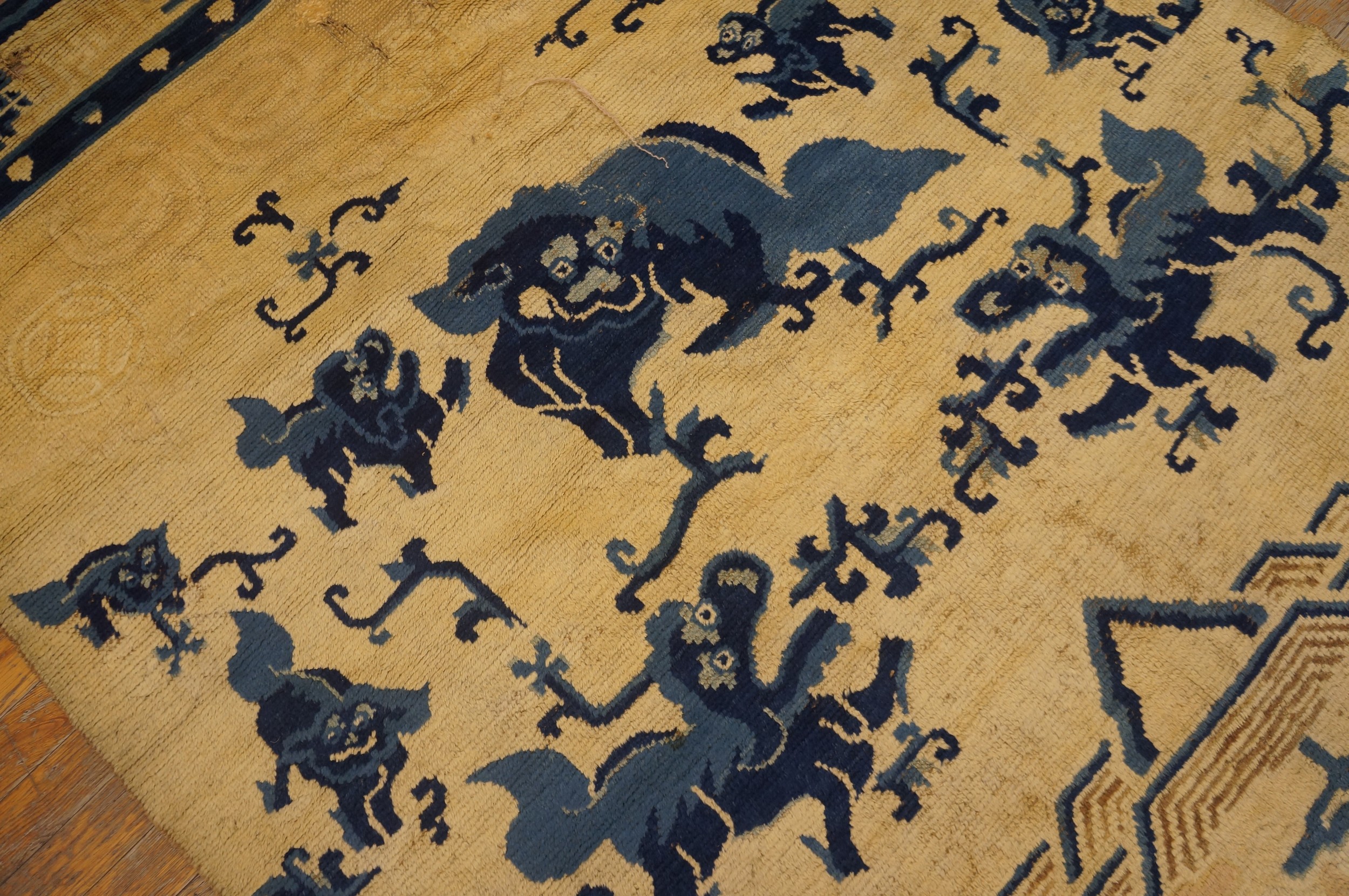 The field is populated by a playful, allover arrangement of stylized Fu Dogs or guardian lions, depicted in various poses of motion and repose. These mythical creatures are interspersed with traditional Chinese iconography, including stylized fungi and delicate cloud bands, which symbolize good fortune and longevity, creating a narrative flow across the surface.