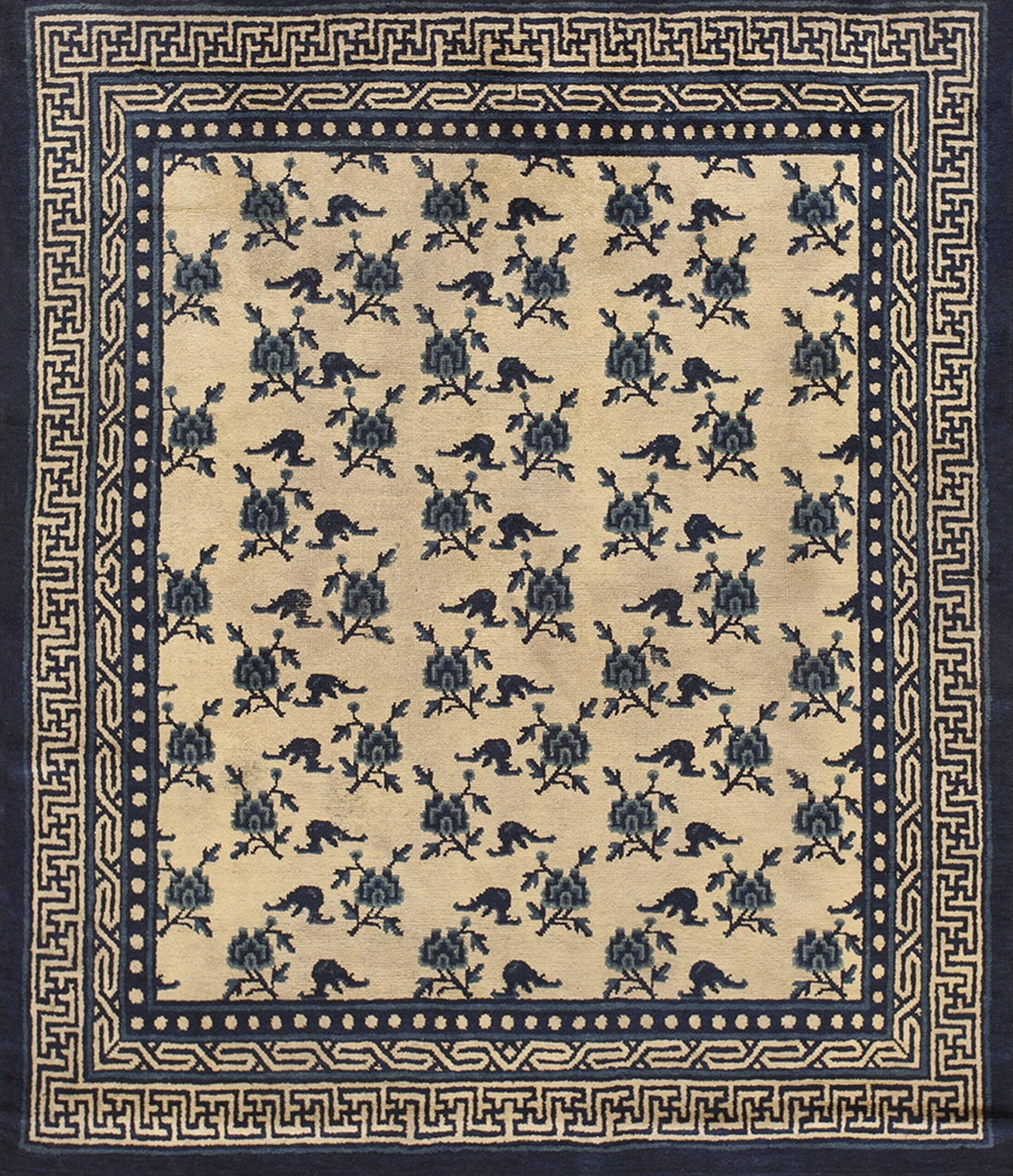 Antique Ningxia Chinese Geometric Beige 1850s Rug, Circa Date: 1850s. This exceptional example of 19th-century Chinese weaving captures the restrained elegance typical of the Ningxia region. The field is dominated by a warm, luminous beige ground, providing a perfect contrast to the deep indigo used in the primary motifs. We specialize in sourcing the finest examples of antique rugs from this period.