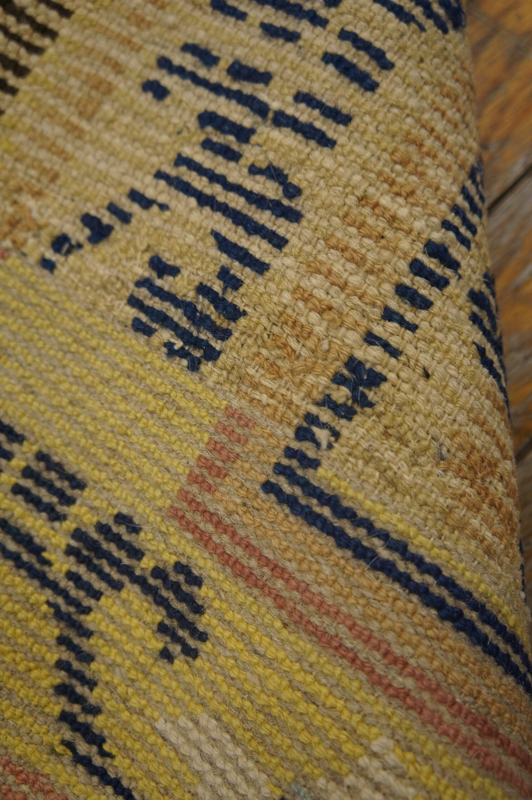 The palette is strikingly minimalist, relying primarily on a rich, saturated indigo blue set against a subtly variegated field of natural hues. This careful selection of colors emphasizes the clarity of the design, a hallmark of the best Qing Dynasty textiles. The aged patina of the field has developed a warm, honeyed tone, characteristic of fine ivory beige cream weavings.