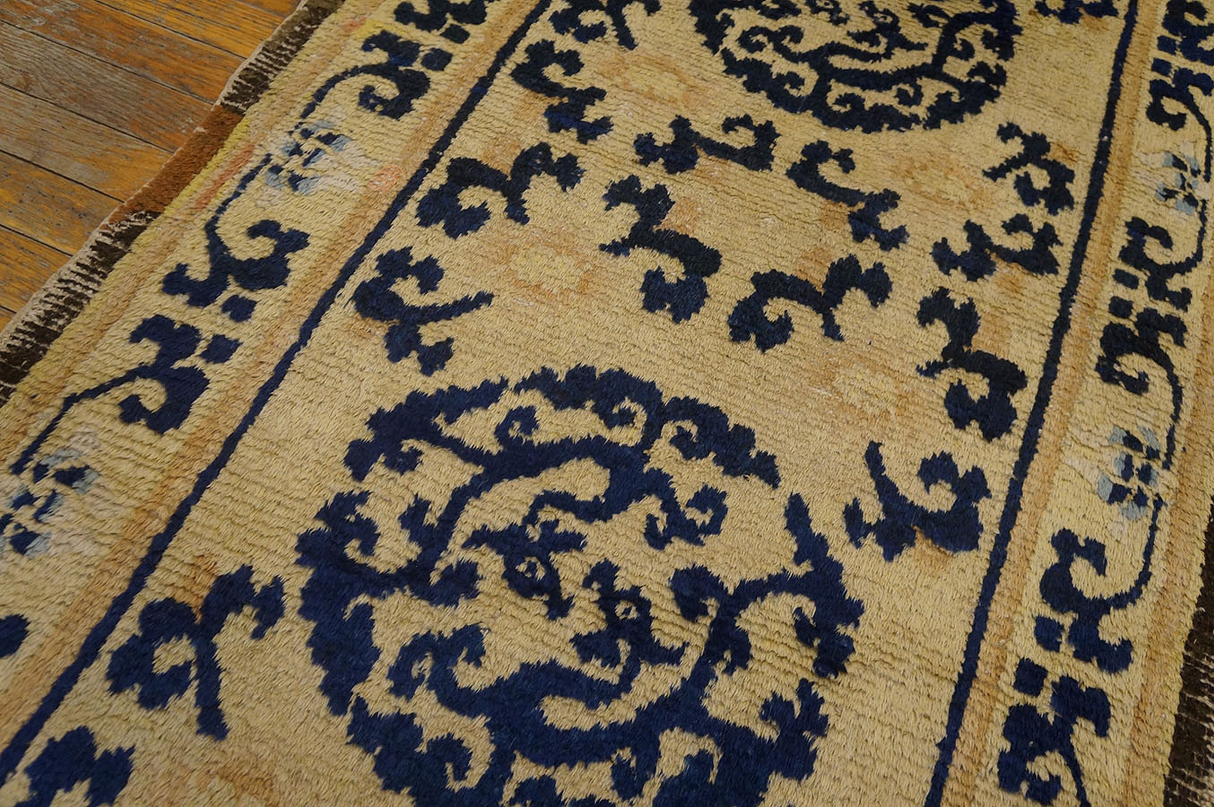 Antique Ningxia Chinese Medallion Beige 1775 Rug, Circa Date: 1775. This exquisite example of 18th-century weaving hails from the Ningxia region of China, renowned for its restrained elegance and sophisticated use of negative space. Its narrow format suggests it may have been used as a pillar rug or a highly decorative element, classifying it among desirable small scatter size rugs.